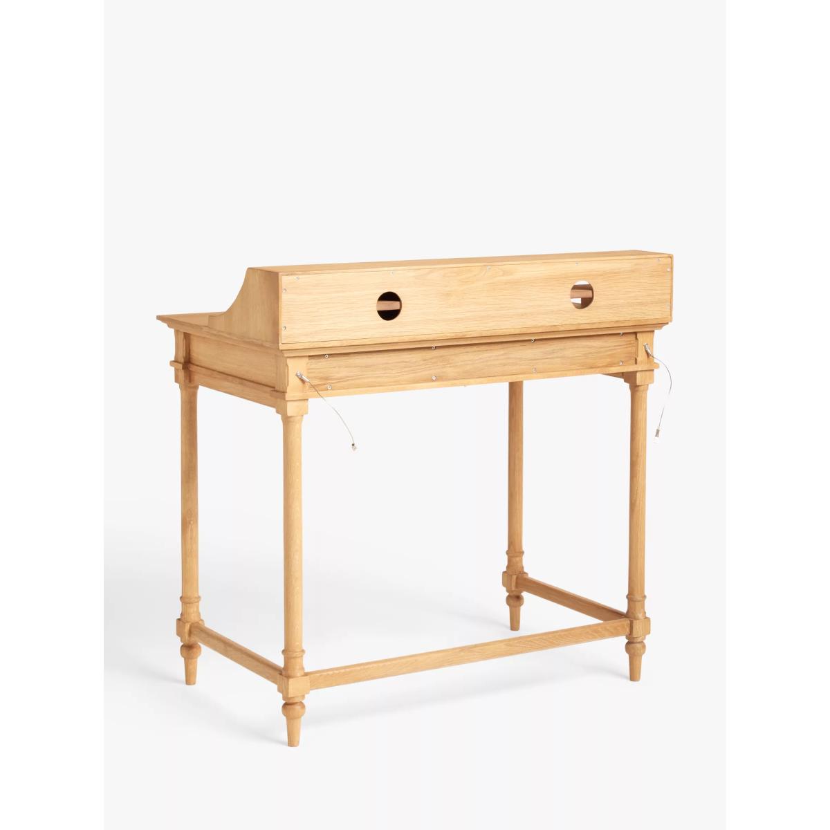 Made from light oak wood, this compact desk will be at home in your home office, living room, or even a corner of your bedroom where working space is tight. Details include turned legs, angled edges and chiselled detailing at each corner. Two holes at the back keep cords and cables tidy and there's also a full-width drawer and sliding storage cubby. Want to see it first? You may want to see and get a feel for the furniture in one of our shops before ordering. We'll be able to tell you where the range you'd like to view is on display.