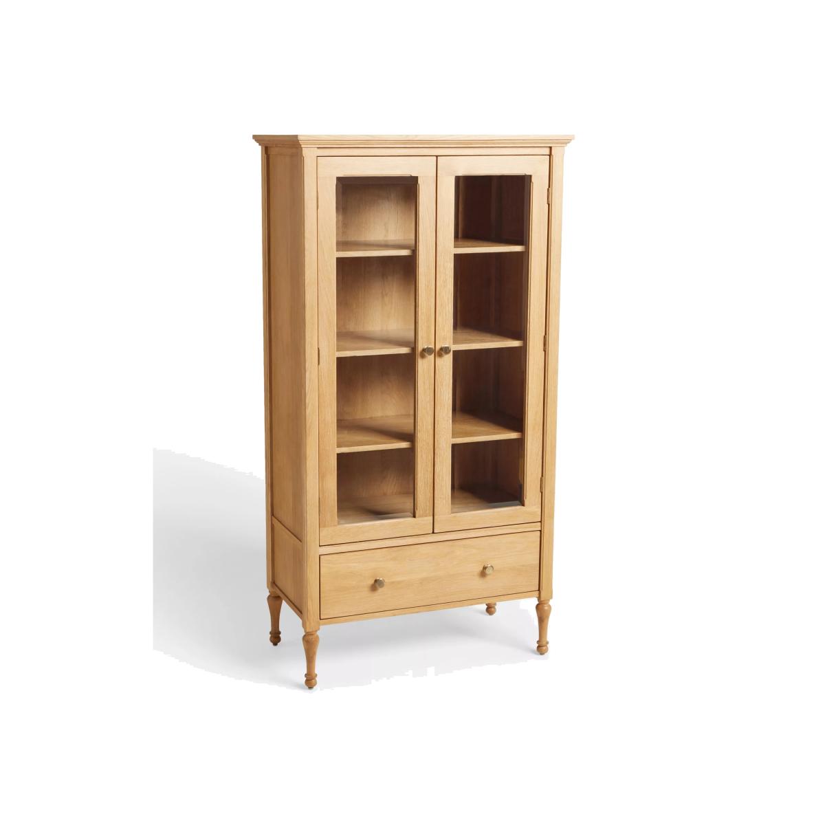 Made from light oak wood, the Clemence display cabinet features a corniced top, brass fittings and turned legs for a classic look that won't date. The 3 adjustable shelves let you display your favourite glassware and china behind the glass doors, while the bottom drawer lets you tidy placemats, napkins and other dining essentials neatly away. Want to see it first? You may want to see and get a feel for the furniture in one of our shops before ordering. We'll be able to tell you where the range you'd like to view is on display.