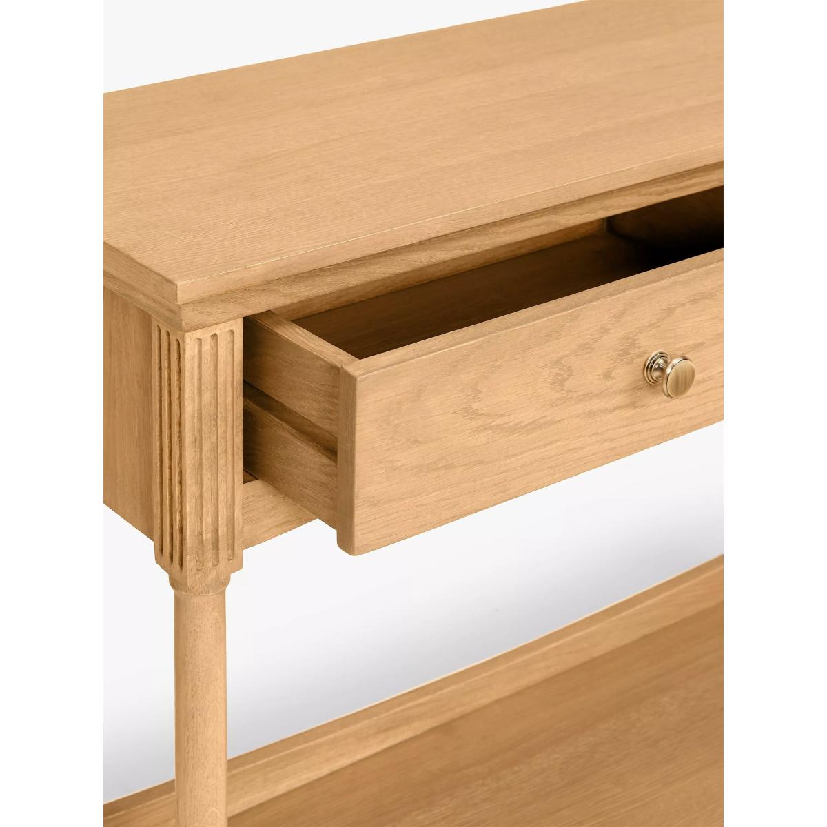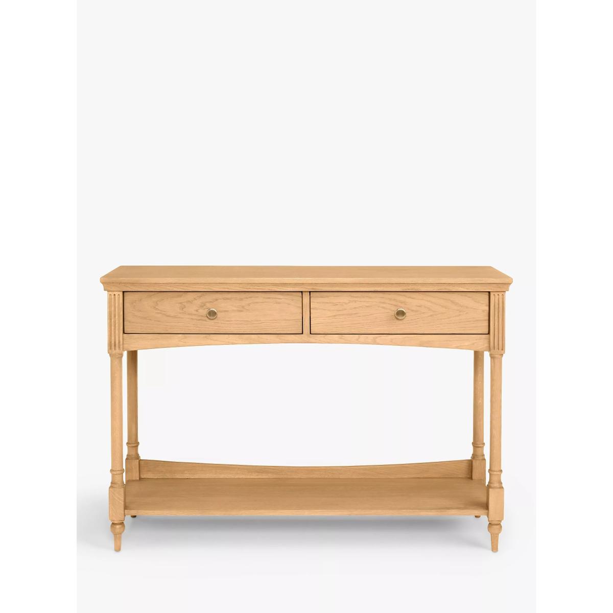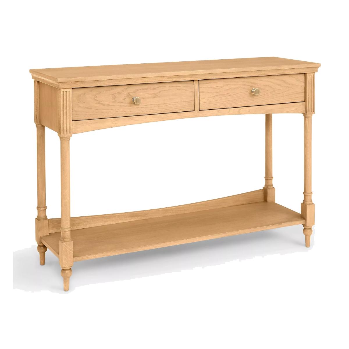 Made from light oak wood, this storage console table will be at home in your living room or dining room providing a place for displaying your favourite trinkets, an elegant candelabra or a vase of flowers. Details include turned legs, angled edges and chiselled detailing below the top of the table, which also includes two drawers with brass knobs and a wide bottom shelf with an upright at the back to keep items from sliding off the back. Want to see it first? You may want to see and get a feel for the furniture in one of our shops before ordering. We'll be able to tell you where the range you'd like to view is on display.