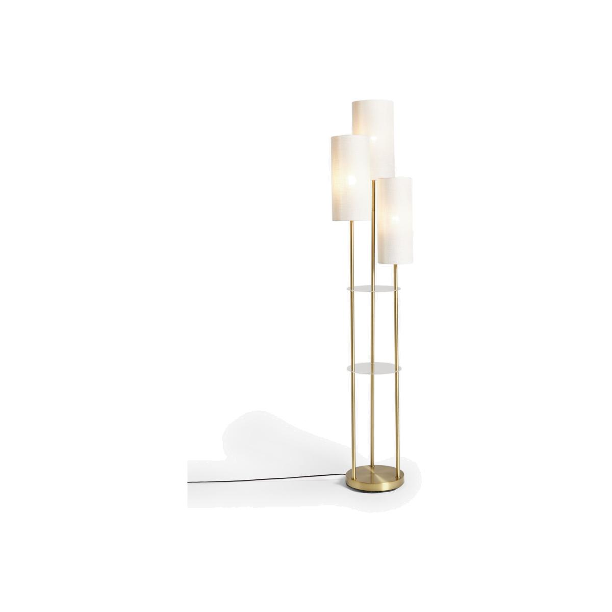 The Cluster Trio floor lamp provides plenty of light and offers extra storage to your space. Three brass poles secured in a round base, each with a white linen cylindrical shade. The poles also support two clear acrylic shelves for display or storage purposes. Finished with a foot switch on a black cord.