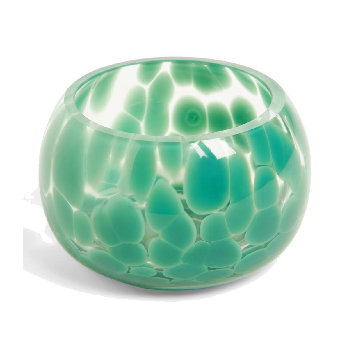 A contemporary glass tealight holder in an abstract, confetti style.