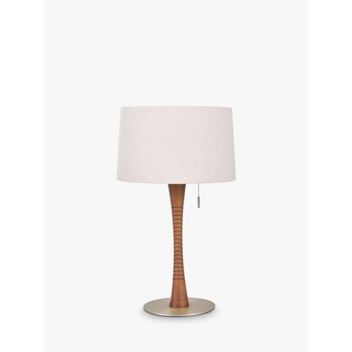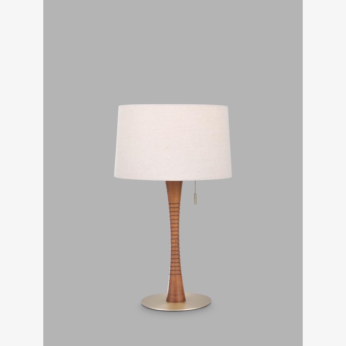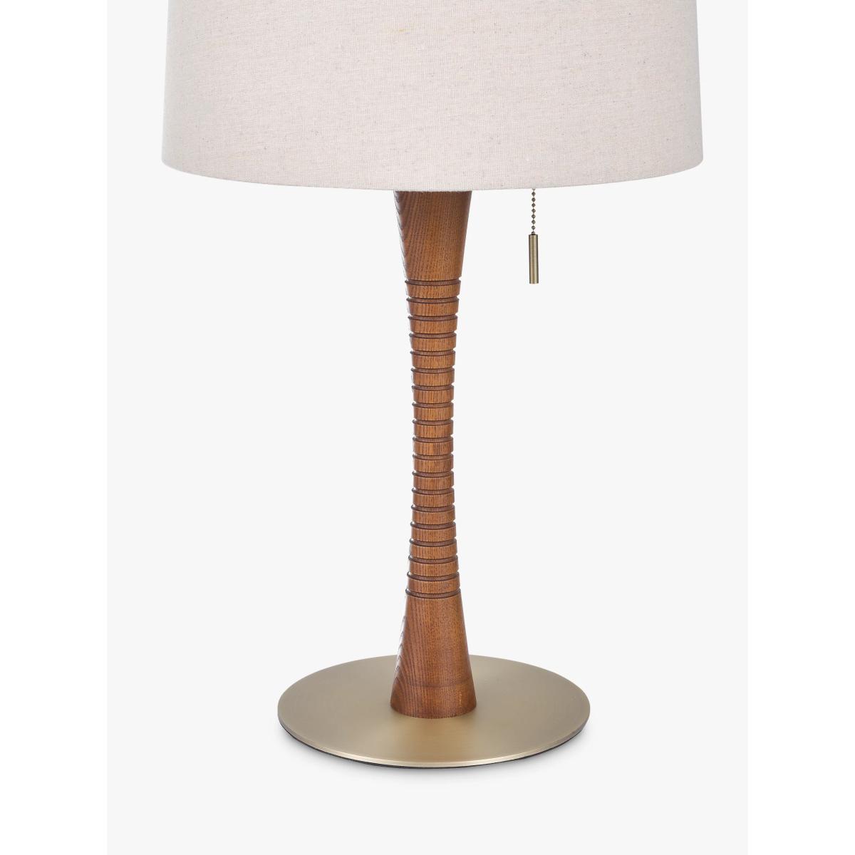 The Contour table lamp looks fabulous with its mid-century styling and intricate detailed rib stem. Finished in matte antique brass with a walnut stain and an oatmeal linen shade, the Contour makes it easy to add a luxurious feel to any room in the home.