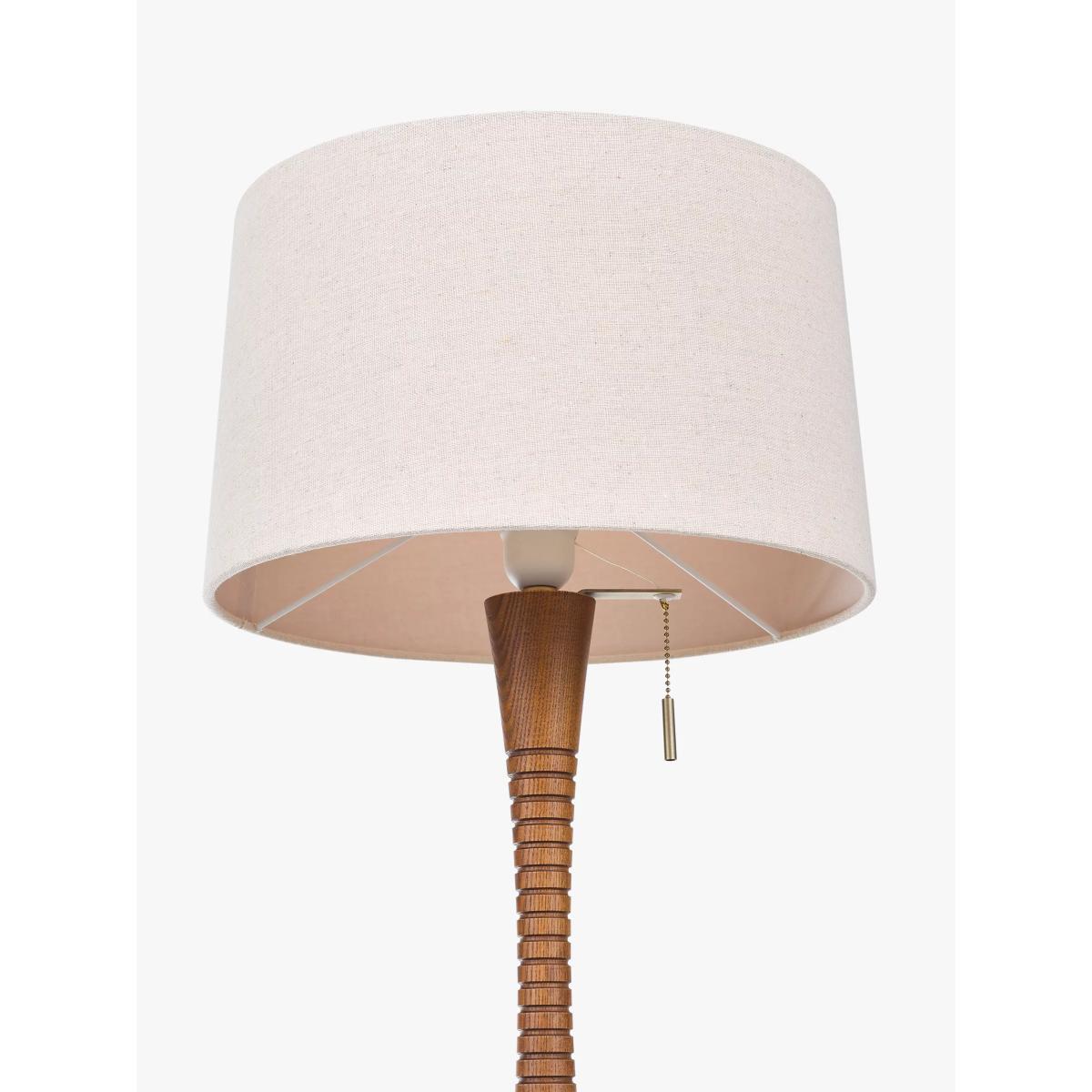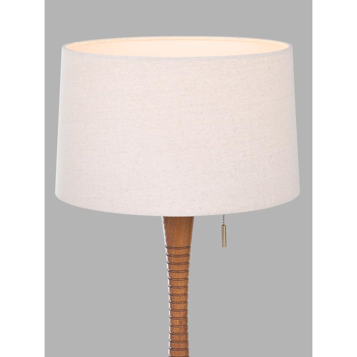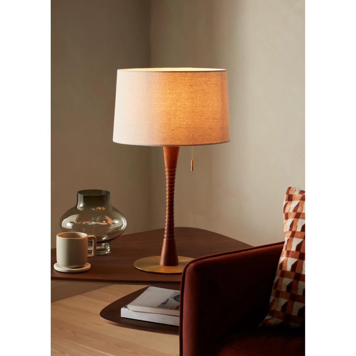 The Contour table lamp looks fabulous with its mid-century styling and intricate detailed rib stem. Finished in matte antique brass with a walnut stain and an oatmeal linen shade, the Contour makes it easy to add a luxurious feel to any room in the home.