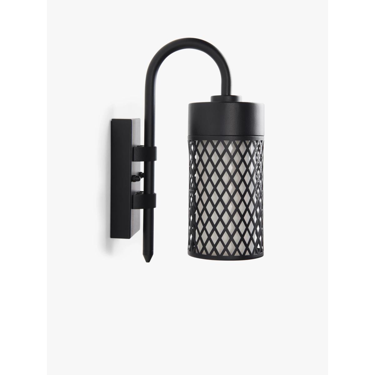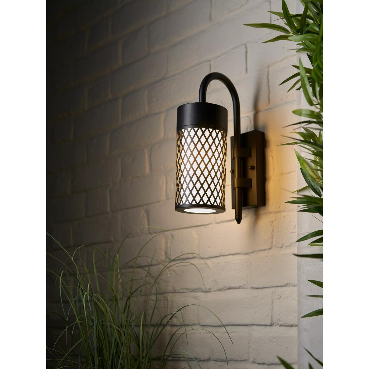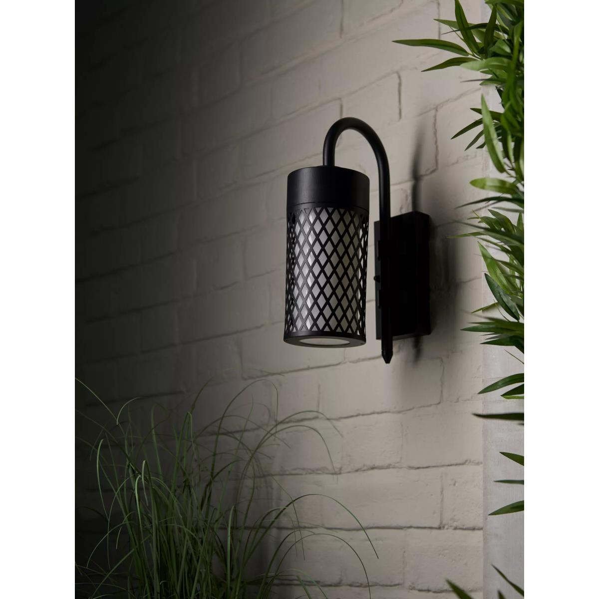 With its caged lantern-style design, this modern wall light is a great option for porches or pathways. IP44-rated and resistant to splashing water, the sealed glass shade offers a soft glow when lit. One LED bulb is required.