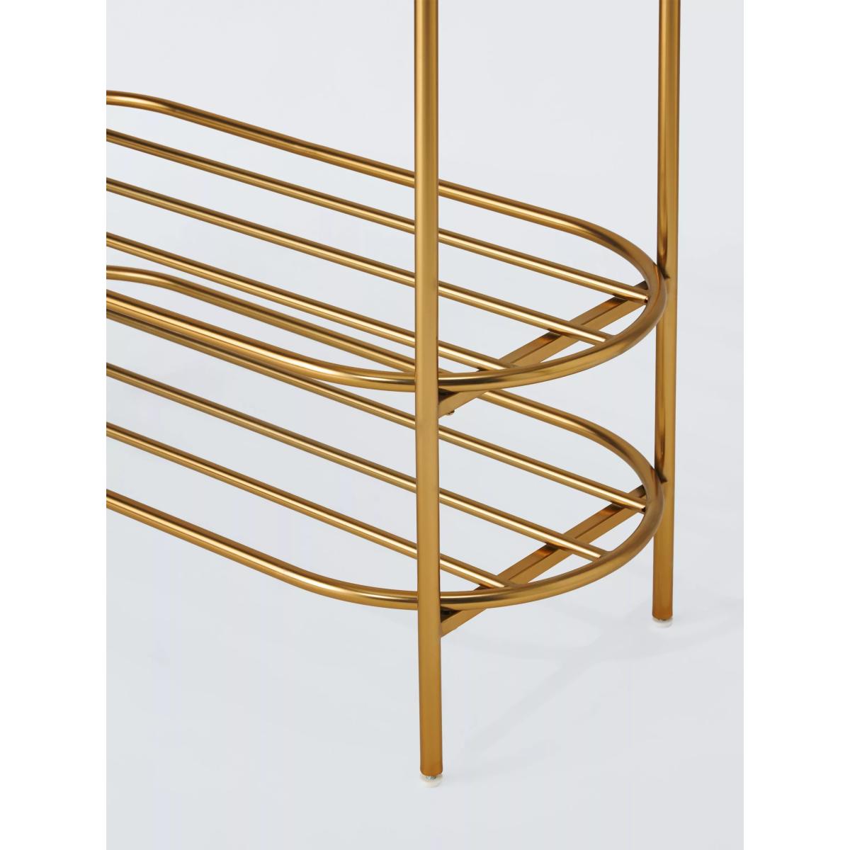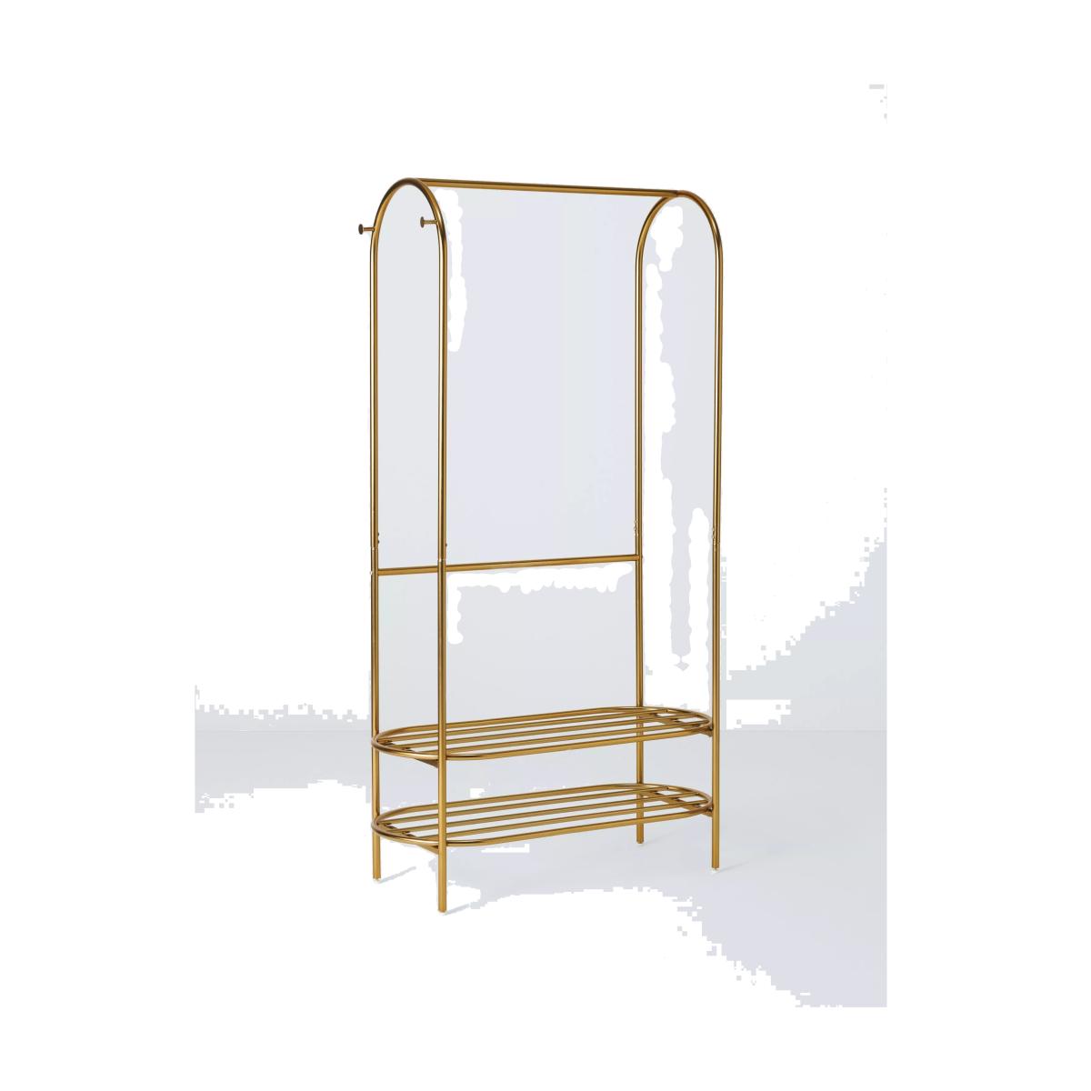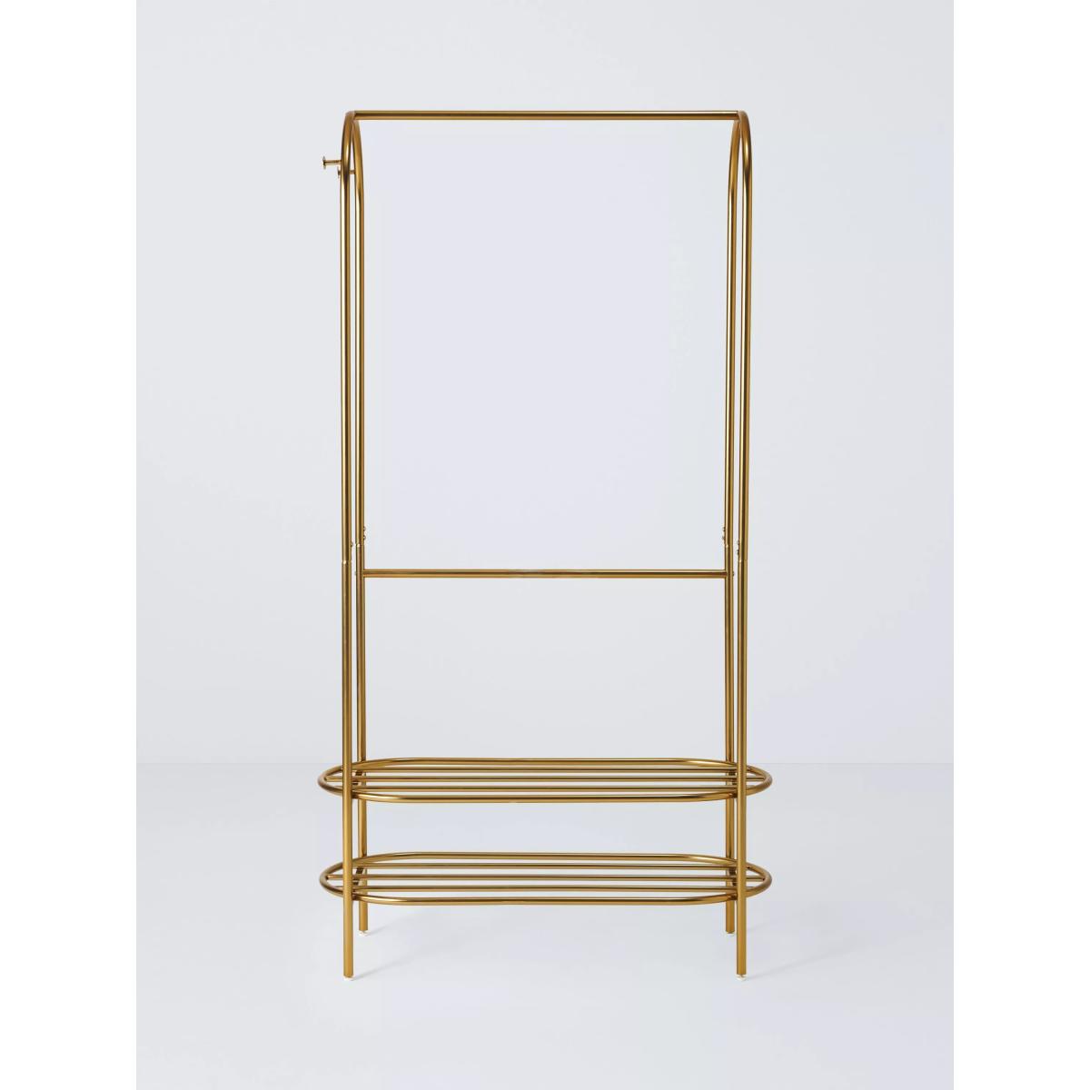 Raise your guest room game with this gold metal clothes rail. Delightfully curvy, it features two bottom racks for shoes, plenty of hanging space and two metal knobs for hanging scarves, hats or bags.