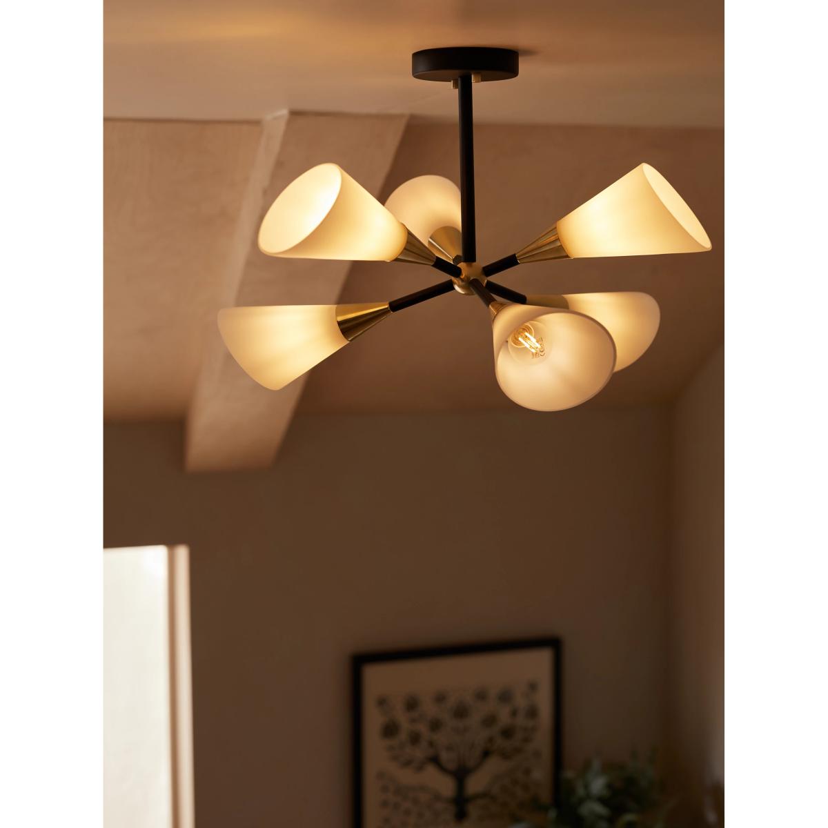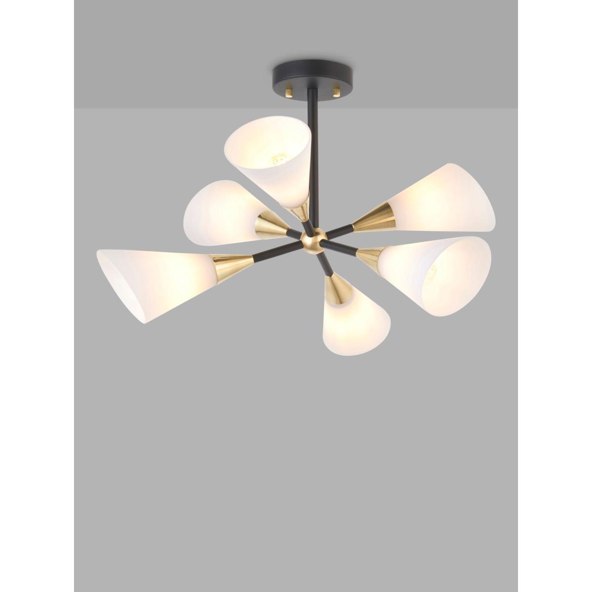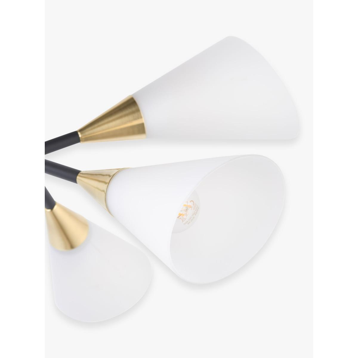 A fantastic nod to mid-century with this striking ceiling light. The bold black frame with brass plated details and the matt, opal white cone-shaped, glass shades offer a modern look which will really create an impact in any living space.