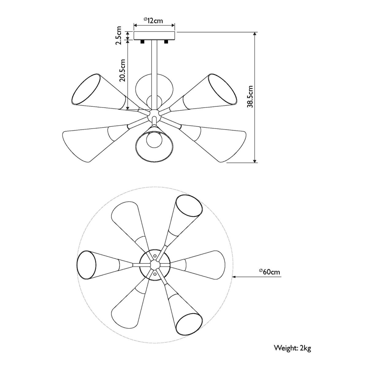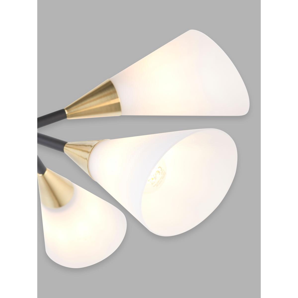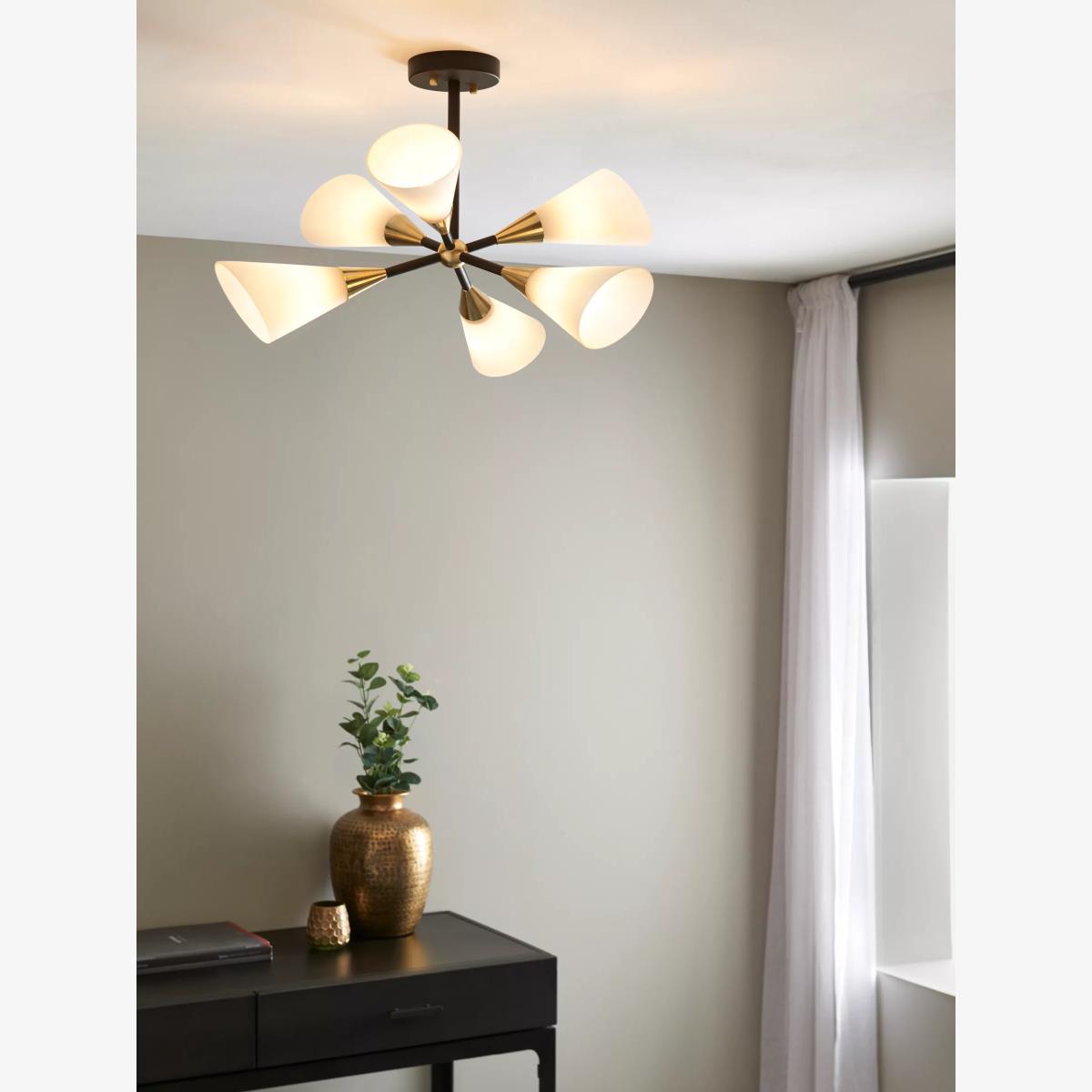 A fantastic nod to mid-century with this striking ceiling light. The bold black frame with brass plated details and the matt, opal white cone-shaped, glass shades offer a modern look which will really create an impact in any living space.