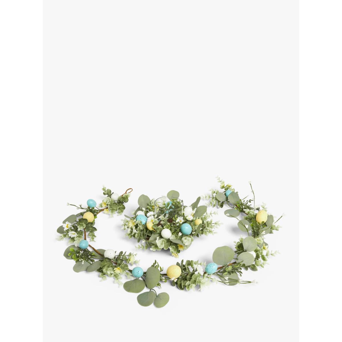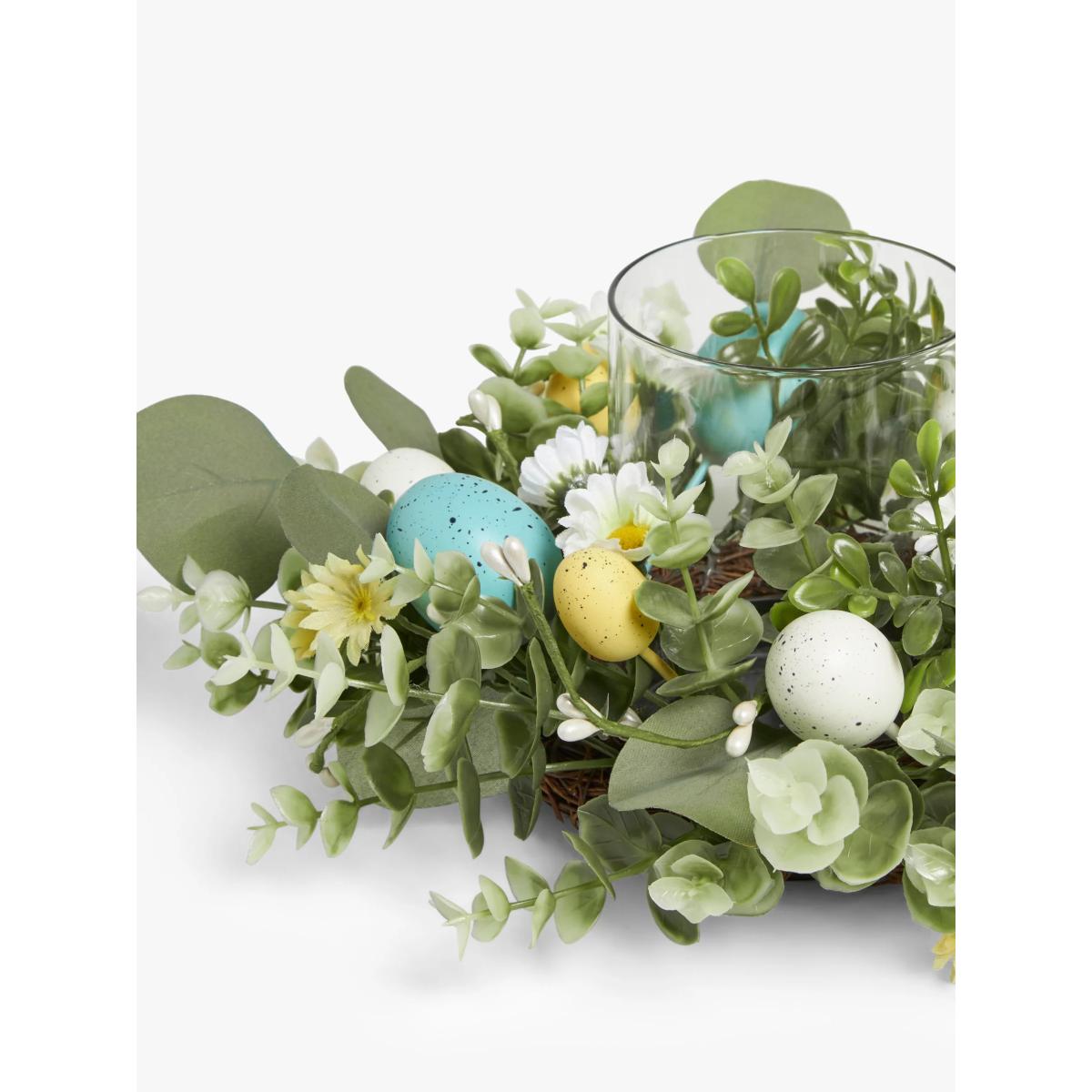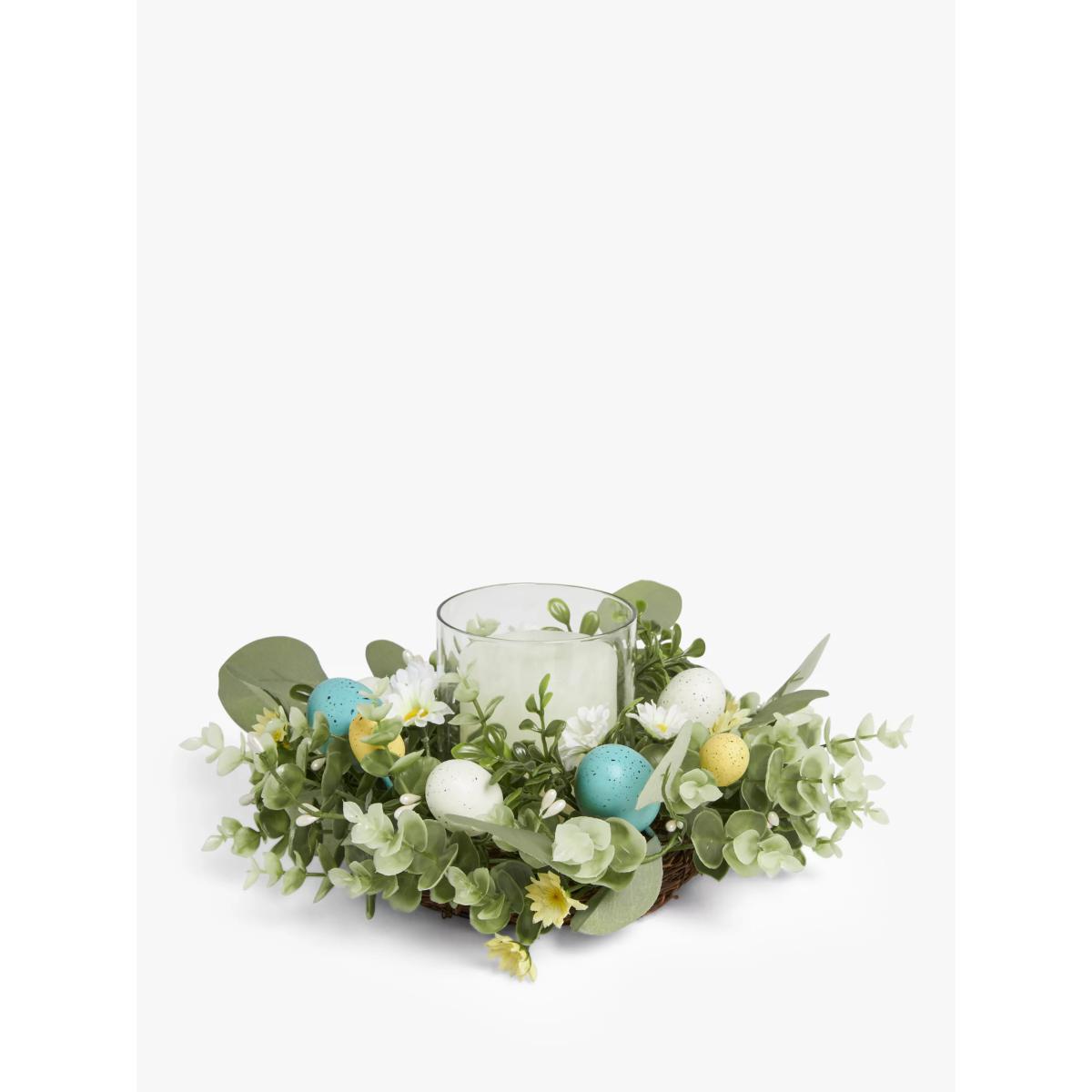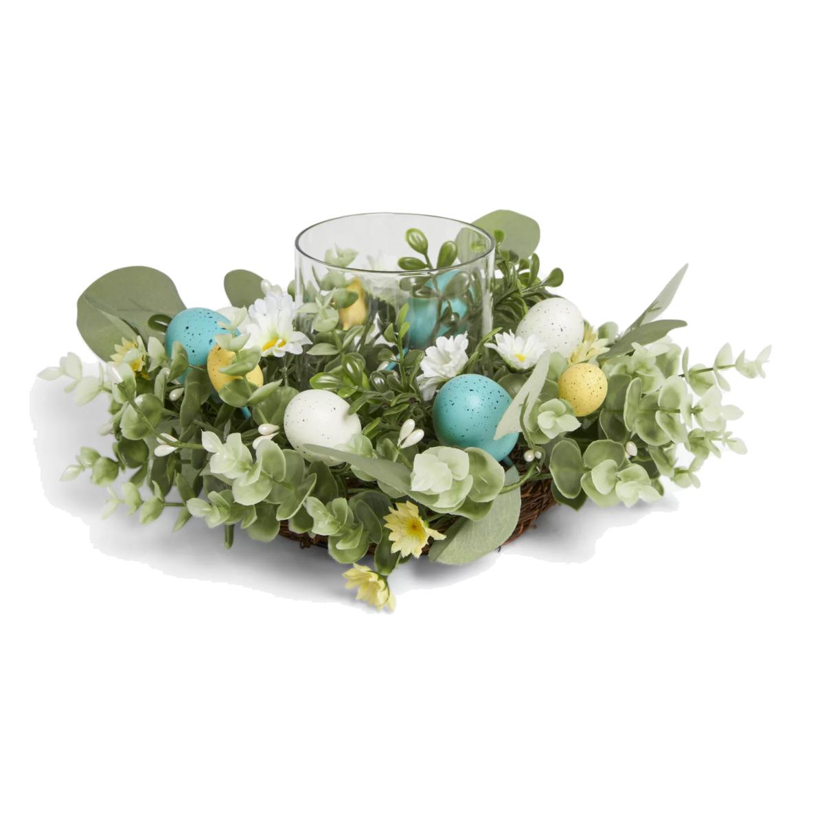 The perfect centrepiece for your Easter table is decorated with speckled eggs and pretty spring flowers. Candle not included.