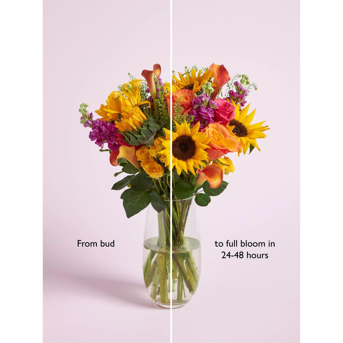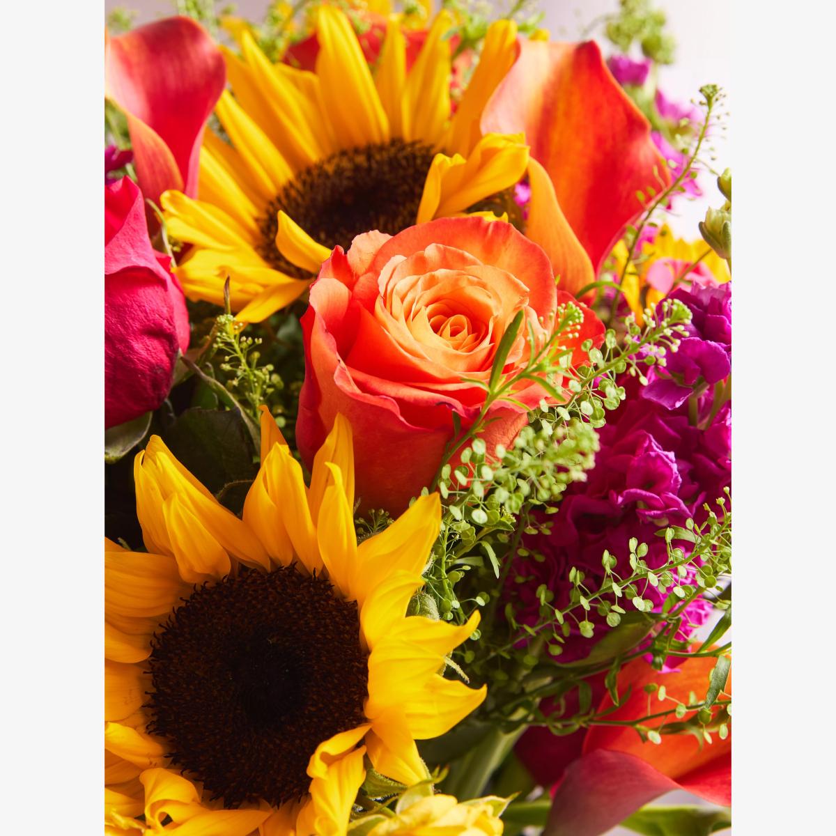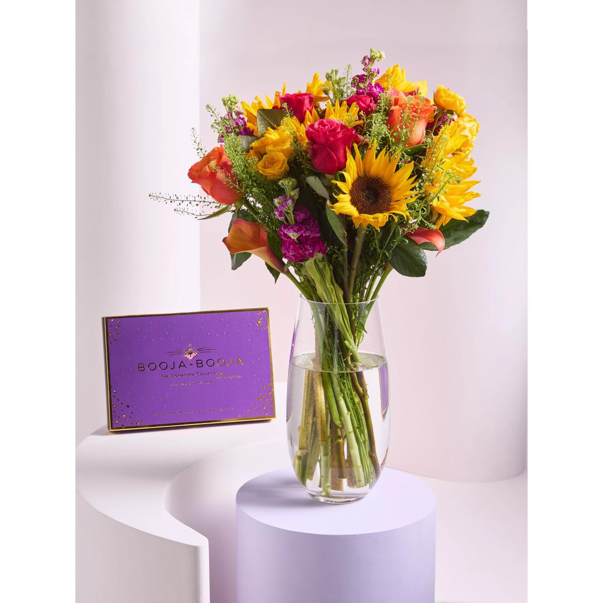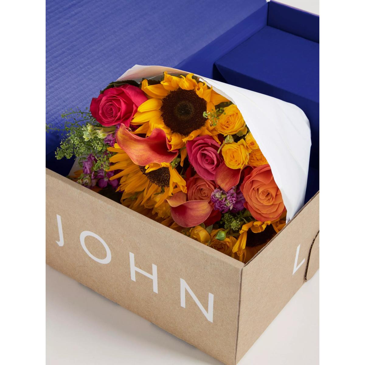 With a joyful mix of spring colour, this hand-tied Easter bouquet includes sunflowers, contemporary mango calla lilies, scented cerise stocks with a mix of orange and cerise large headed roses, yellow spray roses and lime greenbell. Complete with gourmet chocolates. Next-day UK delivery Order before 1pm Monday-Saturday for next day delivery Order before 9am Sunday for next day delivery Orders placed after these cut off times will go out the following day Contents: 25 stems Height of bouquet 50cm Booja-Booja Easter Chocolate Salted Caramel Truffle Loglets, 162g Hand-tied and delivered in bespoke John Lewis packaging Arrives in bud, they'll begin to bloom within 24-48 hours Gift message and card Flower food and care guide to keep fresh flowers full of life for a minimum of 5 days How to personalise your bouquet: 1. Place your order 2. Consider the personal message you'd like to add (maximum of 300 characters) - remember to include in your message who the gift is from 3. Click the gift message link and enter your order number and message 4. Gift message requests must be completed within 1 hour of order purchase, otherwise a standard 'thinking of you' message will be included Refund policy We can't offer refunds or exchanges on perishable goods such as flowers and food, unless faulty or not as described. Find out more. This does not affect your statutory rights.