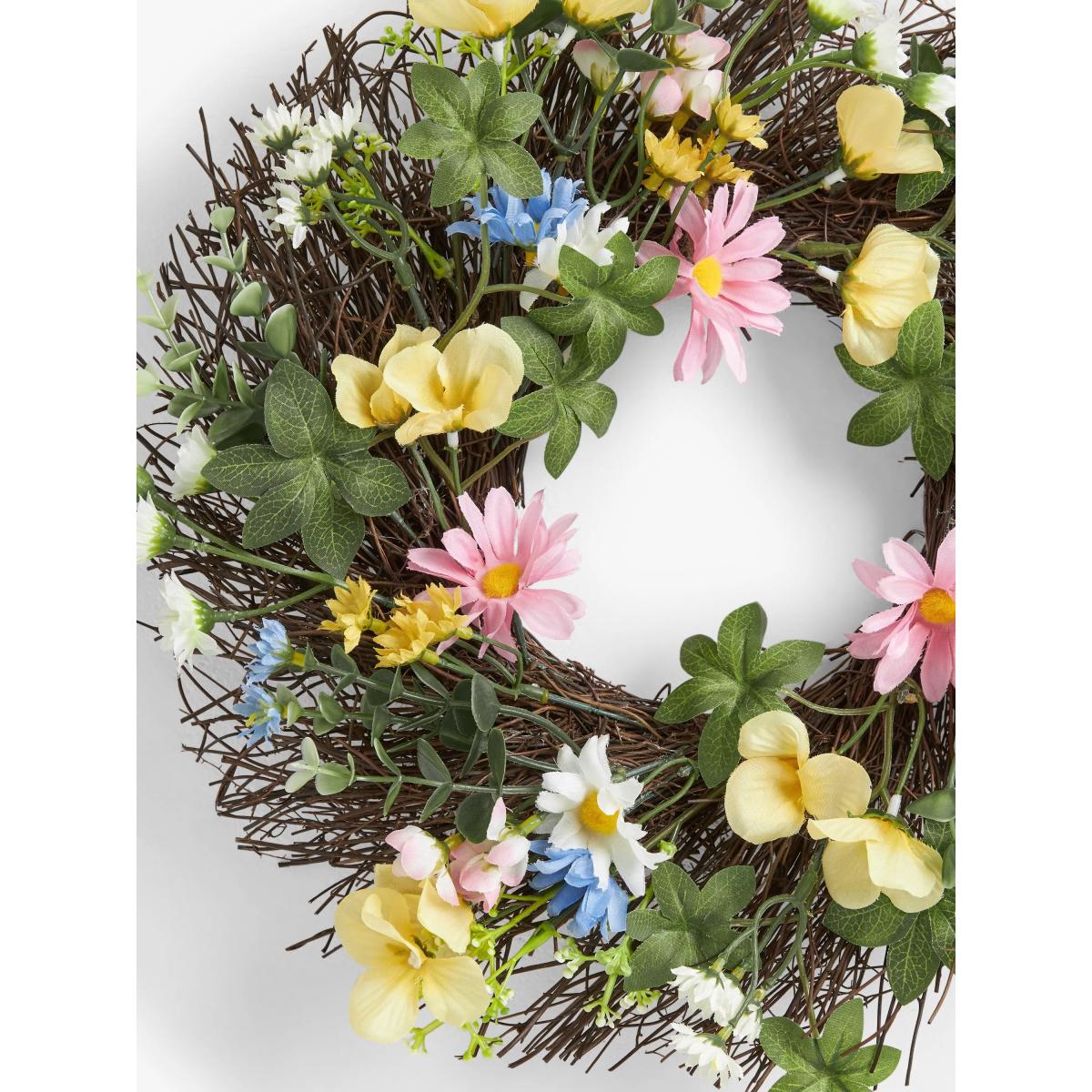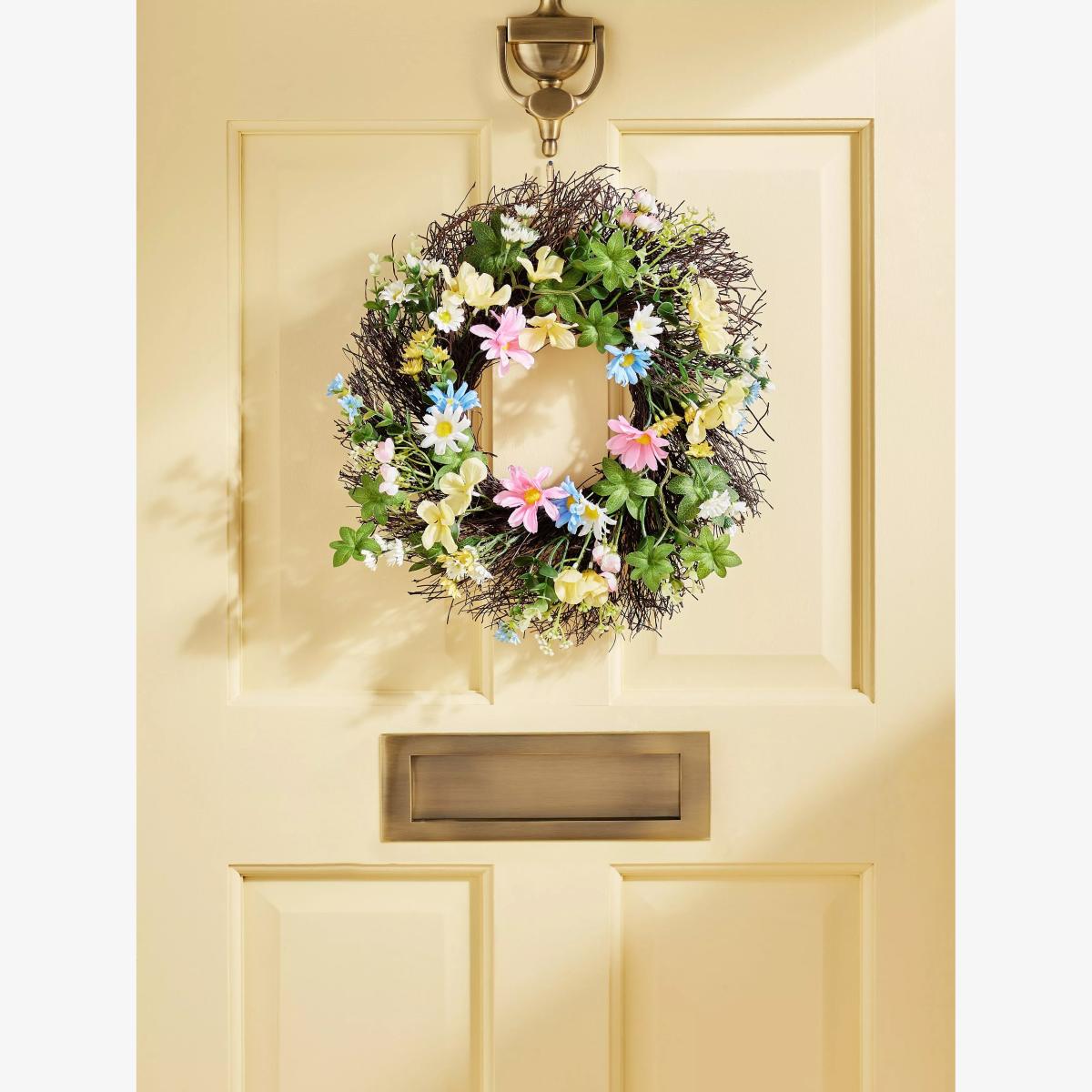 Welcome your guests with this charming Easter wreath. Made with a rattan base, it's trimmed with an array of realistic-looking artificial flowers.