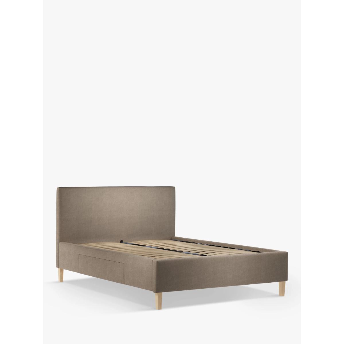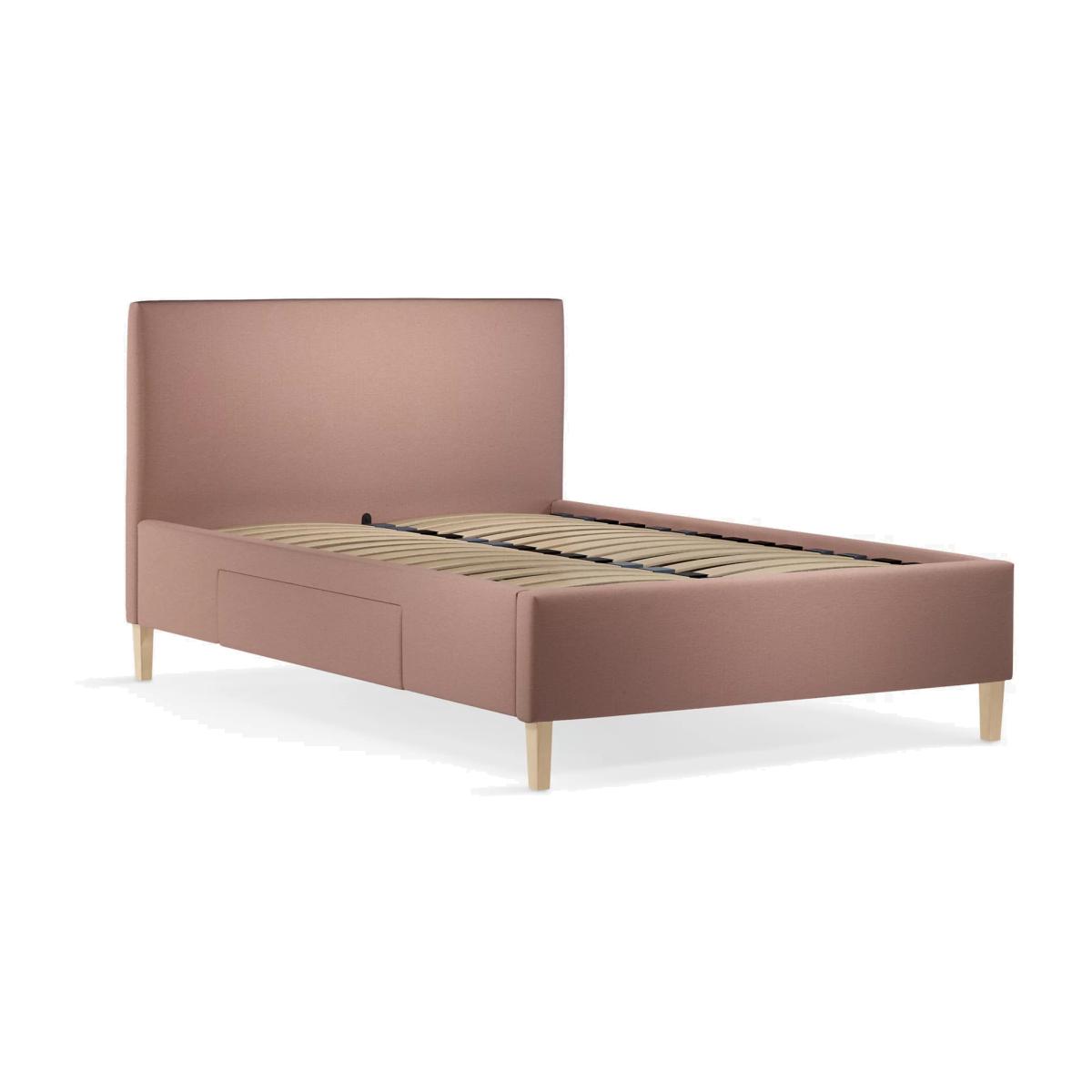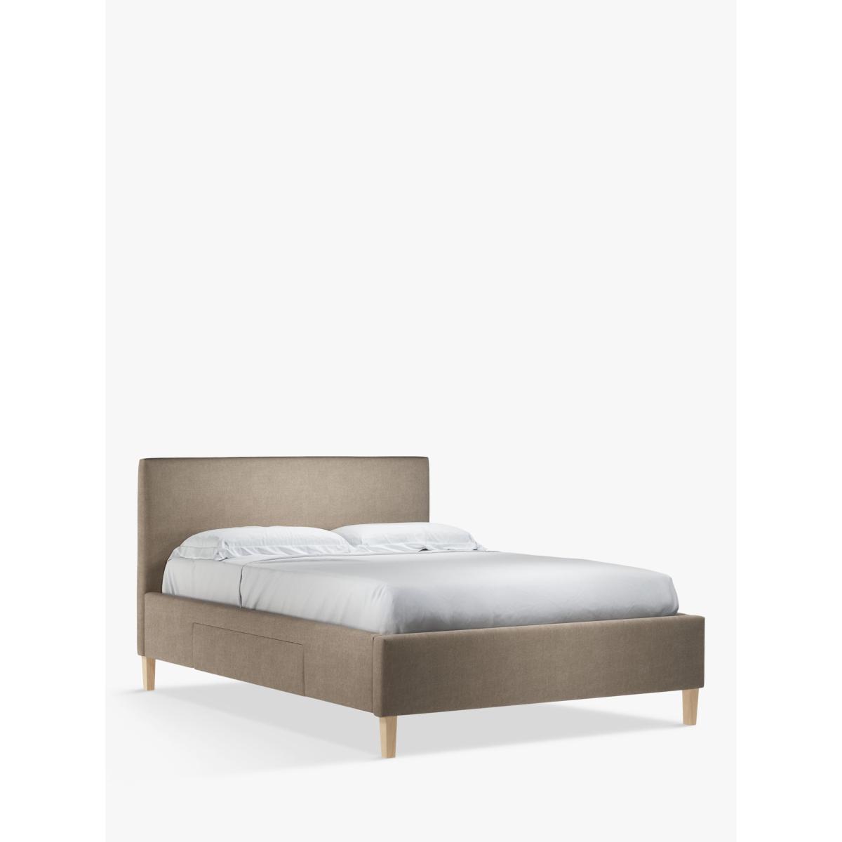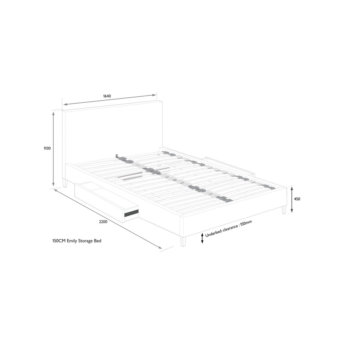 We've kept the design of our Emily storage bed frame simple and clean-lined so it's a practical choice for modern bedrooms. Easy to assemble and made from high-quality timbers, its versatile shape incorporates a large and well-padded headboard and there's a spacious, soft-close drawer on either side of the frame. We've added sprung slats in the base to provide a more supportive foundation for your mattress. Built with Smart Slats This bed frame is designed with wider slats at the shoulders, lumbar and feet. They provide maximum support for you and your mattress so that you experience perfect spinal alignment while you sleep. The standard slat caps are black so we have added grey slat caps to ensure that you know where to place the wider slats. Choose from one of our fabrics: Our Band A fabric, Cotton Effect has a laid-back and fine-textured look that looks like cotton, but it's made from durable polyester fibres Our Band A fabric, Brushed Tweed is made with a brushed herringbone weave that has a cosy wool look and soft 'peach skin' feel. It's really hard-wearing and a brilliant all-rounder Our Band A fabric, Soft Weave has a casual cotton look with a brushed finish that's soft-to-touch and a suble texture that's created by slight variations in the tones of the woven fibres Our Band B fabric, Deep Velvet will bring warmth and luxury to your bedroom. It's a short pile velvet with a soft, plush feel Our Band B fabric, Soft Touch Chenille is made from a blend of fibres that give it a super-soft feel and added durability Our Band B fabric, Boucle is luxe and oh-so cosy. This plush knitted fabric is super-soft and durable with a thick texture that calls for comfort Our Band B fabric, Deep Velvet will bring warmth and luxury to your bedroom. It's a short pile velvet with a soft, plush feel Our Band B fabric, Mole is a soft and cosy woven wool-blend. Piling and bobbling may occur naturally over time Our Band B fabric, Cord is rich in texture and available in neutral shades that will suit every space. Our Band B fabric, Relaxed Linen gives you the fine texture of cotton, the durability of synthetic fibres and the laid-back look of linen Our Band C fabric, Marylamb is woven from both man-made and natural fibres, creating a tactile and soft-touch feel. Our Band C fabric, Aquaclean Velvet will liven up your bedroom. It's plush, available in a range of bold colours and treated with Aquaclean so that it can be wiped clean with just water. A smart choice for families and those with pets Want to see it first? You may want to see and get a feel for the furniture before ordering. Pop into one of our shops to see the full range of colours and fabrics on offer. We'll be able to tell you where the range you'd like to view is on display.