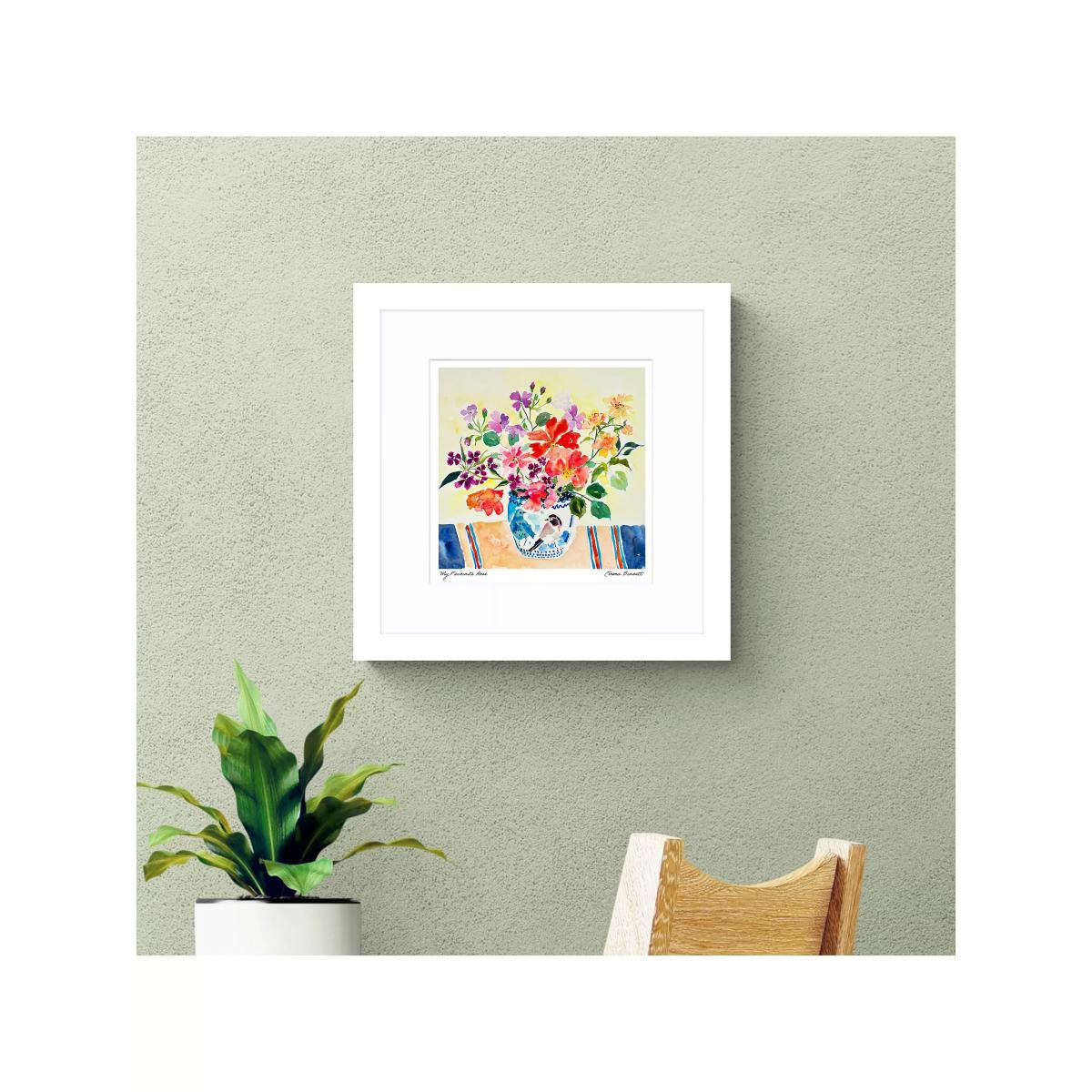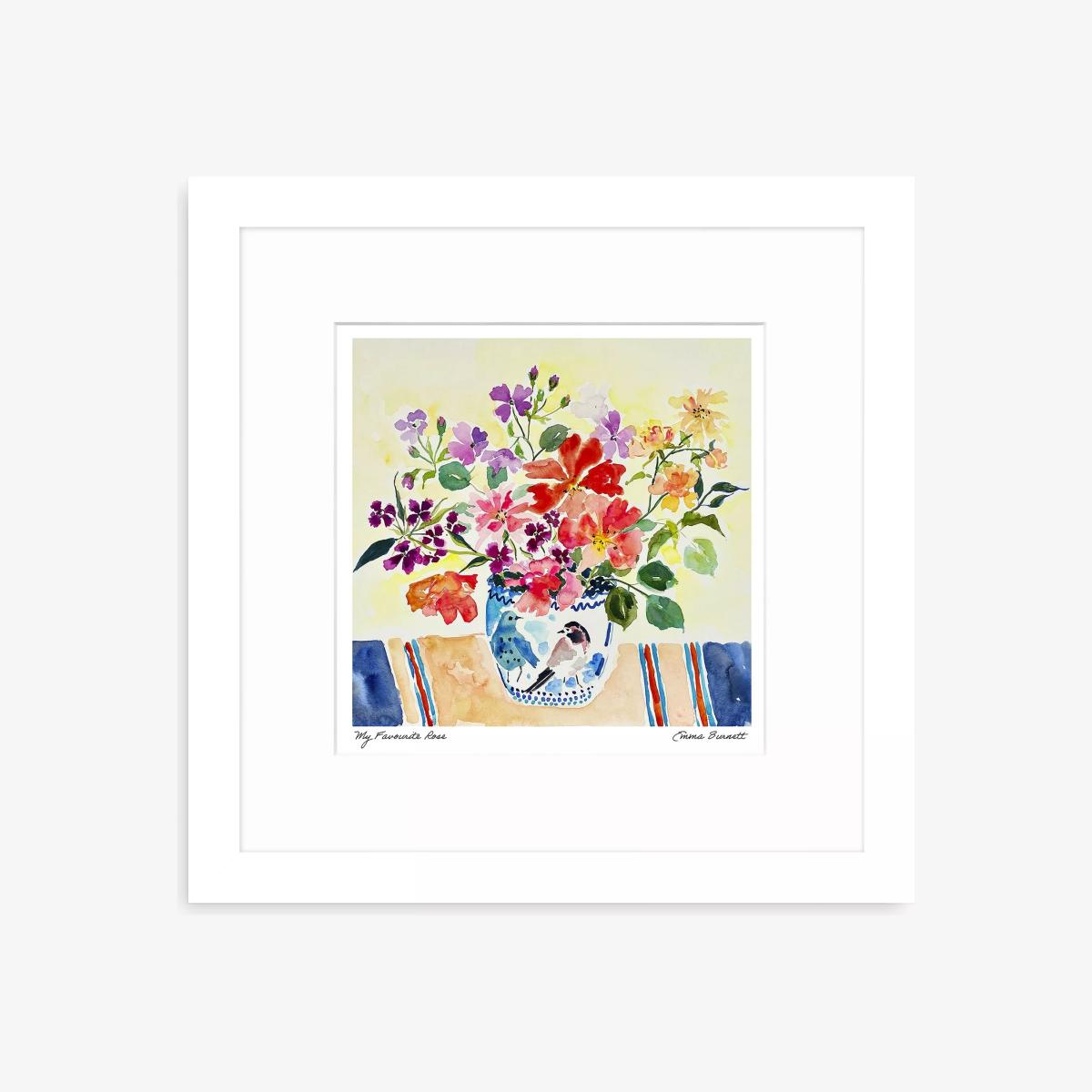 Colourful flowers by artist Emma Burnett. Made in the UK, the print is presented in a window mount, glazed and in a contemporary white frame, ready to hang on your wall. Emma Burnett is a contemporary British artist. Her work is held in collections worldwide. She trained in Brighton, England and has been a professional painter since 2008. To achieve the depth of colour and interest in her paintings she works with layer upon layer so that elements of colour glimpse through from below. Inspired by great painters such as Bonnard, Cavailles, Hitchens and Dufy, she is known for her use of colour. Her colour mixing and application of colour are designed to create depth, joy and elements of surprise. Her paintings are created to lift spirits and the places in which they hang. Have you thought about wall hooks and fittings?