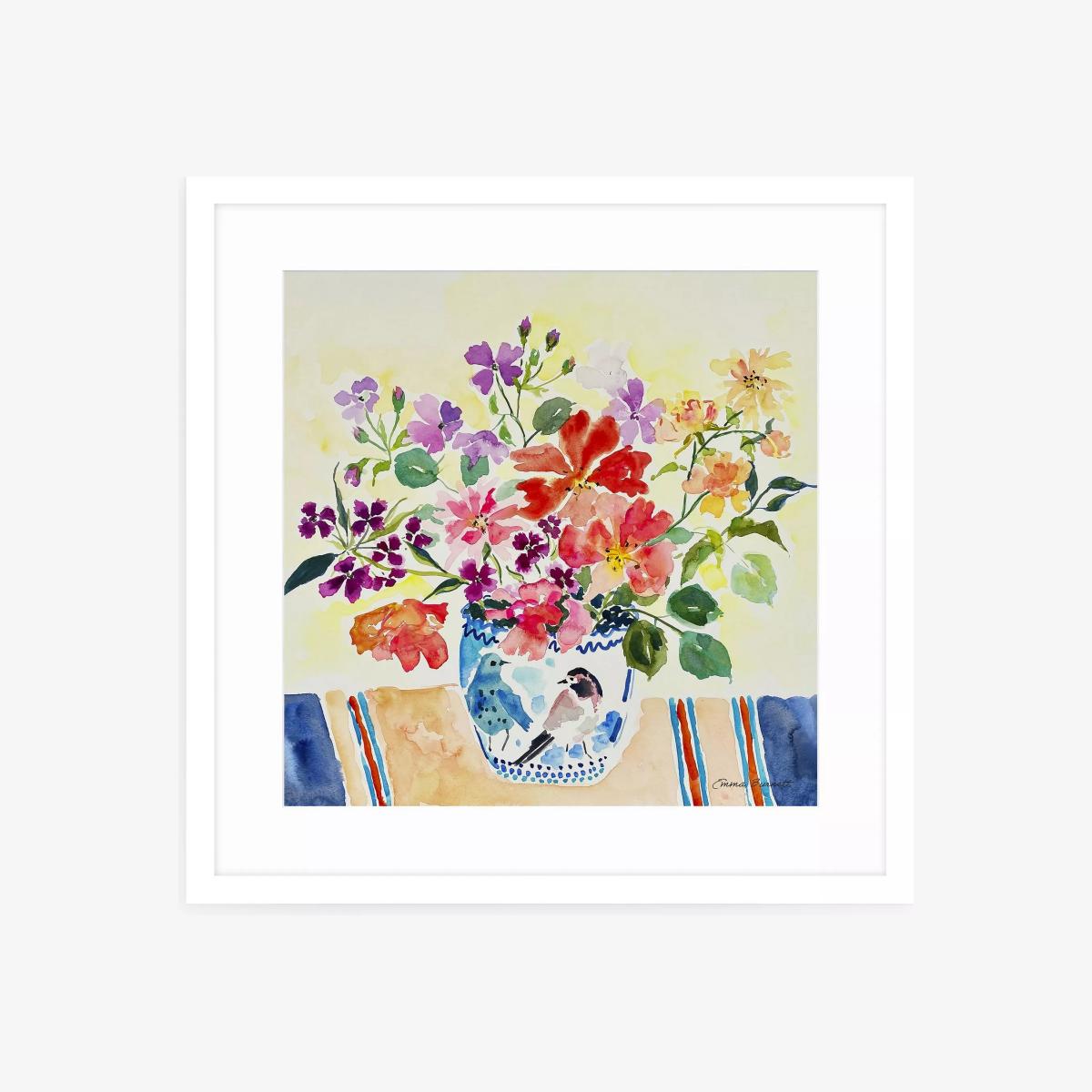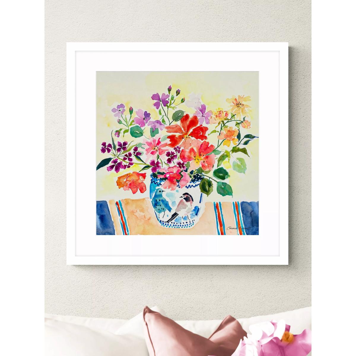 Colourful flowers by artist Emma Burnett. Made in the UK, the print is presented in a window mount, glazed and in a contemporary white frame, ready to hang on your wall. Emma Burnett is a contemporary British artist. Her work is held in collections worldwide. She trained in Brighton, England and has been a professional painter since 2008. To achieve the depth of colour and interest in her paintings she works with layer upon layer so that elements of colour glimpse through from below. Inspired by great painters such as Bonnard, Cavailles, Hitchens and Dufy, she is known for her use of colour. Her colour mixing and application of colour are designed to create depth, joy and elements of surprise. Her paintings are created to lift spirits and the places in which they hang. Have you thought about wall hooks and fittings?