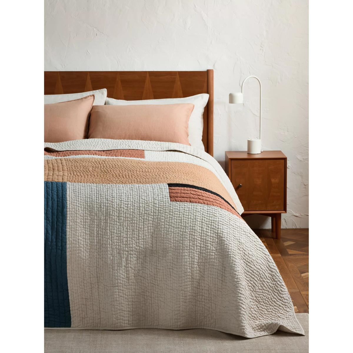 This colour block quilted bedspread is made from a mix of natural fibres including linen. 220 x 220 is recommended for double and kingsize beds. Linen’s long fibres are strong and durable, creating naturally breathable fabric to help keep you cool and comfy, the perfect lightweight layer. The texture and finish also age well, becoming softer over time.
