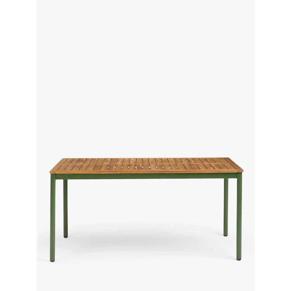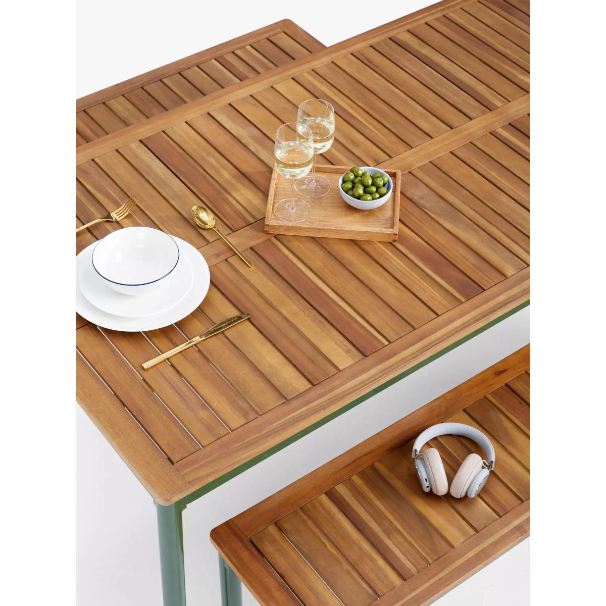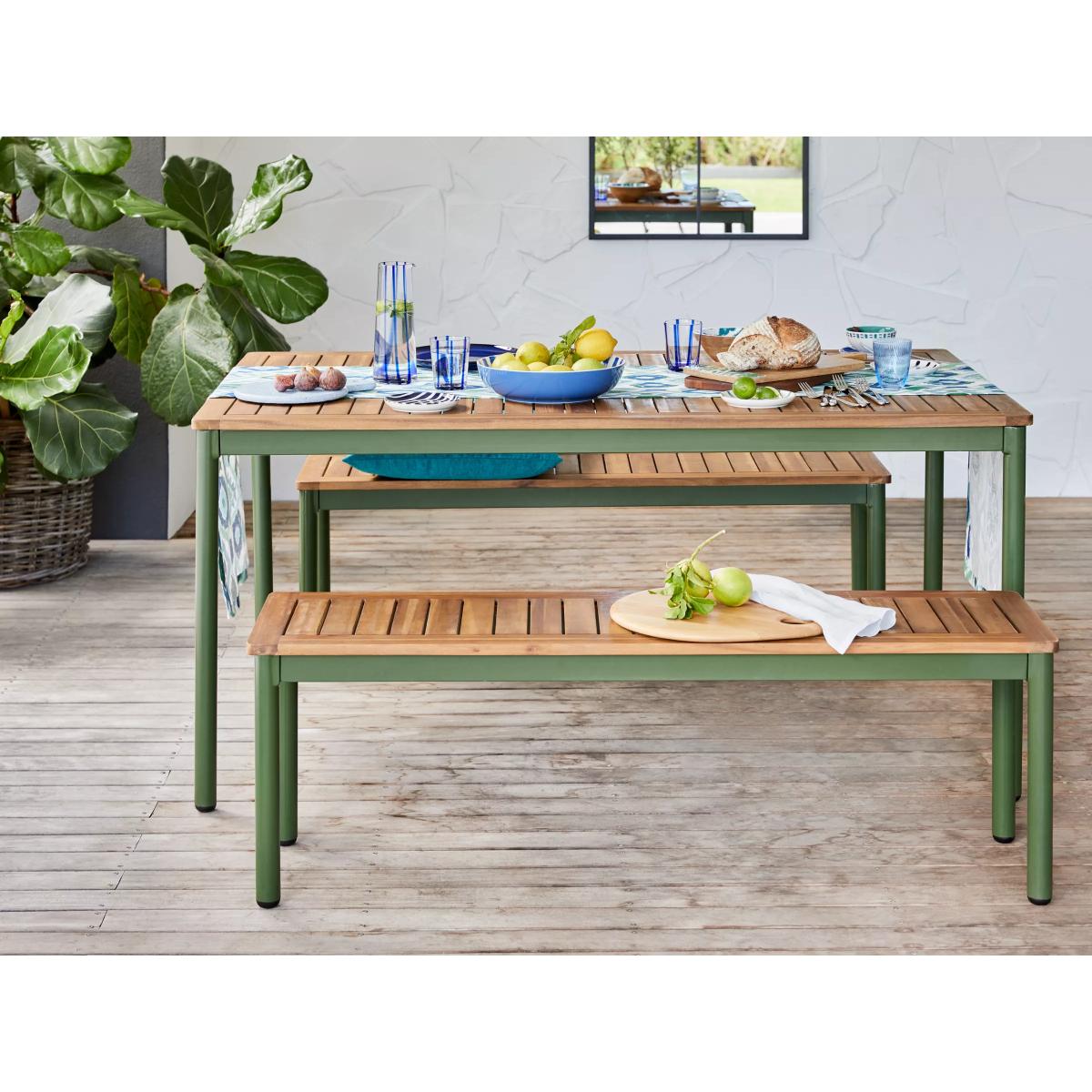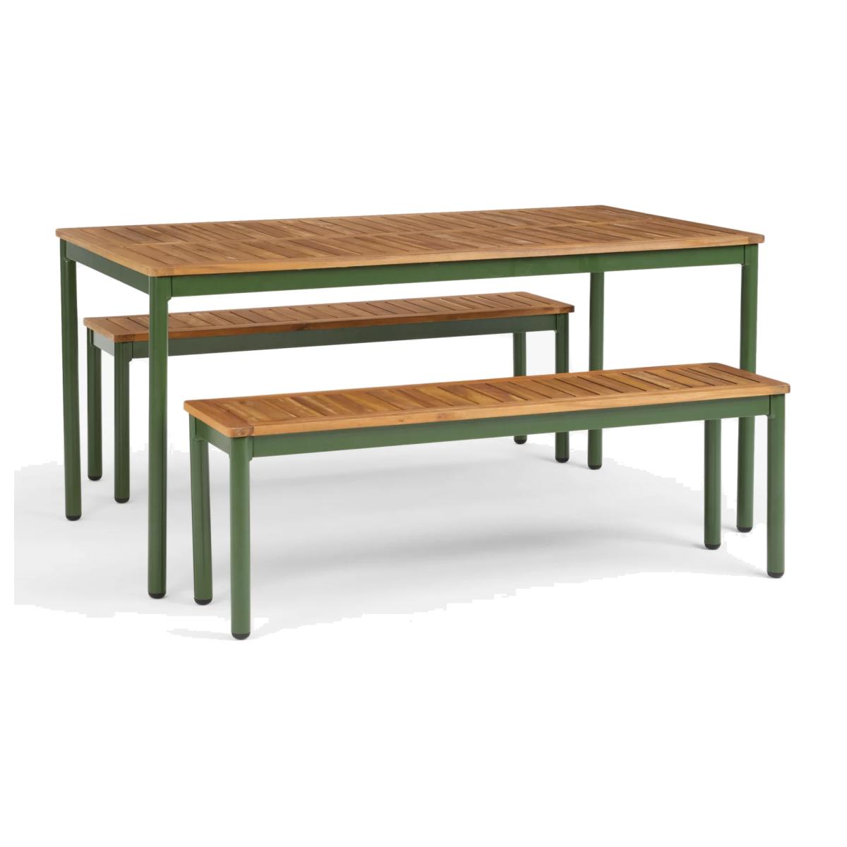 Our Erna range of garden furniture is a contemporary design made of beautiful acacia wood with robust zinc-coated steel frames, making the furniture durable and weather-resistant. The sturdy benches, seating three people per bench, can withstand a weight of 50 stone (320kg), exceeding the industry standard. This set includes a rectangular dining table. Key features:Durable and weather-resistant Contemporary design with acacia wood tops Robust steel frames withstand 50 stone per bench Rectangular dining table Feet caps protect flooring and furniture legs Garden furniture care: To keep your outdoor furniture in the best condition, store it in a cool, dry, well-ventilated spot indoors over the winter. If it’s staying outside, use an outdoor furniture cover whenever the weather is wet or unseasonal. Make sure furniture is clean and dry before storing it away. Choose the perfect outdoor furniture We have a selection of wooden furniture for you to choose from which will suit the home or garden. Below are a few options to consider when choosing your perfect outdoor furniture. TeakA premium and popular wood with an attractive appearance which ages beautifully. Strong, durable and resistant to rot and decay, this furniture requires little maintenanceEucalyptusDistinctive scent and appearance which darkens as it ages. Provides similar natural benefits to teak including moisture resistance, hardness and durability. It's plentiful in supply which makes the furniture an inexpensive choice. AcaciaNaturally durable, this wood is incredibly hard and is unlikely to suffer damage during everyday use. It provides similar natural benefits to teak, yet unlike many other hardwoods, acacia is also relatively fast growing which minimises the environmental impact.