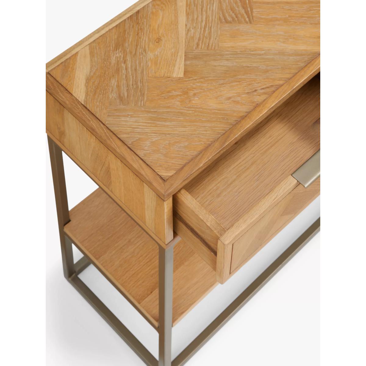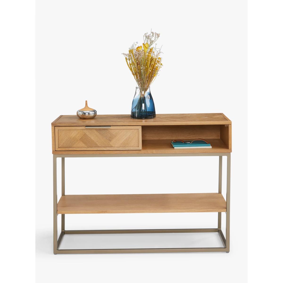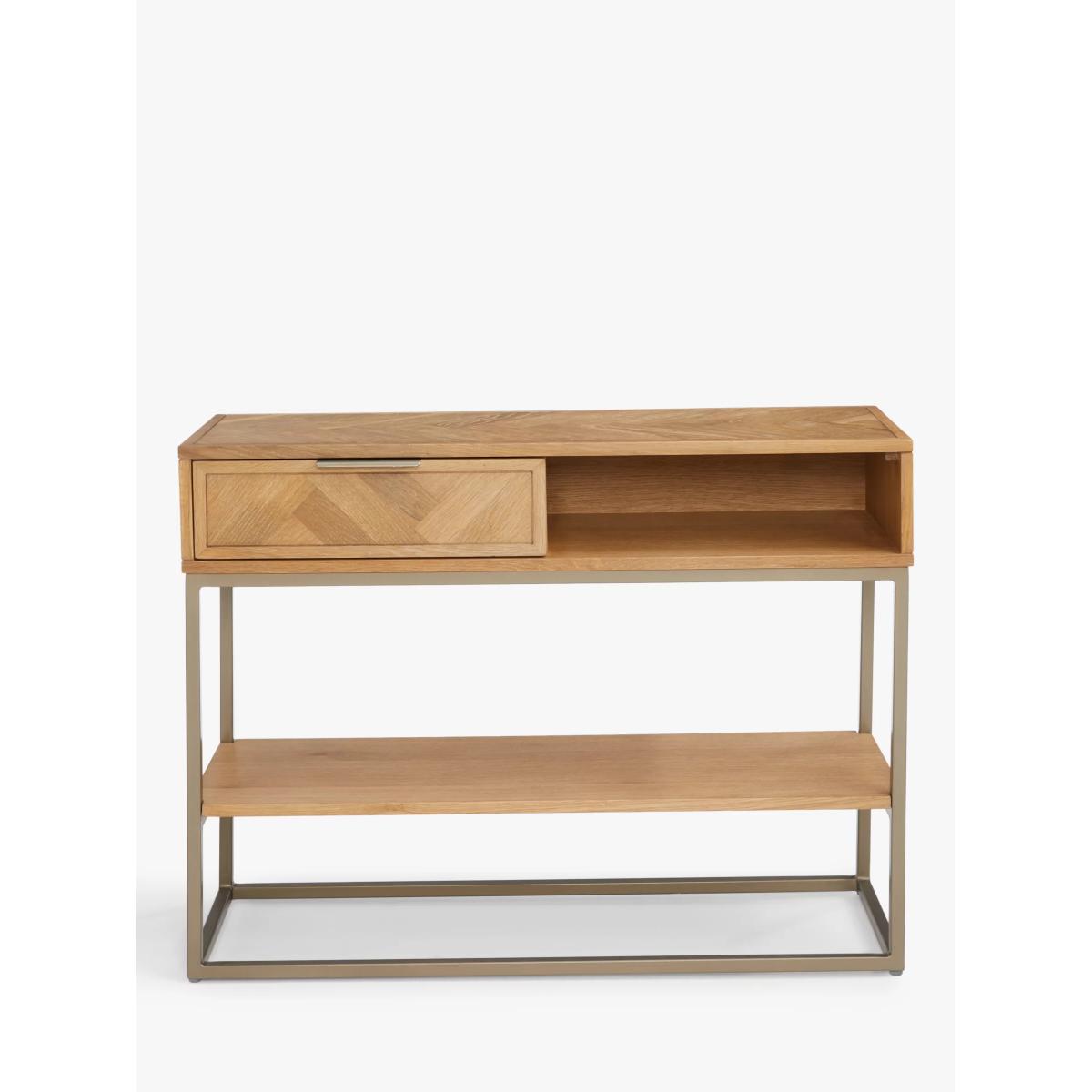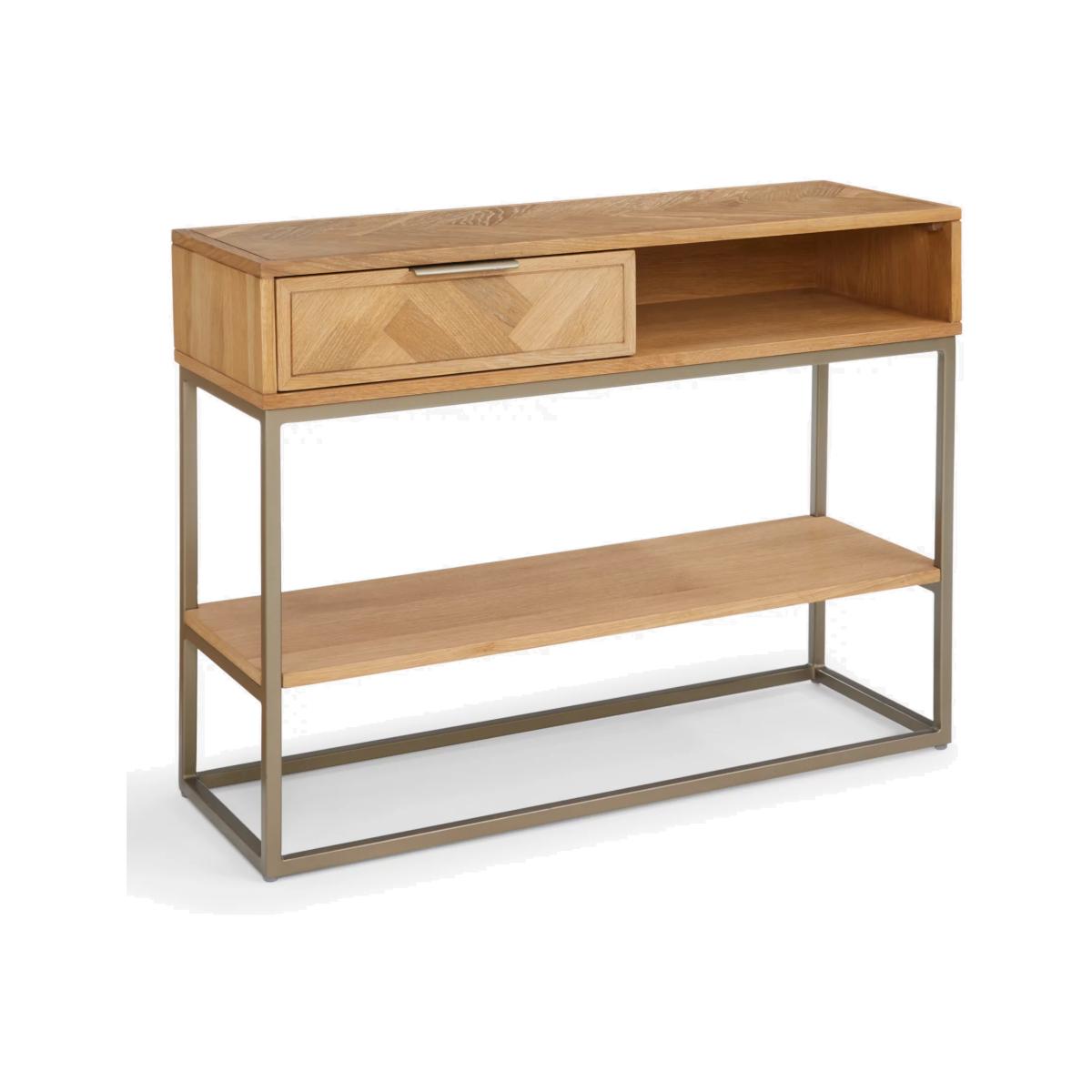 Our Estate range of furniture is characterised by its warm wood finish and parquet patterns. Functional pieces that suit country-inspired interiors, the look is calm and considered, with a lacquered coating that highlights the natural pattern and grain of the oak wood. This console table is an ideal piece for your living room or hallway. The wooden surface top is supported by a clean-lined metal frame in an antique brass finish. Thanks to the minimalist, open frame, this table will ensure your room still feels spacious and uncluttered. A drawer and two shelves give you plenty of storage space. Want to see it first? You may want to see and get a feel for the furniture in one of our shops before ordering. We'll be able to tell you where the range you'd like to view is on display.