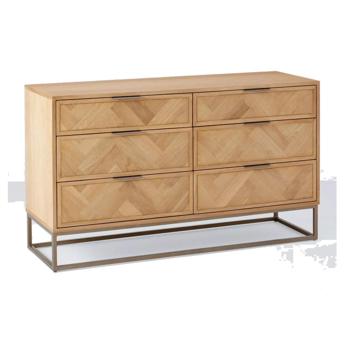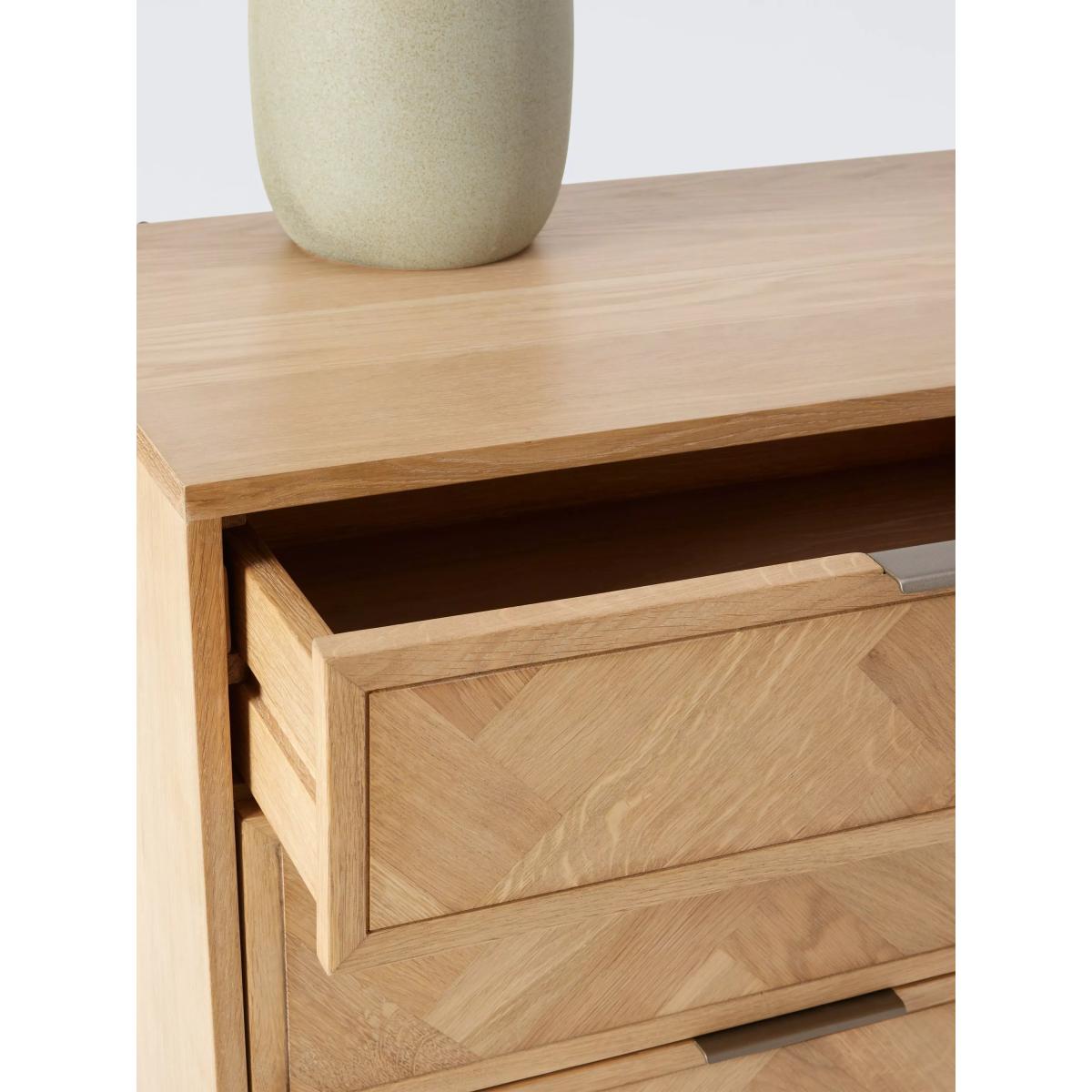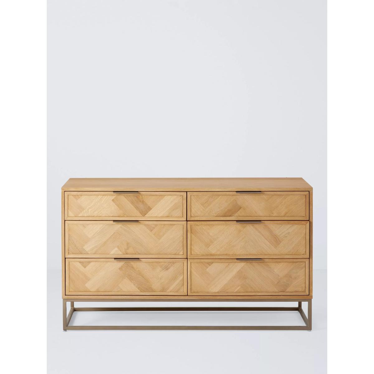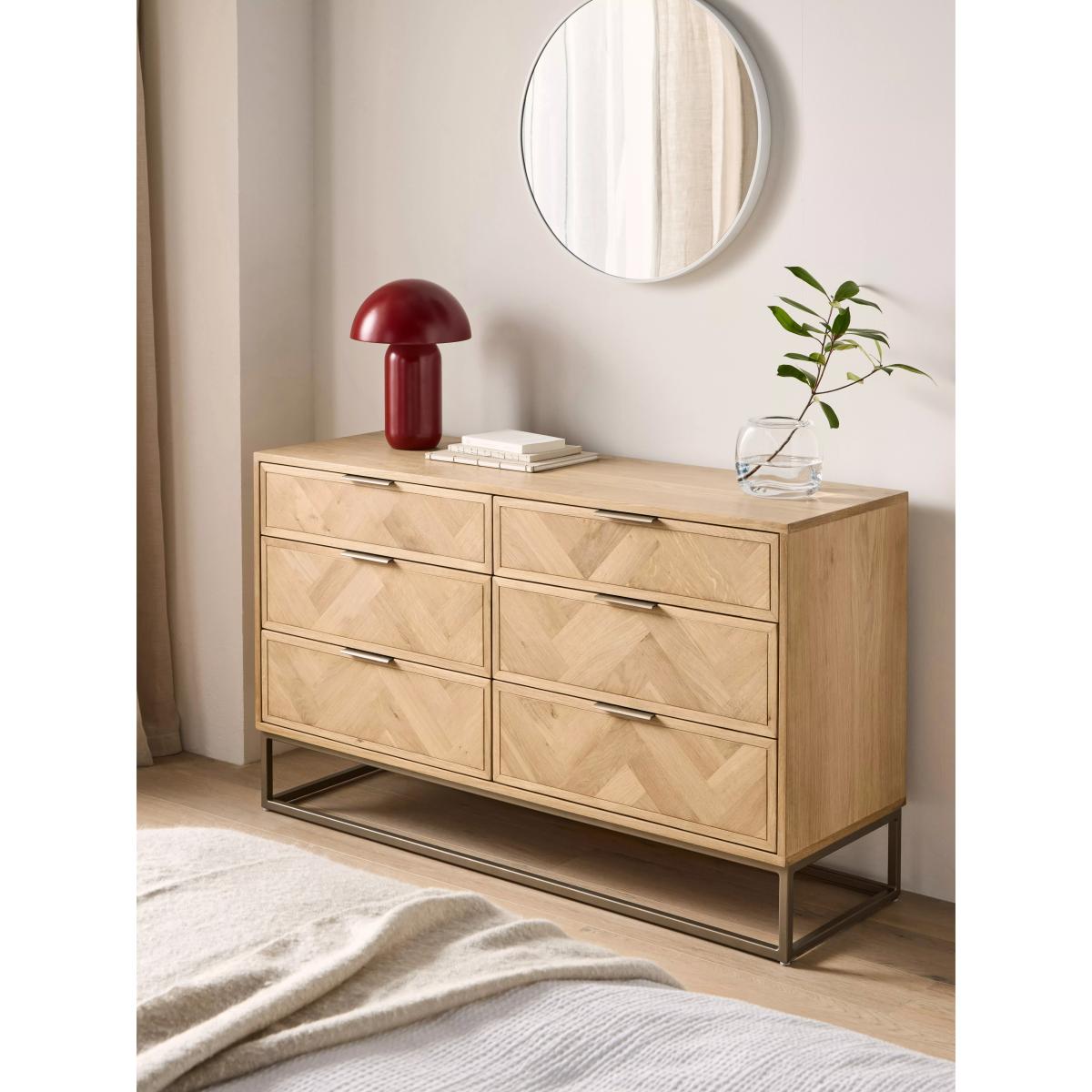 Our Estate range of furniture is characterised by its warm wood finish and parquet patterns. Functional pieces that suit country-inspired interiors, the look is calm and considered, with a lacquered coating that highlights the natural pattern and grain of the oak wood. This well proportioned chest has sleek coordinating metalwork that gives it a contemporary feel and six drawers provide ample room to keep clothes tidy. Want to see it first? You may want to see and get a feel for the furniture in one of our shops before ordering. We'll be able to tell you where the range you'd like to view is on display.