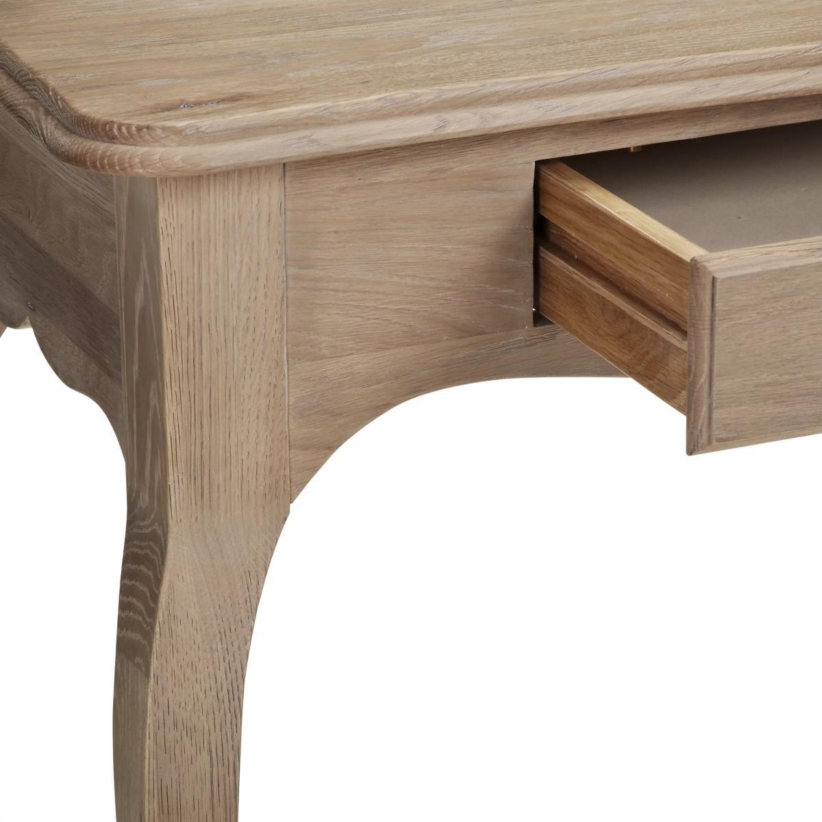 The beautiful Etienne bedroom collection is crafted from solid oak and oak veneers, cultured in a rustic rich tone and featuring an artistic weathered finish. The Etienne dressing table is finished with cabriole legs and has a delicate scalloped definition to its lower edge. The jewellery drawer in this dressing table has a cream velvet lining for a plush touch. Our Etienne gallery mirror pairs perfectly with the dressing table. Its curvy profile boasts a traditional, antique-inspired feel, while the two cream, velvet-lined drawers on either side of the mirror are ideal for make-up and small accessories. About the dressing table: Dimensions: H78 x W124 x D49cm Material: Oak, Oak veneers Weight: 26kg Under Table Clearance: 58cm About the mirror: Dimensions: H68 x W83.5 x D24.5cm Material: Oak, Oak veneers Weight: 9kg Please note: not all our ranges are on display in our shops.