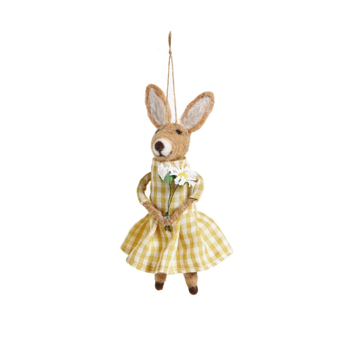 A cute felt rabbit, dressed in her best gingham dress and holding a posy of daisies.