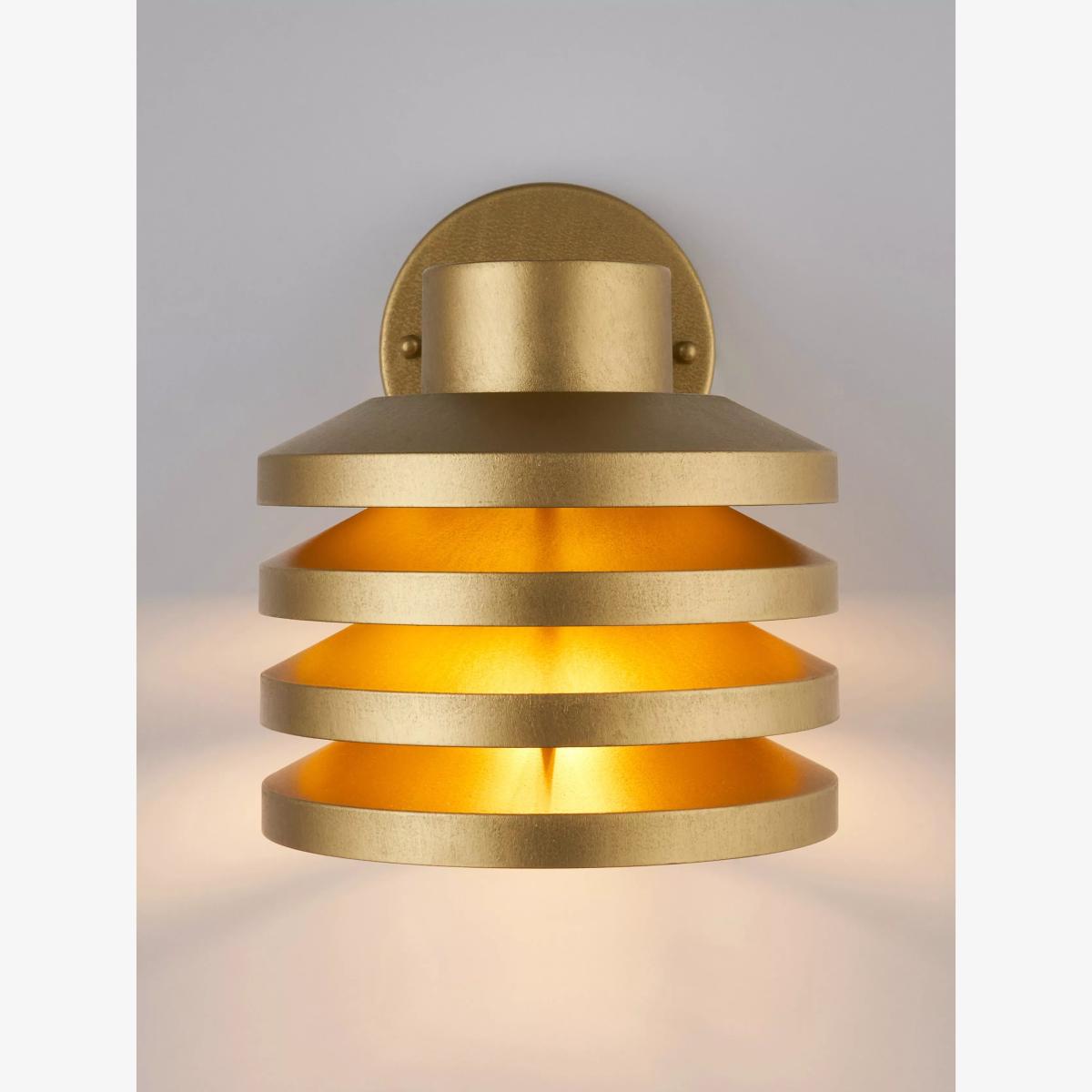This wall light is a great addition to outdoor spaces, offering a sleek, contemporary look with its layered, geometric design. I love how the warm golden finish adds a touch of sophistication, making it versatile enough for modern patios or traditional garden walls. It works well paired with minimalist furniture or mixed with vintage elements for an eclectic vibe. To style it effectively, consider placing it alongside lanterns or string lights to create a balanced and inviting atmosphere. Practical tips include mapping out its placement to highlight key features like doorways or planting borders and ensuring it’s installed at an appropriate height for optimal illumination without overpowering the space.