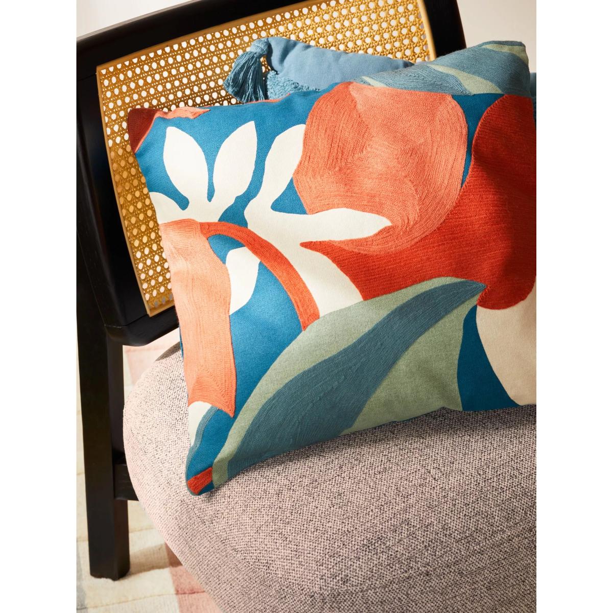 Woven cushion with embroidered details for texture. A vibrant and summery floral design cropped tight to give an abstract look. The reverse is plain.