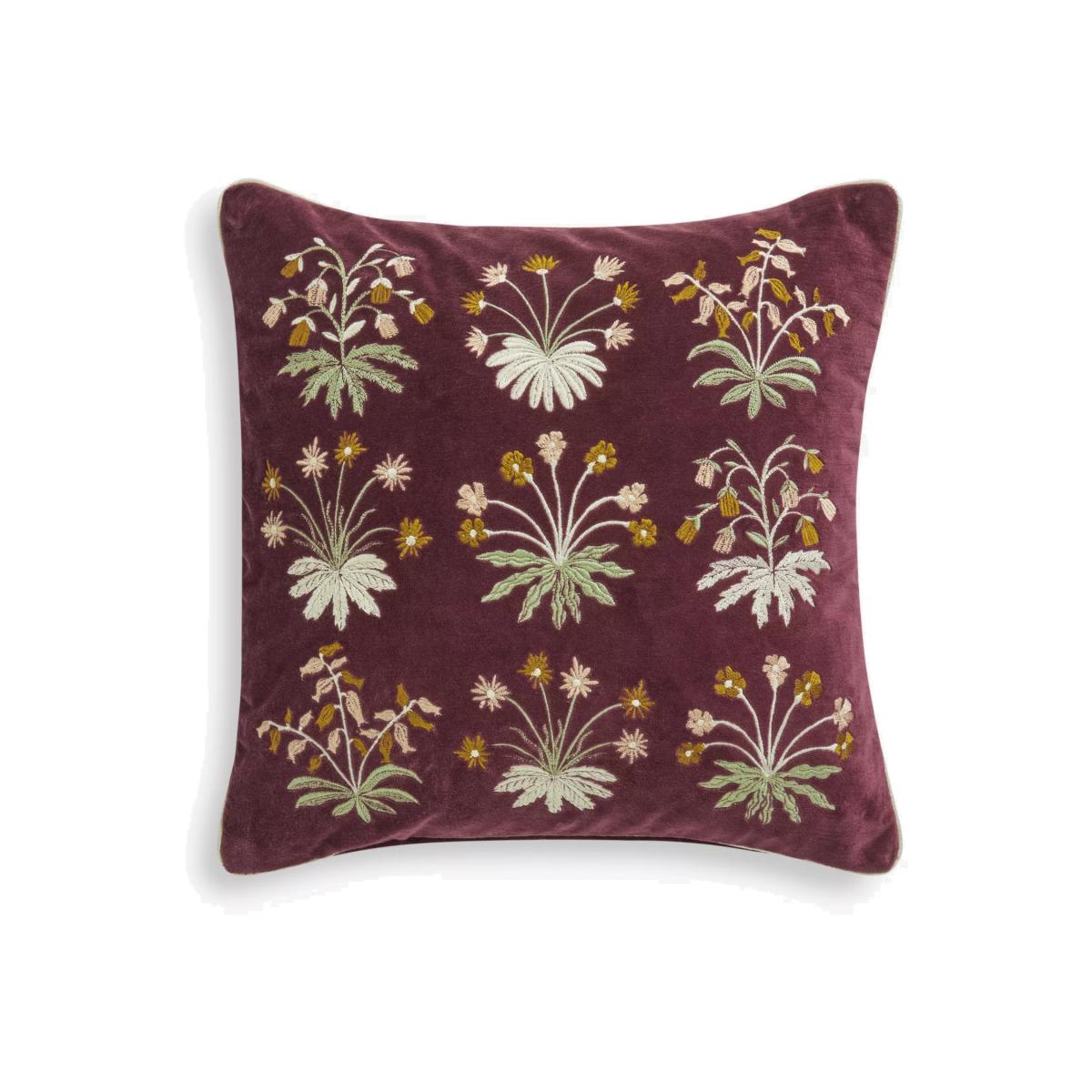 This cotton velvet cushion has a hand-guided machine embroidery design of woodland flowers.