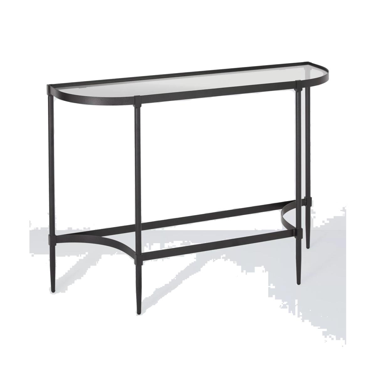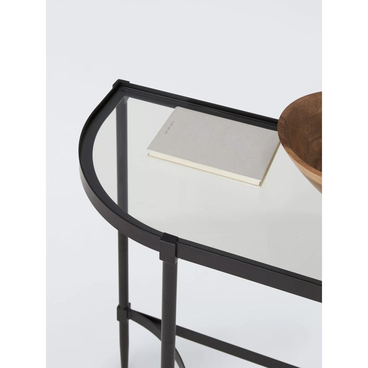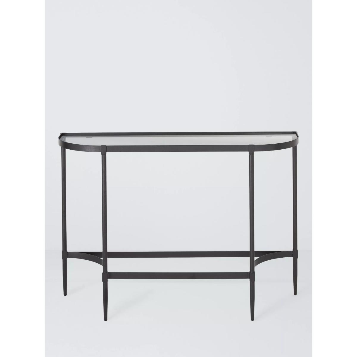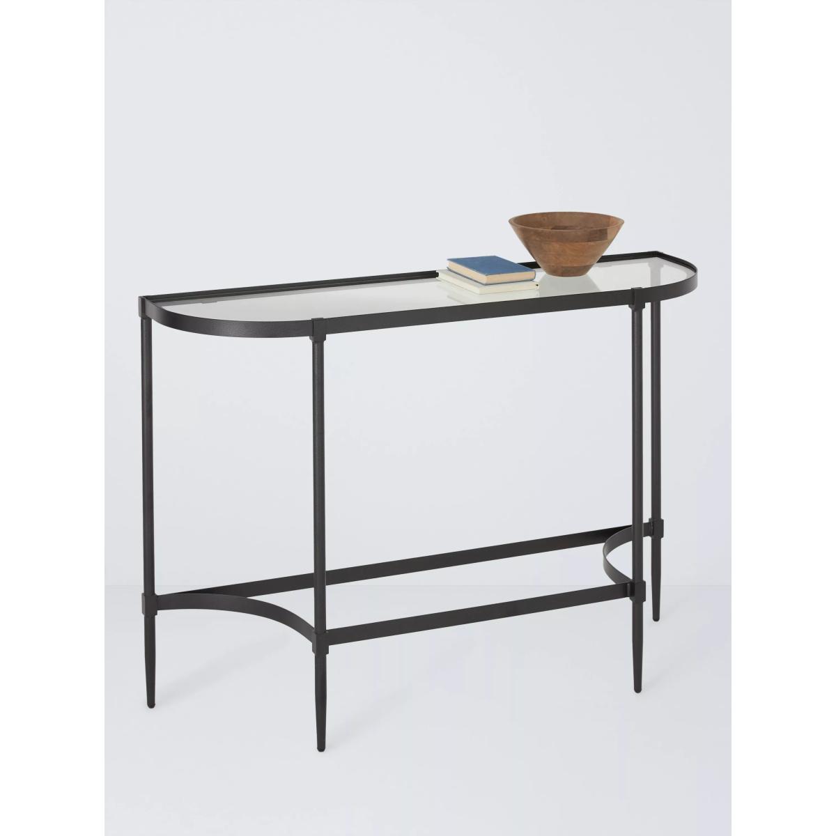 Our Forge range blends timeless design and expert craftsmanship. We've built this sculpted console table from robust powder-coated steel with elegant tapered legs and a tempered glass surface top. The textured finish of the steel references classic hammered and hand-forged ironmongery, but it's a versatile style that works well in both contemporary or industrial-inspired settings. Want to see it first? You may want to see and get a feel for the furniture in one of our shops before ordering. We'll be able to tell you where the range you'd like to view is on display.