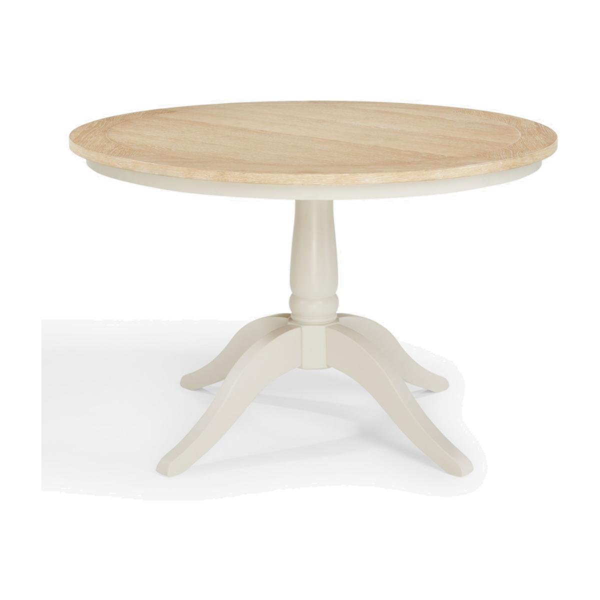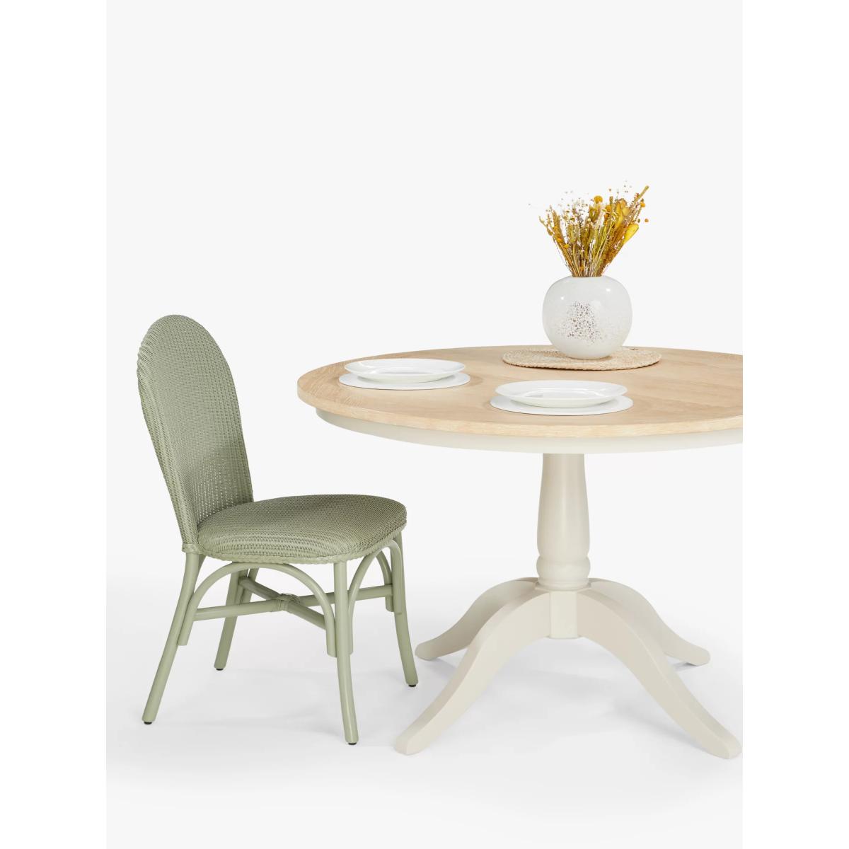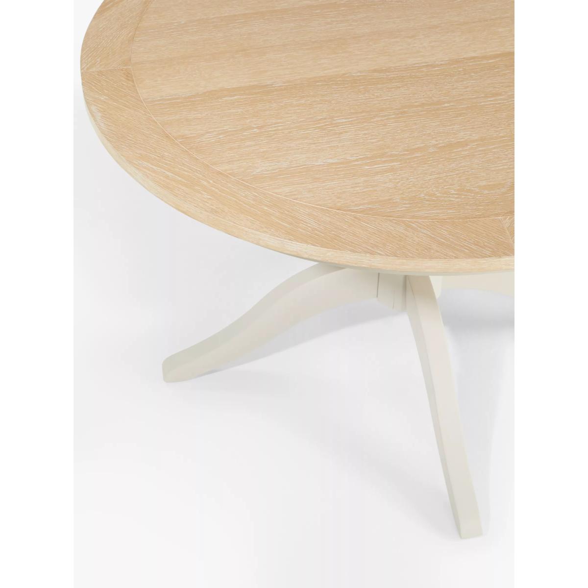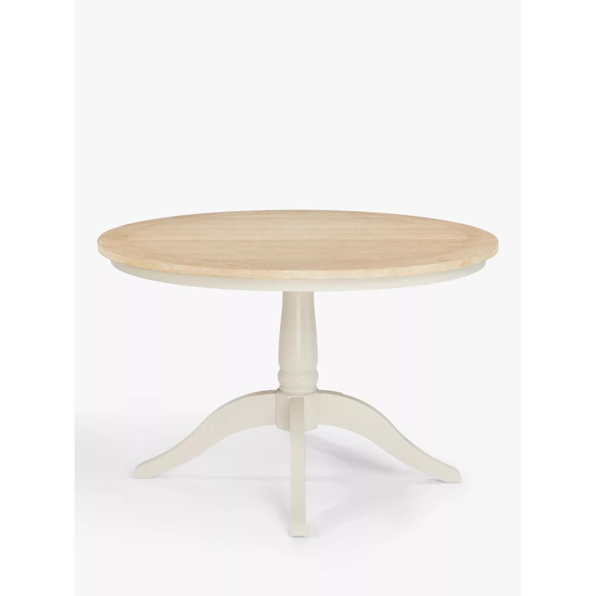 Our Foxmoor pedestal dining table seats 4 and is perfect for relaxed, intimate dining. Leave the natural oak veneer top bare to show off the beautiful wood grain or dress with a printed tablecloth. Either way, it will be the focal point of your kitchen diner or dining room. Foxmoor offers modern country style for a fresh and calming space you'll love to come home to. Details include hand-glazed oak veneer framed tops, elegantly turned legs and Shaker-style doors and drawers with beaded detailing. The hardwearing paint finish is beautifully complemented by aged brass effect handles and barrel hinges and coordinates well with other soft tones, as well as natural materials such as wicker and linen. All the wood used in our Foxmoor furniture range is FSC certified. By choosing this product you are supporting responsible management of the world's forests. The Forest Stewardship Council® (FSC®) is a global, not-for-profit organisation that helps take care of forests and the people and wildlife that call them home. To learn more, visit fsc.org. Want to see it first? You may want to see and get a feel for the furniture in one of our shops before ordering. We'll be able to tell you where the range you'd like to view is on display.
