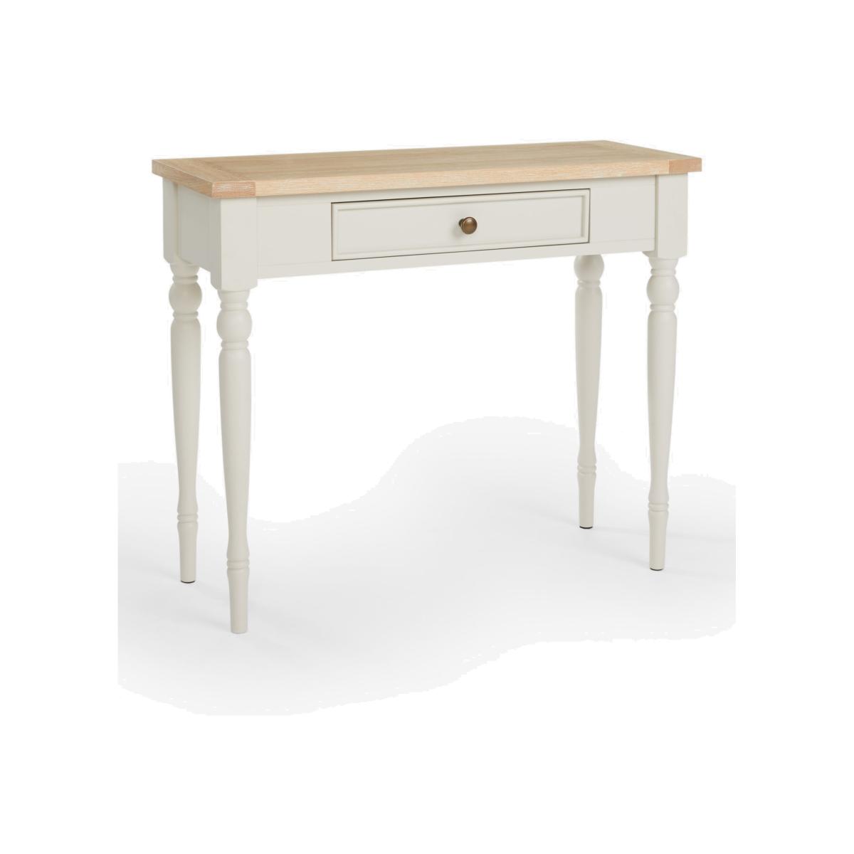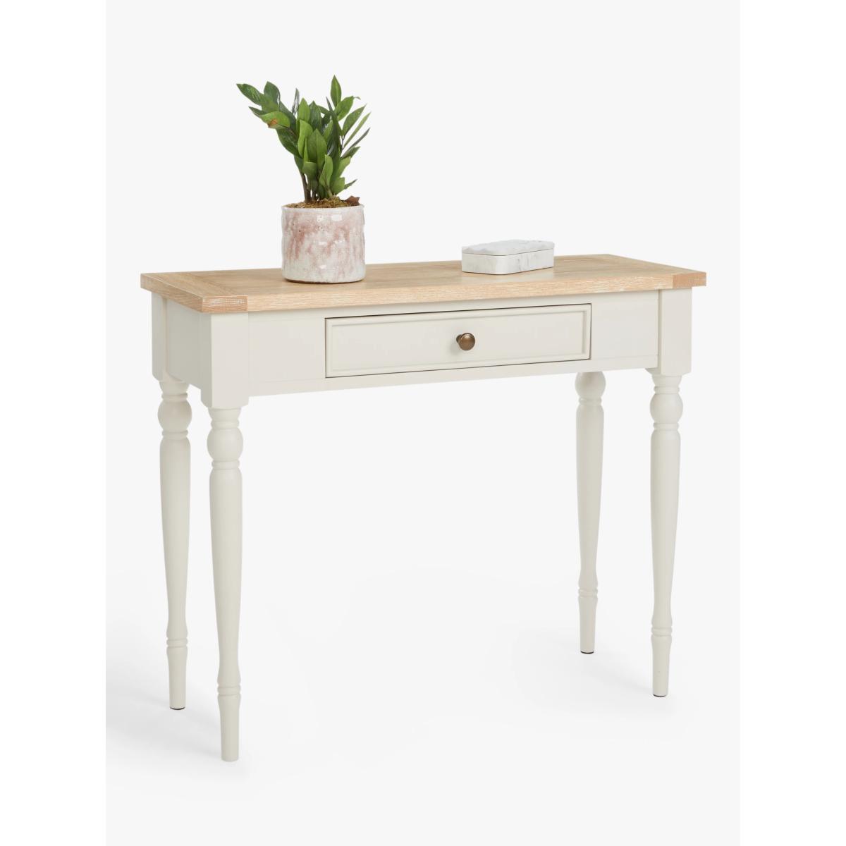 Our Foxmoor compact console table makes a useful addition to smaller hallway or living room spaces and comes with a drawer for storage. Foxmoor offers modern country style for a fresh and calming space you'll love to come home to. Details include hand-glazed oak veneer framed tops, elegantly turned legs and Shaker-style doors and drawers with beaded detailing. The hardwearing paint finish is beautifully complemented by aged brass effect handles and barrel hinges and coordinates well with other soft tones, as well as natural materials such as wicker and linen. All the wood used in our Foxmoor furniture range is FSC certified. By choosing this product you are supporting responsible management of the world's forests. The Forest Stewardship Council® (FSC®) is a global, not-for-profit organisation that helps take care of forests and the people and wildlife that call them home. To learn more, visit fsc.org. Want to see it first? You may want to see and get a feel for the furniture in one of our shops before ordering. We'll be able to tell you where the range you'd like to view is on display.