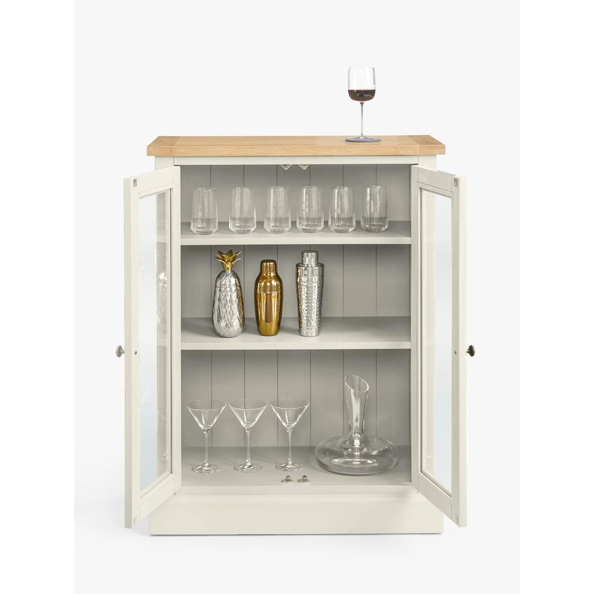 The Foxmoor drinks cabinet provides a neat, discreet way to store all your entertaining essentials including barware, glassware and decanters and features two fixed shelves. Foxmoor offers modern country style for a fresh and calming space you'll love to come home to. Details include hand-glazed oak veneer framed tops, elegantly turned legs and Shaker-style doors and drawers with beaded detailing. The hardwearing paint finish is beautifully complemented by aged brass effect handles and barrel hinges and coordinates well with other soft tones, as well as natural materials such as wicker and linen. All the wood used in our Foxmoor furniture range is FSC certified. By choosing this product you are supporting responsible management of the world's forests. The Forest Stewardship Council® (FSC®) is a global, not-for-profit organisation that helps take care of forests and the people and wildlife that call them home. To learn more, visit fsc.org. Want to see it first? You may want to see and get a feel for the furniture in one of our shops before ordering. We'll be able to tell you where the range you'd like to view is on display.