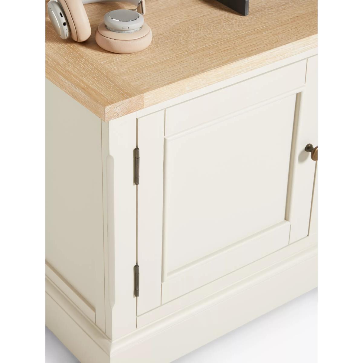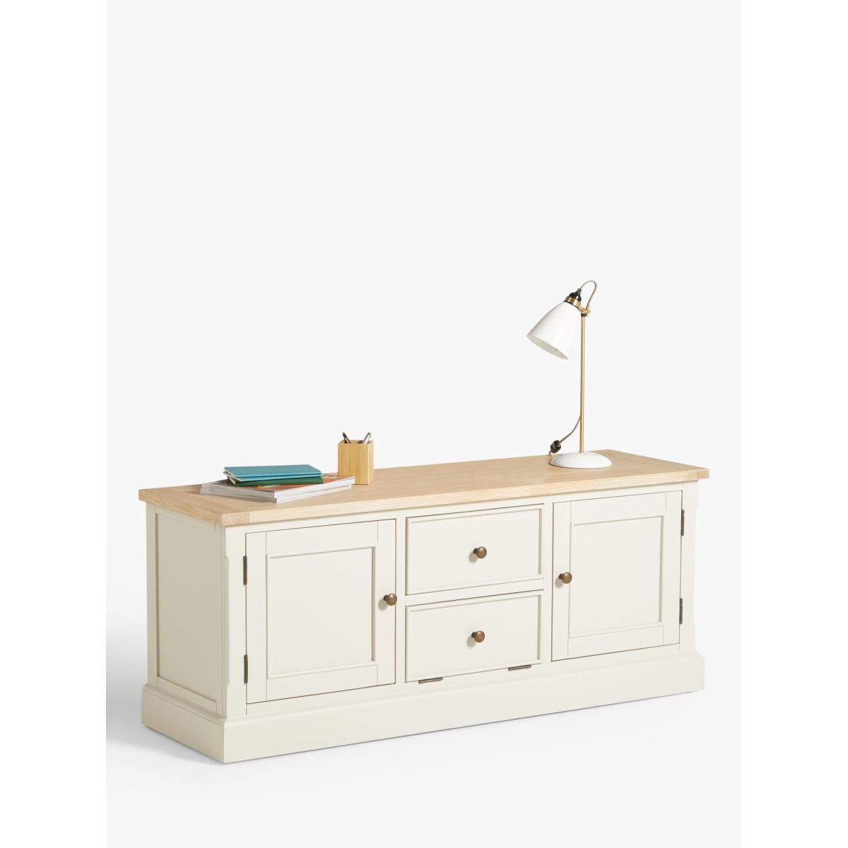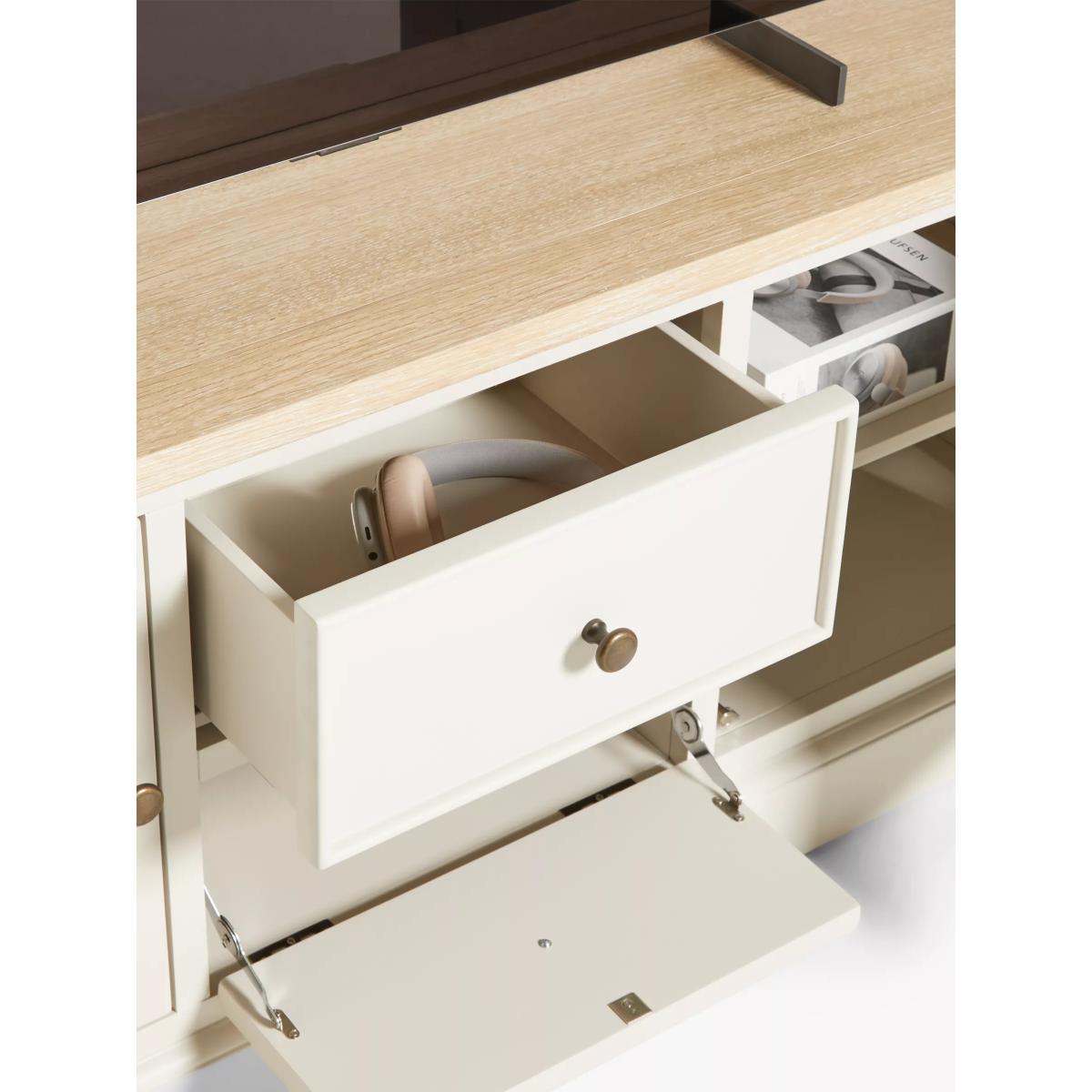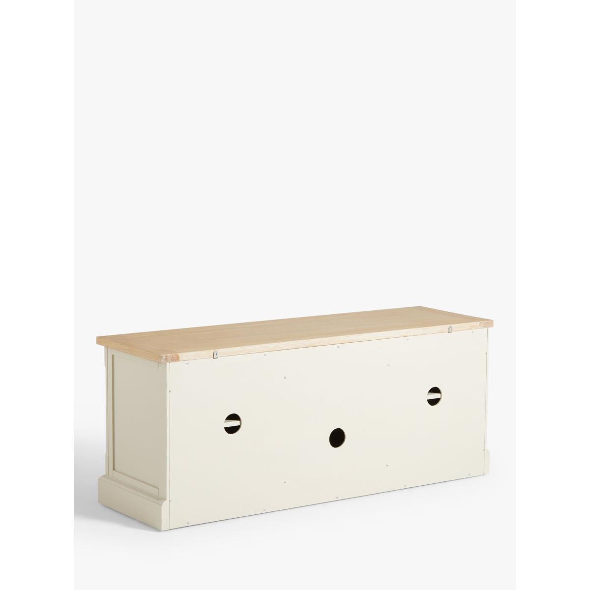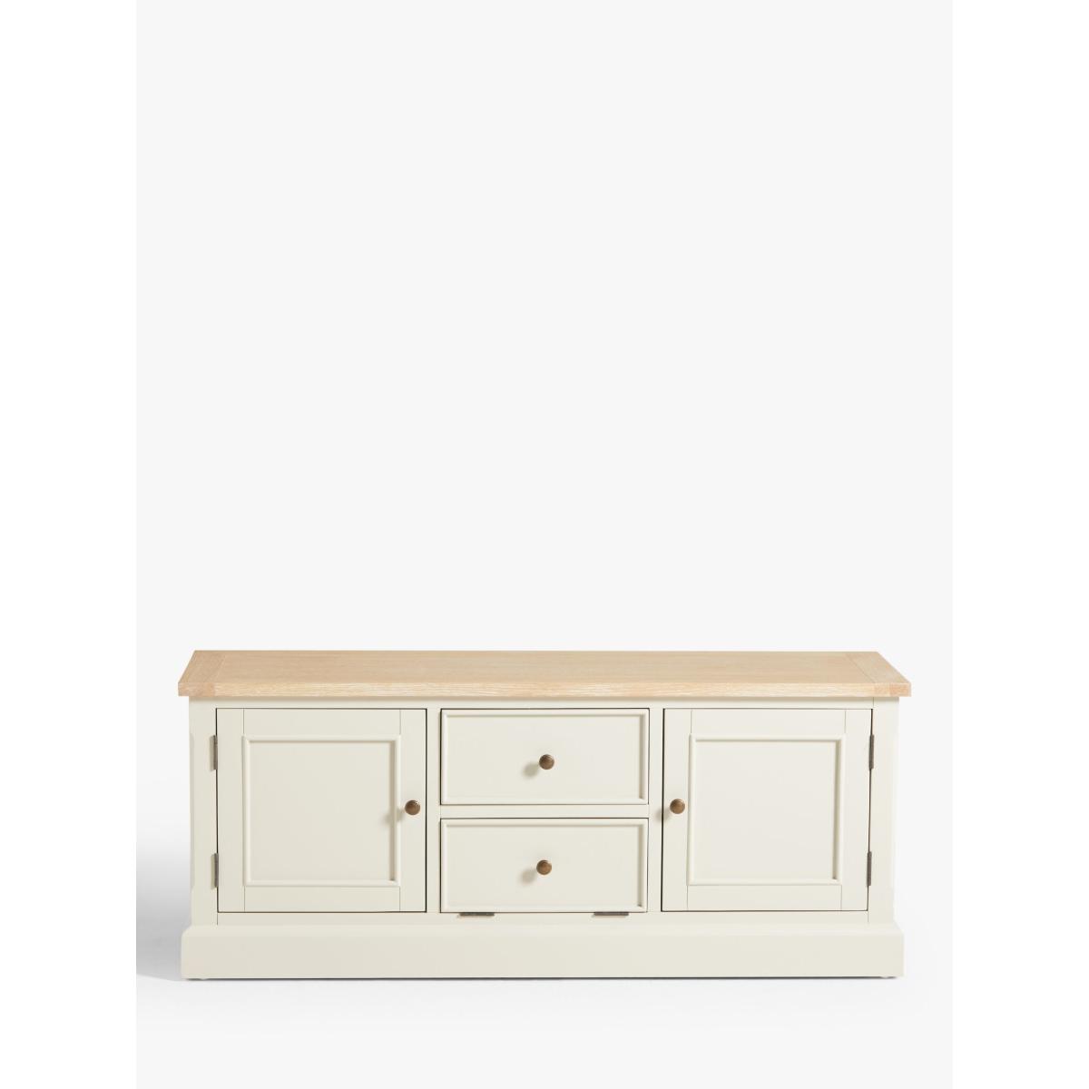Our Foxmoor media unit is an attractive way to store all your media and features three cable holes at the back so recorders and streaming devices can be stored neatly out of sight. A fold-down flap, disguised as a drawer, makes playing DVD or Blu-Ray discs simple and the top can accommodate a TV up to 60". Maximum loads: 50kg for the top surface, 10kg for the shelf. Foxmoor offers modern country style for a fresh and calming space you'll love to come home to. Details include hand-glazed oak veneer framed tops, elegantly turned legs and Shaker-style doors and drawers with beaded detailing. The hardwearing paint finish is beautifully complemented by aged brass effect handles and barrel hinges and coordinates well with other soft tones, as well as natural materials such as wicker and linen. All the wood used in our Foxmoor furniture range is FSC certified. By choosing this product you are supporting responsible management of the world's forests. The Forest Stewardship Council® (FSC®) is a global, not-for-profit organisation that helps take care of forests and the people and wildlife that call them home. To learn more, visit fsc.org. Want to see it first? You may want to see and get a feel for the furniture in one of our shops before ordering. We'll be able to tell you where the range you'd like to view is on display.