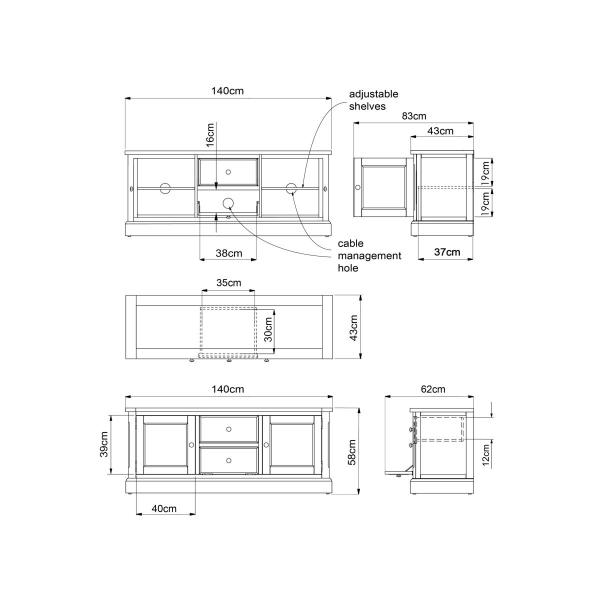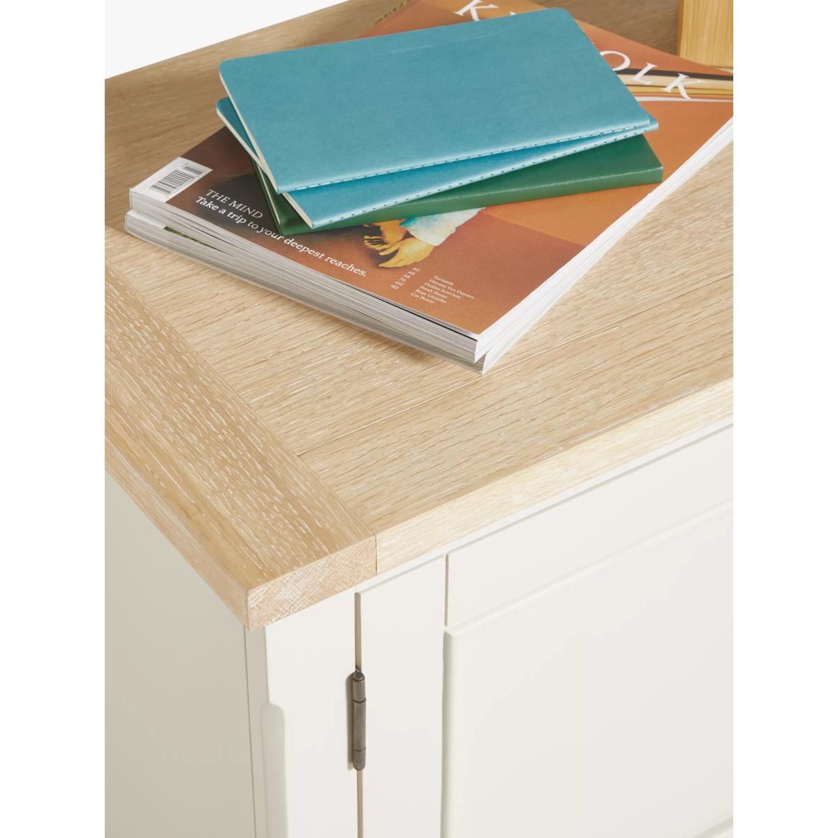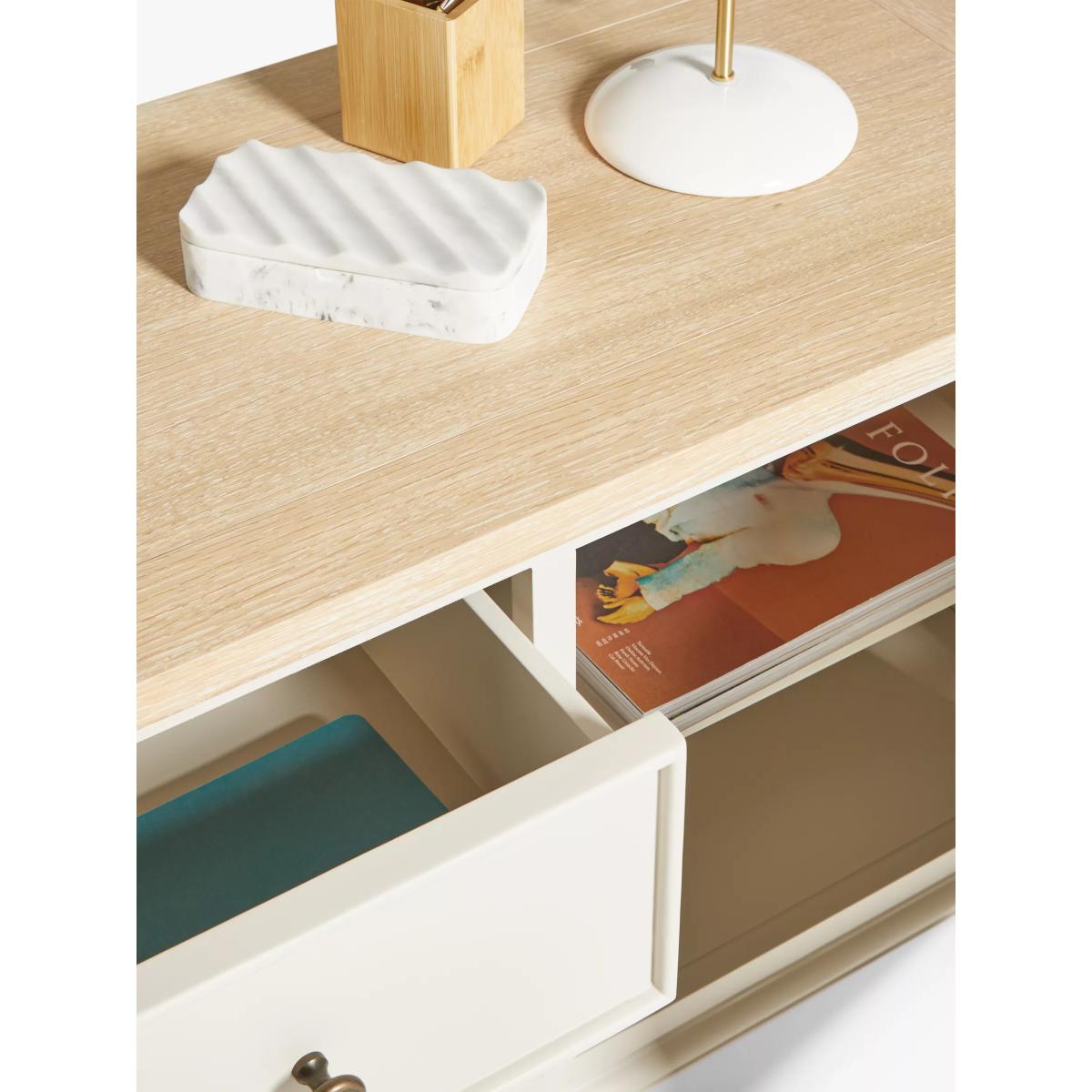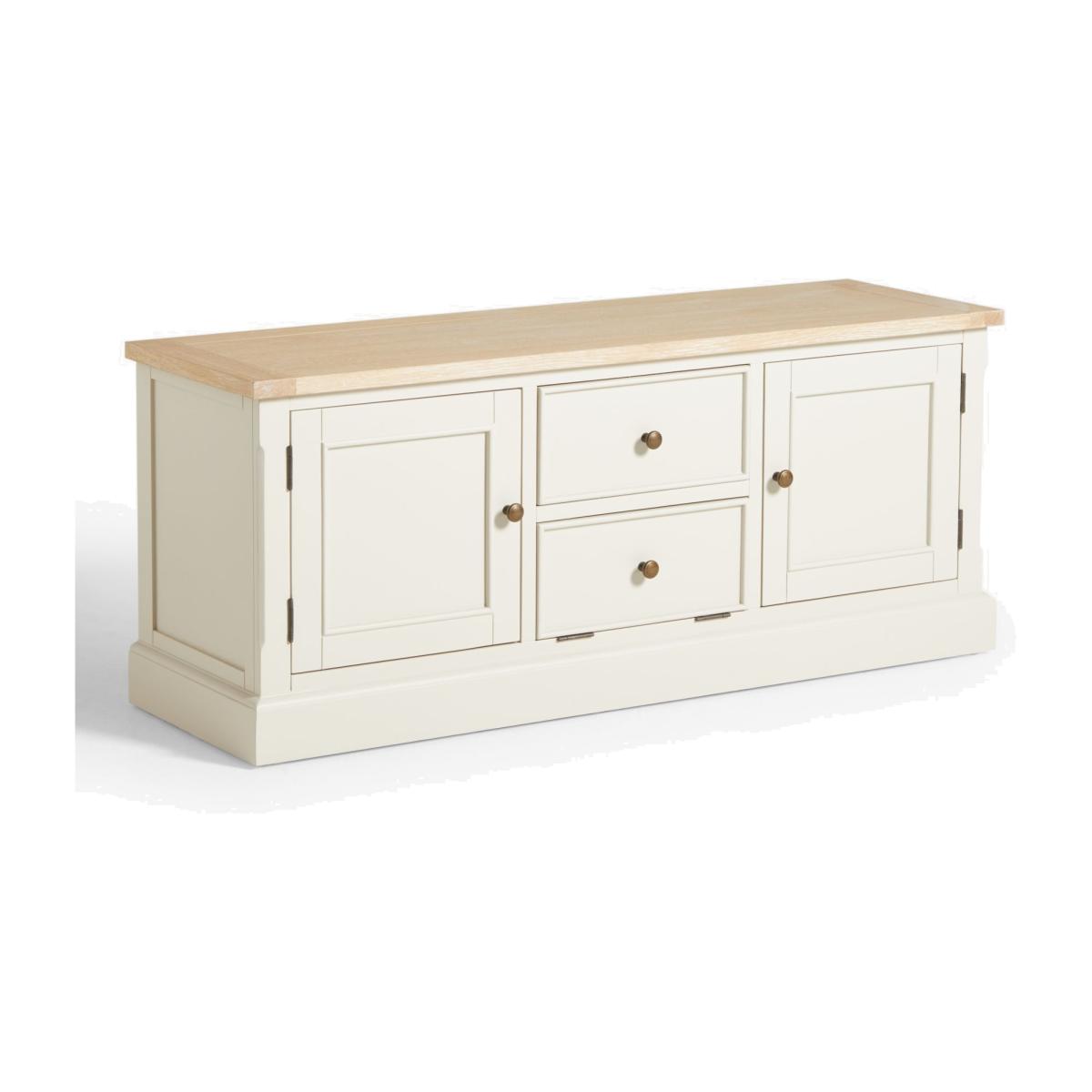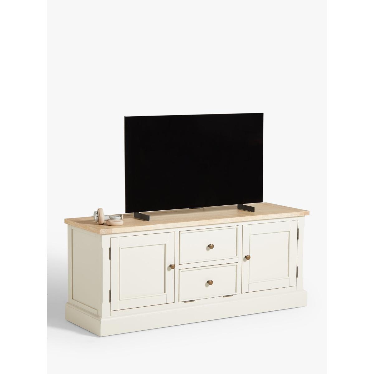 Our Foxmoor media unit is an attractive way to store all your media and features three cable holes at the back so recorders and streaming devices can be stored neatly out of sight. A fold-down flap, disguised as a drawer, makes playing DVD or Blu-Ray discs simple and the top can accommodate a TV up to 60". Maximum loads: 50kg for the top surface, 10kg for the shelf. Foxmoor offers modern country style for a fresh and calming space you'll love to come home to. Details include hand-glazed oak veneer framed tops, elegantly turned legs and Shaker-style doors and drawers with beaded detailing. The hardwearing paint finish is beautifully complemented by aged brass effect handles and barrel hinges and coordinates well with other soft tones, as well as natural materials such as wicker and linen. All the wood used in our Foxmoor furniture range is FSC certified. By choosing this product you are supporting responsible management of the world's forests. The Forest Stewardship Council® (FSC®) is a global, not-for-profit organisation that helps take care of forests and the people and wildlife that call them home. To learn more, visit fsc.org. Want to see it first? You may want to see and get a feel for the furniture in one of our shops before ordering. We'll be able to tell you where the range you'd like to view is on display.
