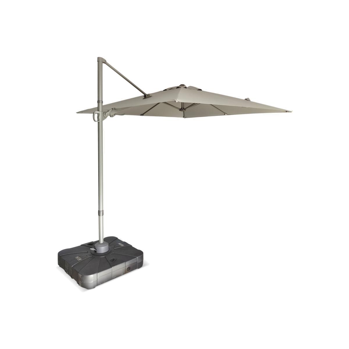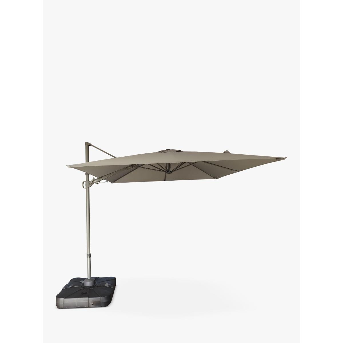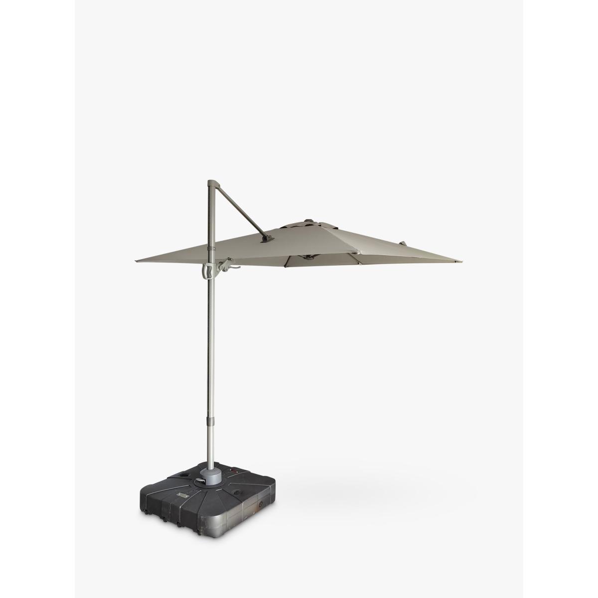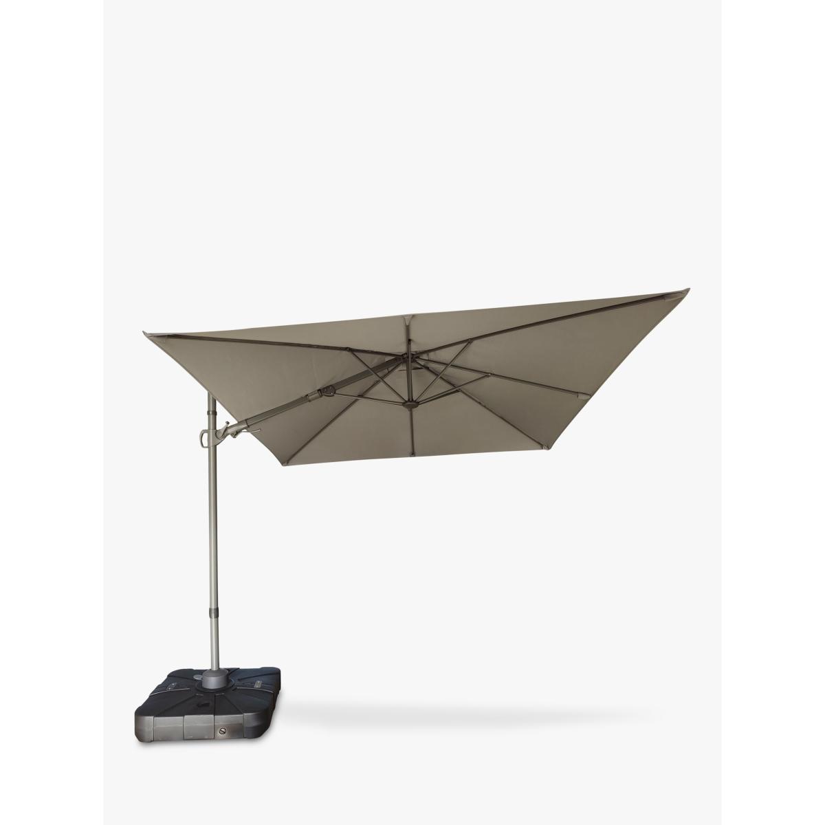 Control protection from the sun with this large, easily adjusted freestanding parasol, providing plenty of shade to keep you and your guests cool while dining in your garden or on your patio. With a wind-up cantilevered operation to open and adjust the height, it features UV50+ sun protection with 360-degree rotation and a sturdy base. It's made with a corrosion-resistant aluminium pole and an all-weather polyester fabric canopy. Fill the included base with sand and water to weigh it down in your chosen location in the garden. Make sure that you're happy with your parasol's location before filling the base. Good to know: The parasol is designed for sun shade protection only. In windy weather, take down the parasol and store safely. Want to see it first? You may want to see and get a feel for the product in one of our shops before ordering. We'll be able to tell you where the range you'd like to view is on display.
