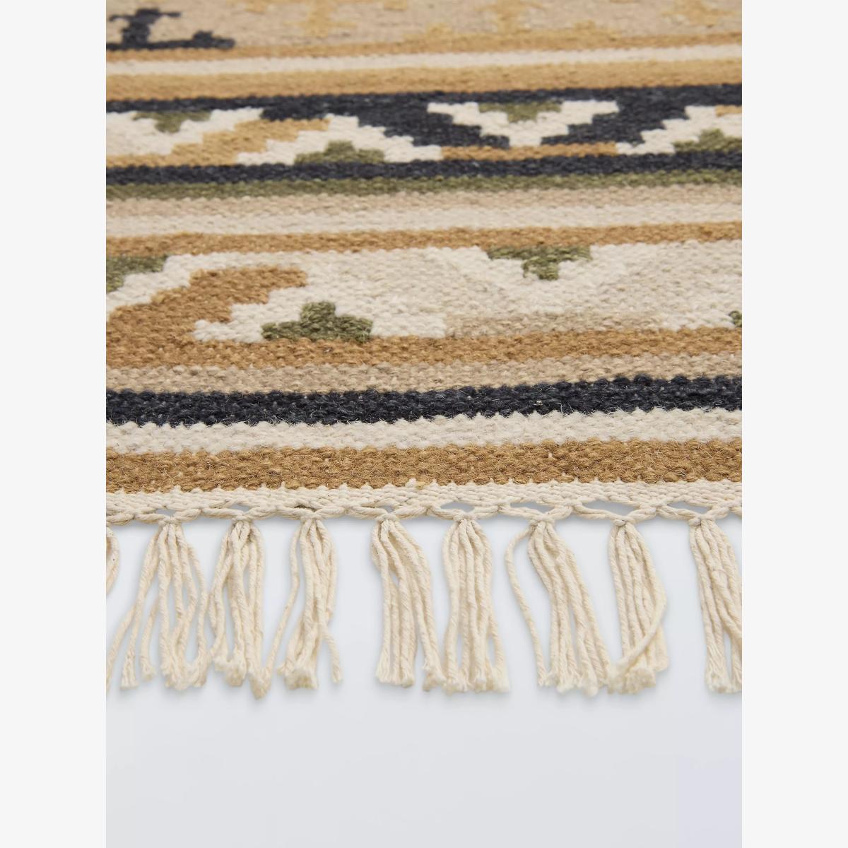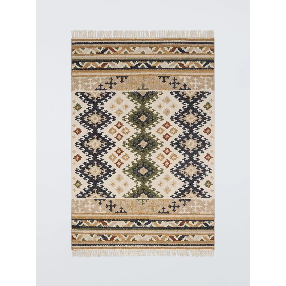 With a geometric pattern inspired by centuries of traditional rug design, this vibrant floor covering is made from a soft wool-cotton blend and comes with relaxed tassels at either end. About your new rug We recommend John Lewis & Partners Rug Hold Underlay. It prevents your rug from moving underfoot and protects against colour transfer to the floor As this rug is made using natural fibres, shedding is to be expected. This will reduce over time, and should not have an impact on the lifespan or performance of your rug. When you first get your rug, please use the brush attachment on your vacuum cleaner whilst the shedding dies down. After that, when vacuuming your rug, use suction only. Rotating brushes may damage the fibres. When vacuuming your rug, use suction only. Rotating brushes may damage the fibres Blot any spills with a clean, dry cloth. Do not rub or use harsh detergents. Attend to spillages immediately and blot with a clean, dry cloth to prevent staining. Dilute a small amount of appropriate carpet shampoo in water. Dampen a colourfast cloth in the diluted shampoo solution and dab the rug, lightly agitating, moving in the direction of the pile. Treat the whole rug and not just the affected area. To restore the appearance of the affected area, use a soft bristled brush to gently comb in the direction of the pile. Allow the rug to thoroughly dry.