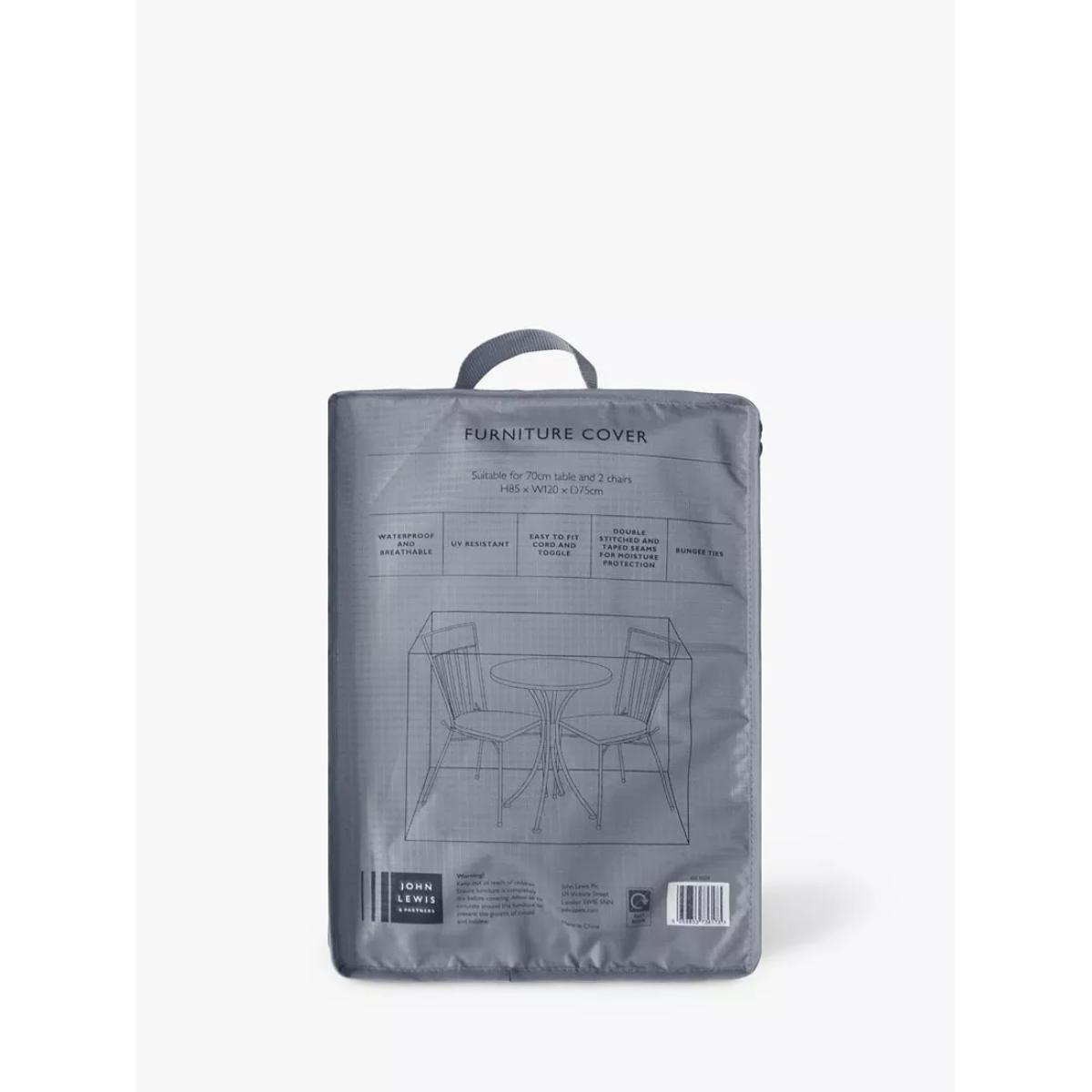 A protective cover for the John Lewis 70cm garden bistro table and two chairs set. It's waterproof with taped seams for better protection yet breathable with built-in ventilation to prevent mildew. The cover comes with a cord toggle and bungee ties for an easy, secure fit. Made from strong 420. D polyester with UV30+ sun protection for all-year-round use.