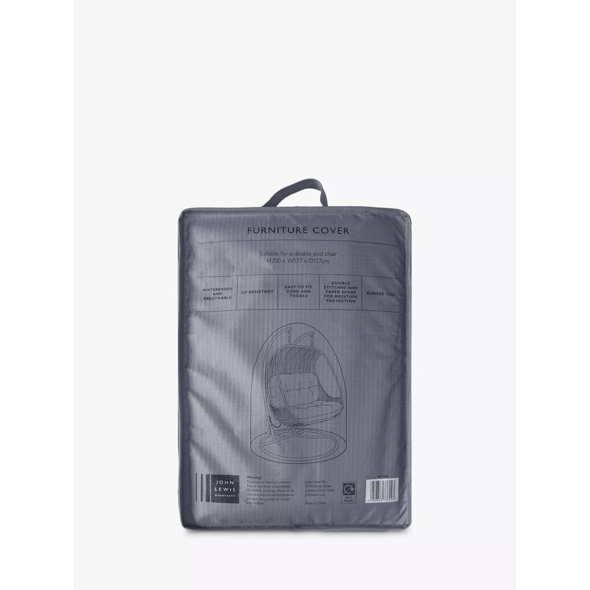 A protective cover for the John Lewis garden double pod chair. It's waterproof with taped seams for better protection yet breathable with built-in ventilation to prevent mildew. The cover comes with a cord toggle and bungee ties for an easy, secure fit. Made from strong 420. D polyester with UV30+ sun protection for all-year-round use.