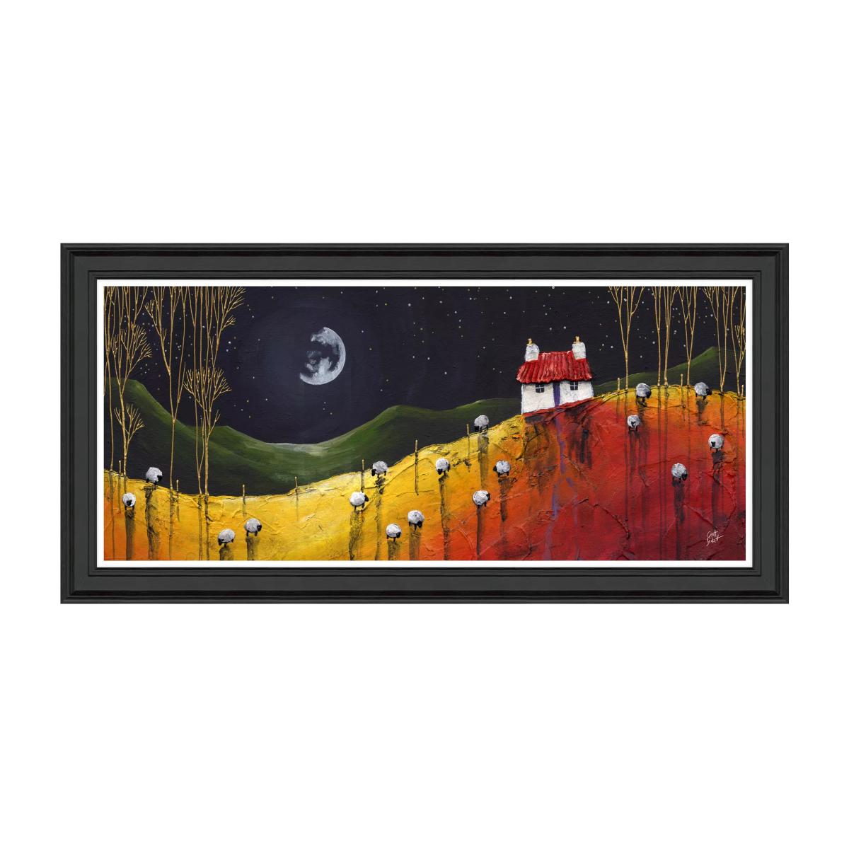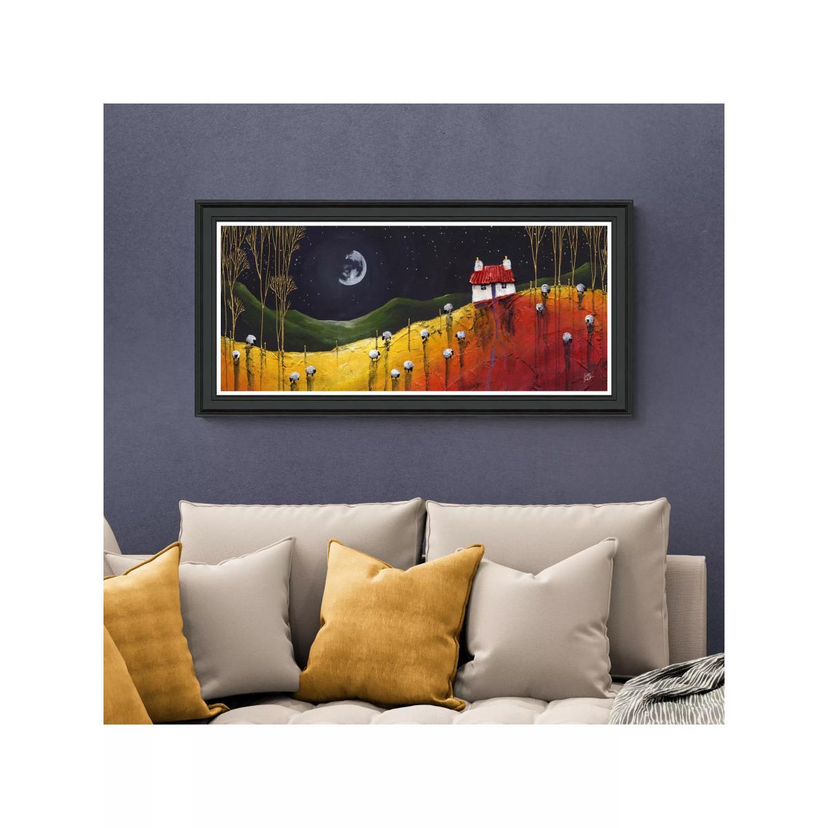 A quirky landscape, 'Counting Sheep' by artist Geoff Beckett. Made in the UK, it's finished with a hand-applied artist's texture gel and presented in a black frame with a white insert, ready to hang on your wall. Geoff Beckett is a Welsh artist who works from his countryside home studio near Malpas on the Cheshire border. A self-taught artist, he grew up on a local farm before gaining a degree in Mathematics and Statistics. He then switched his attention to his artwork and has since made a living from painting. Geoff is known for his quirky paintings that involve layers of texture and colour with a thick resin finish. Have you thought about wall hooks and fittings?
