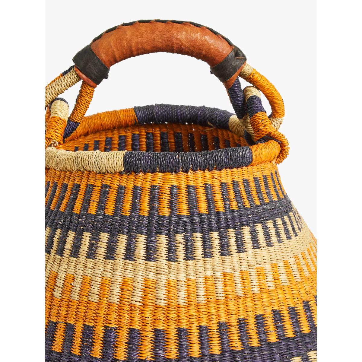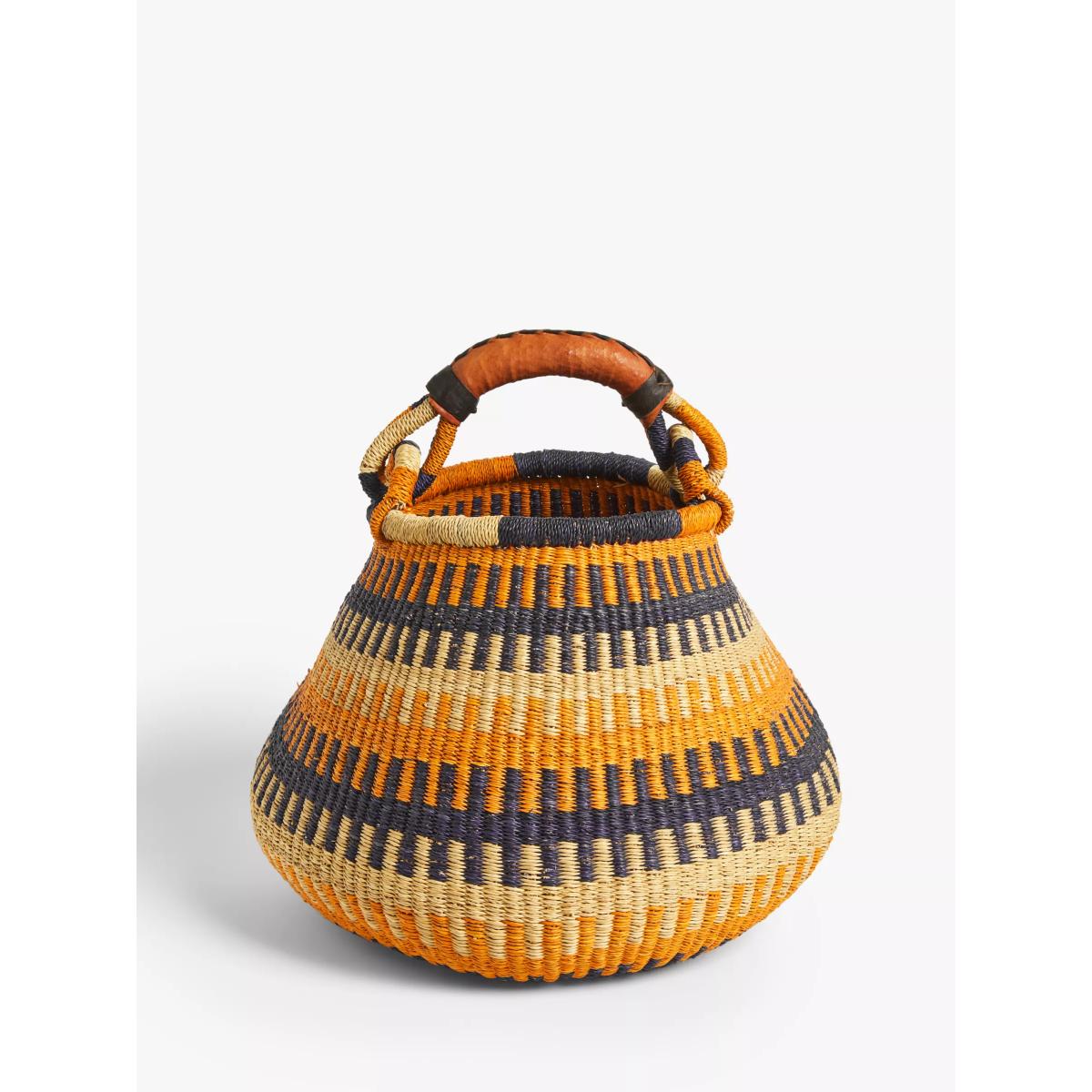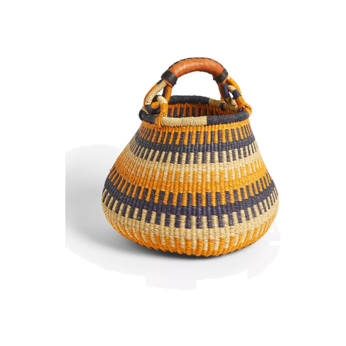 This attractive, handled basket is ideal for storing toiletries or or sewing materials, as as a pretty way of presenting food gifts or even for shopping. It's woven using elephant grass from North African grasslands. This material holds vibrant colours that artisans use to create decorative yet durable pieces using traditional weaving techniques from Ghana villages.
