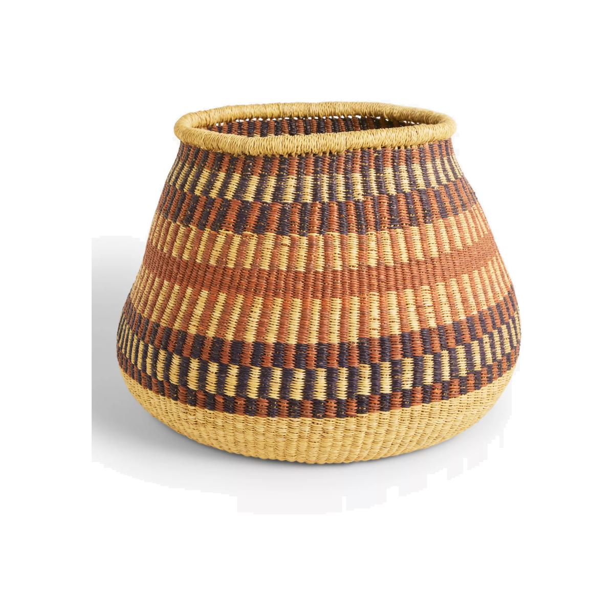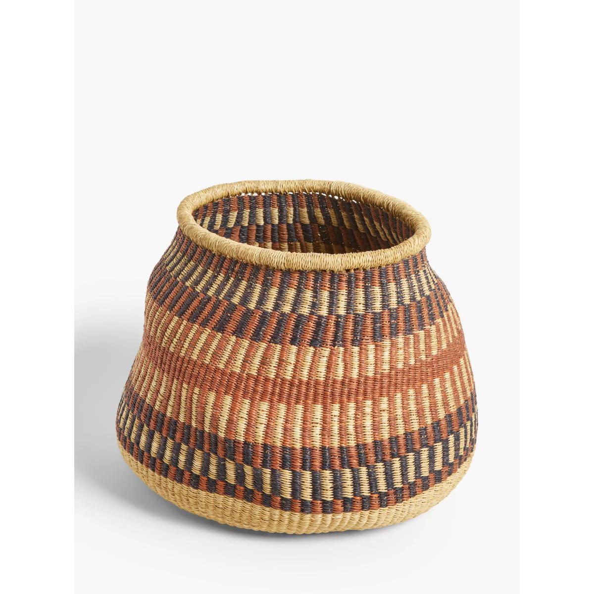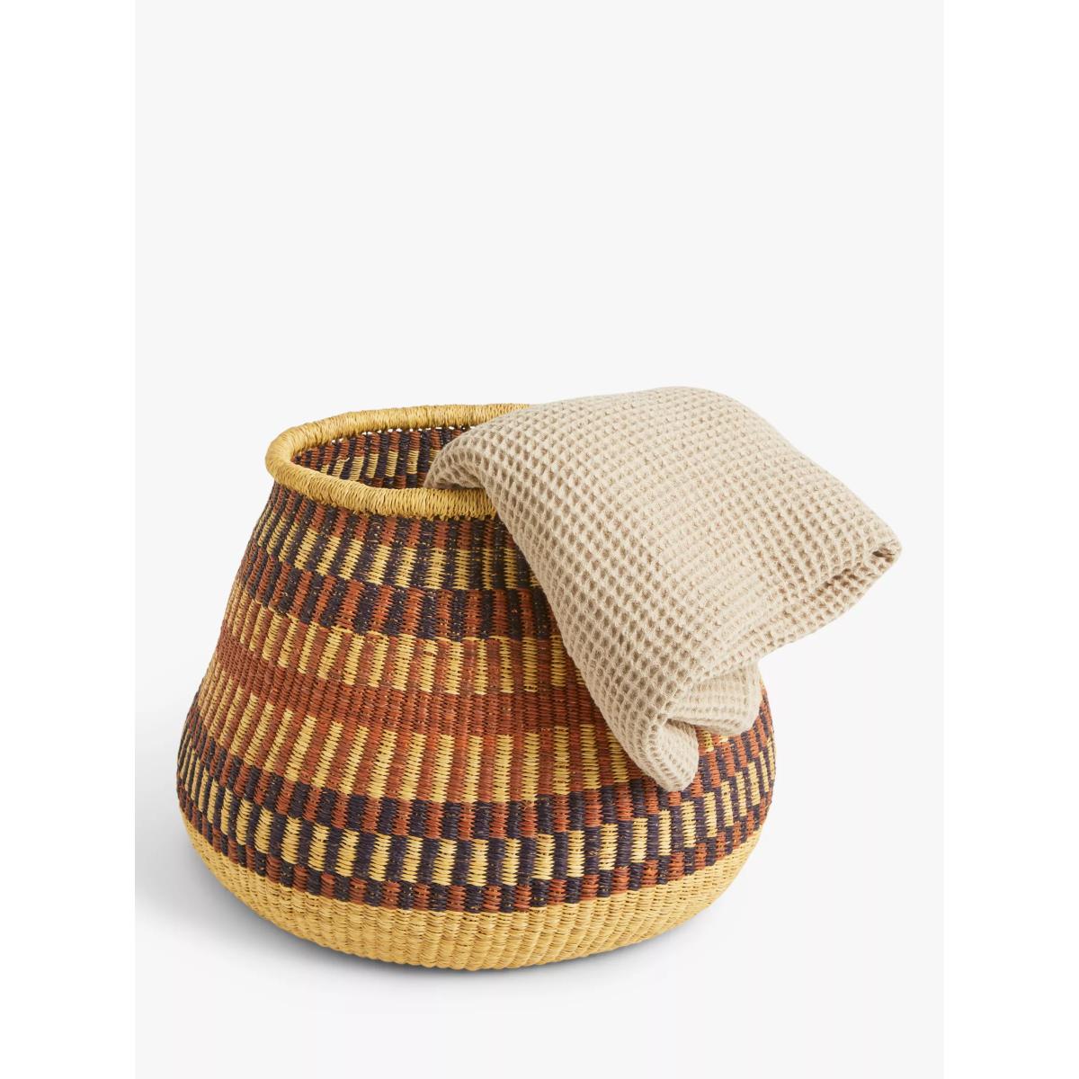 This versatile storage basket is woven using elephant grass from North African grasslands. This material holds vibrant colours that artisans use to create decorative yet durable pieces using traditional weaving techniques from Ghana villages. We've worked with Partner Africa to ensure working conditions are fair. This allows the artisans in the villages to sustain their weaving businesses and teach the women weavers many life skills.