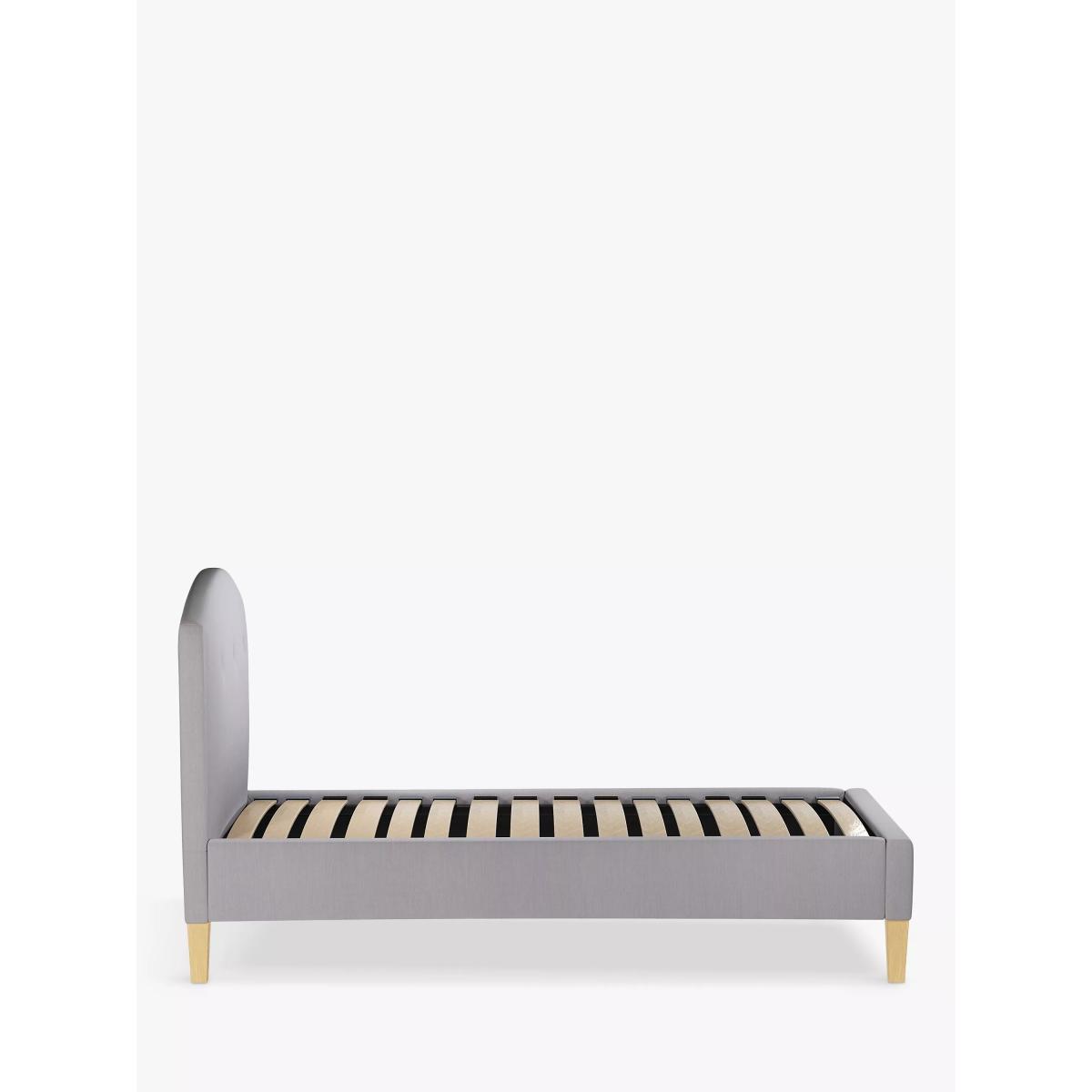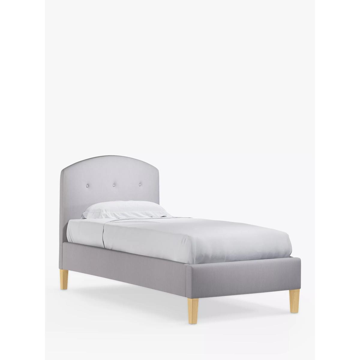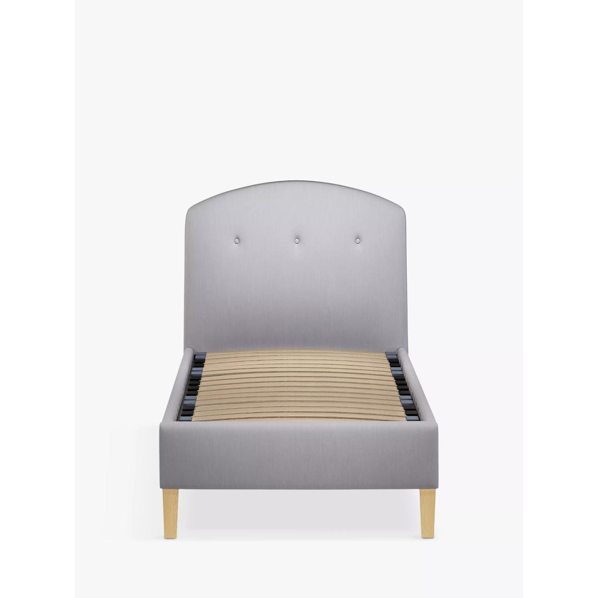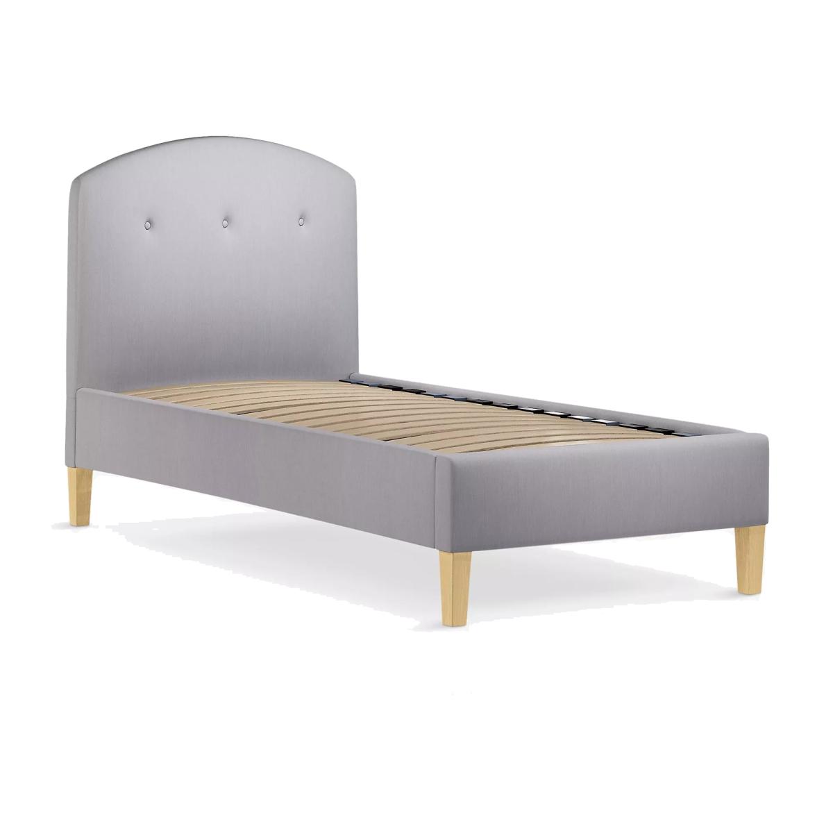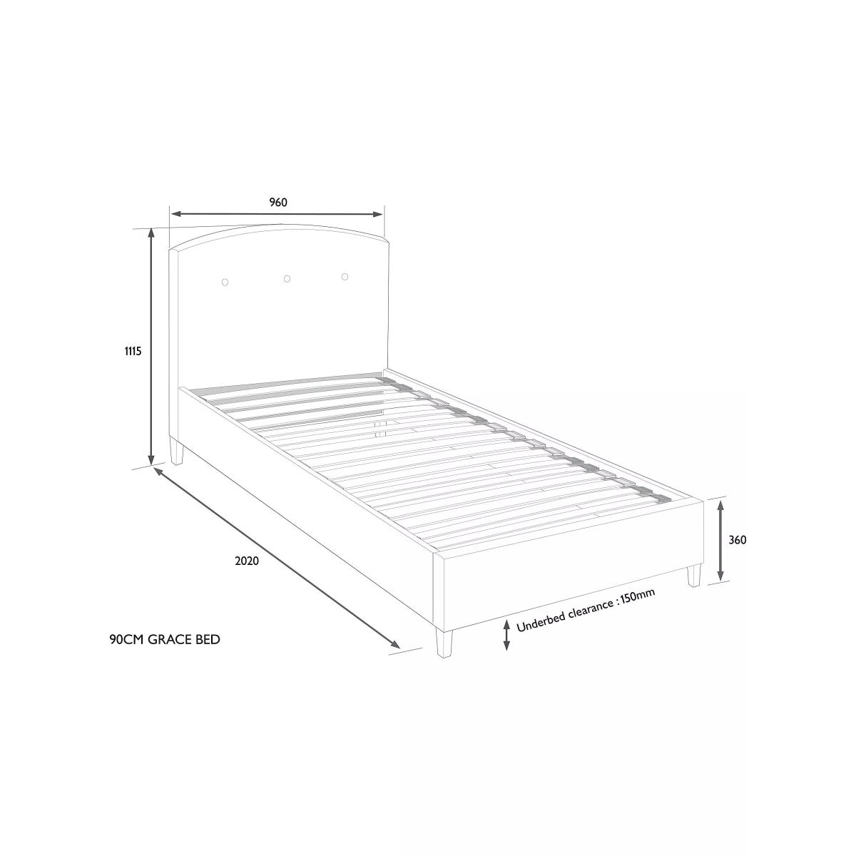Our Grace bed frame is designed with button detailing on its curved headboard, which gives it a smart, yet understated look. It's supported by sturdy wooden legs and there are supportive, sprung slats in the base. We've upholstered it in our Cotton Effect fabric which has a laid-back and fine-textured look that looks like cotton, but it's made from durable polyester fibres. Built with Smart Slats This bed frame is designed with wider slats at the shoulders, lumbar and feet. They provide maximum support for you and your mattress so that you experience perfect spinal alignment while you sleep. The standard slat caps are black so we have added grey slat caps to ensure that you know where to place the wider slats. Worth Knowing: Child Compliant bed frames This bed conforms to BS 8509:2008+A1:2011 (Childrens beds for domestic use. Safety requirements and test methods). We recommend it is used with a standard single mattress, L190 x W90cm. Not suitable for children under the age of 4 years.