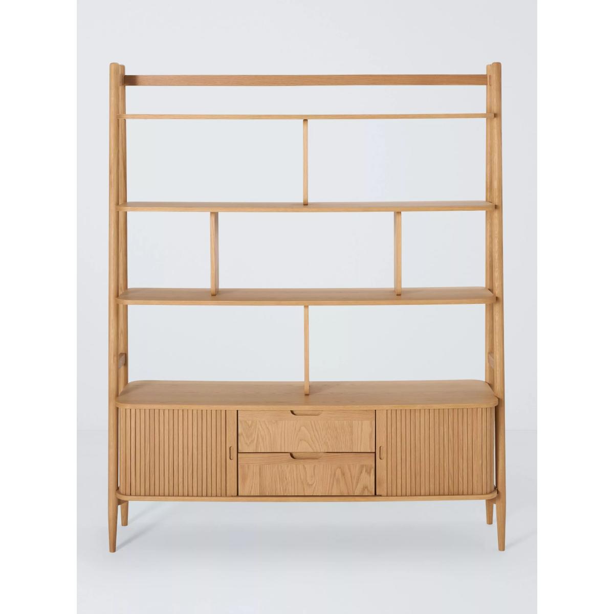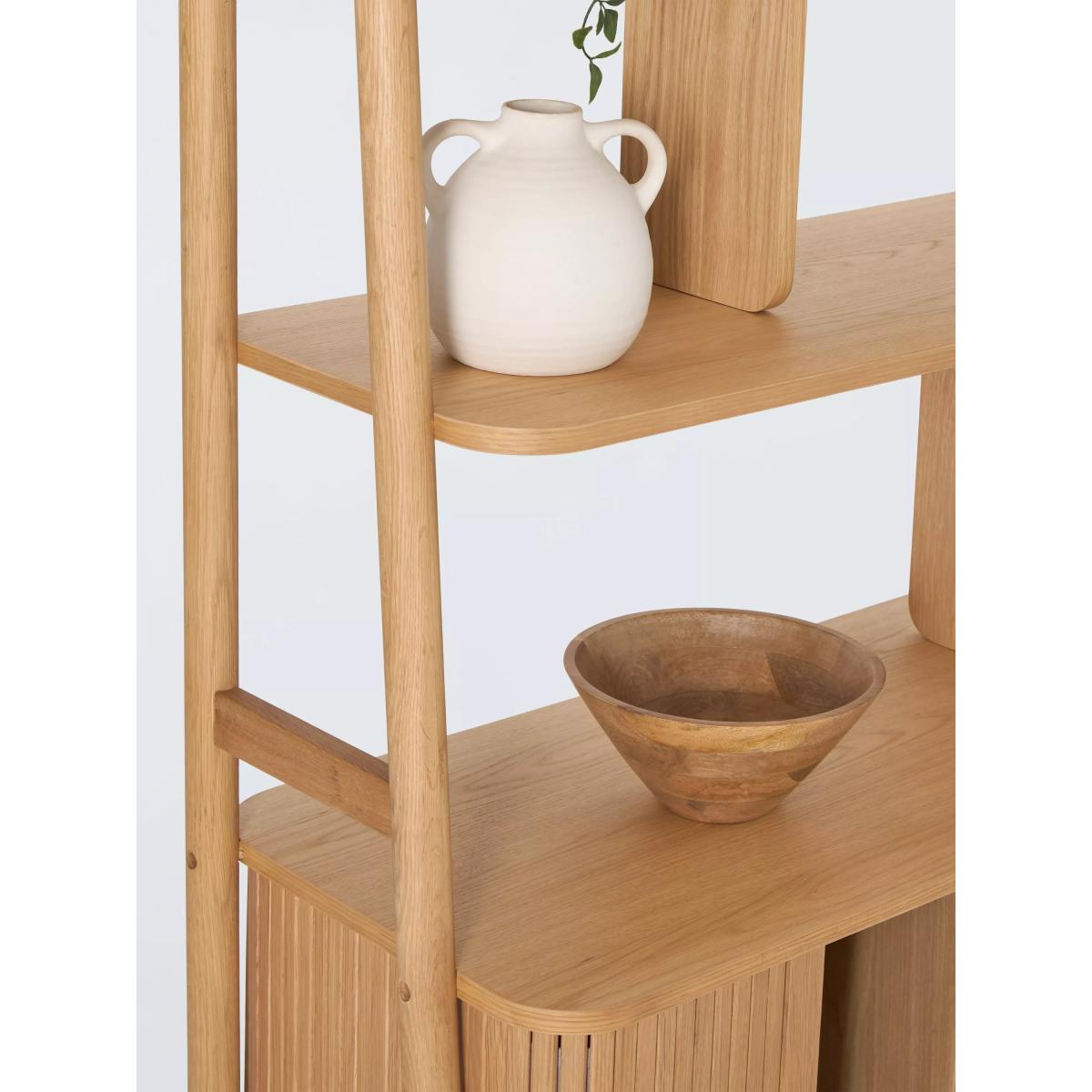 Built from high-quality wood in a veneered finish, this shelving unit features a storage cabinet section as well as three shelves. The cabinet is designed with slatted doors that glide open for easy access and the spindle-shaped, tapered legs celebrate sleek, Scandi-inspired design. This oak option is made from solid oak and MDF with oak veneer and oak effect foil. Want to see it first? You may want to see and get a feel for the furniture in one of our shops before ordering. We'll be able to tell you where the range you'd like to view is on display.