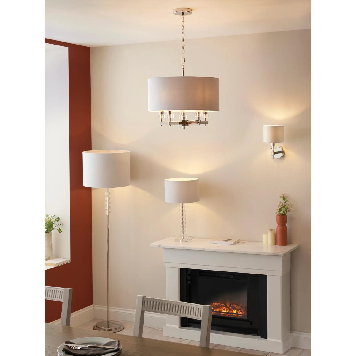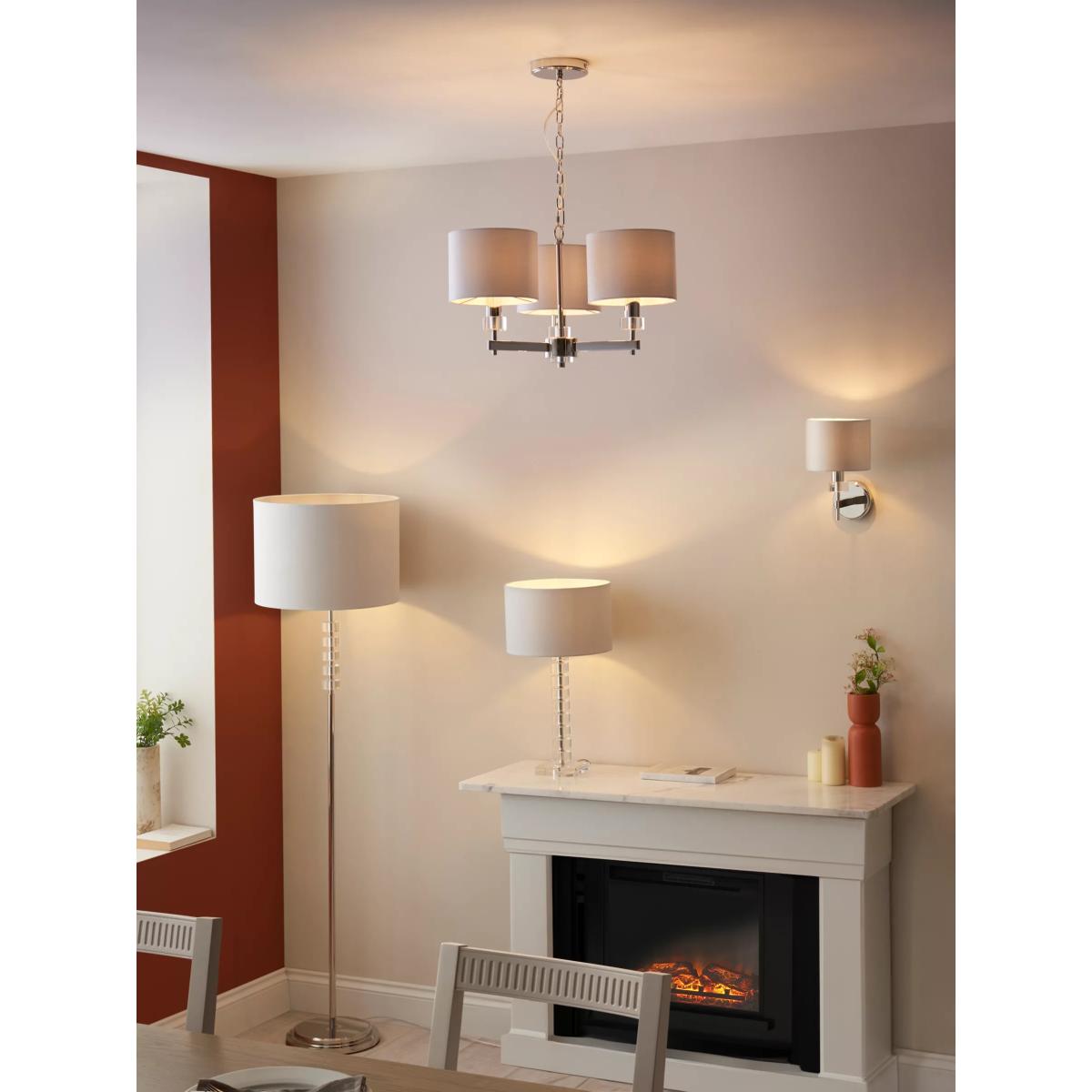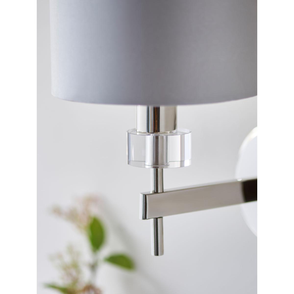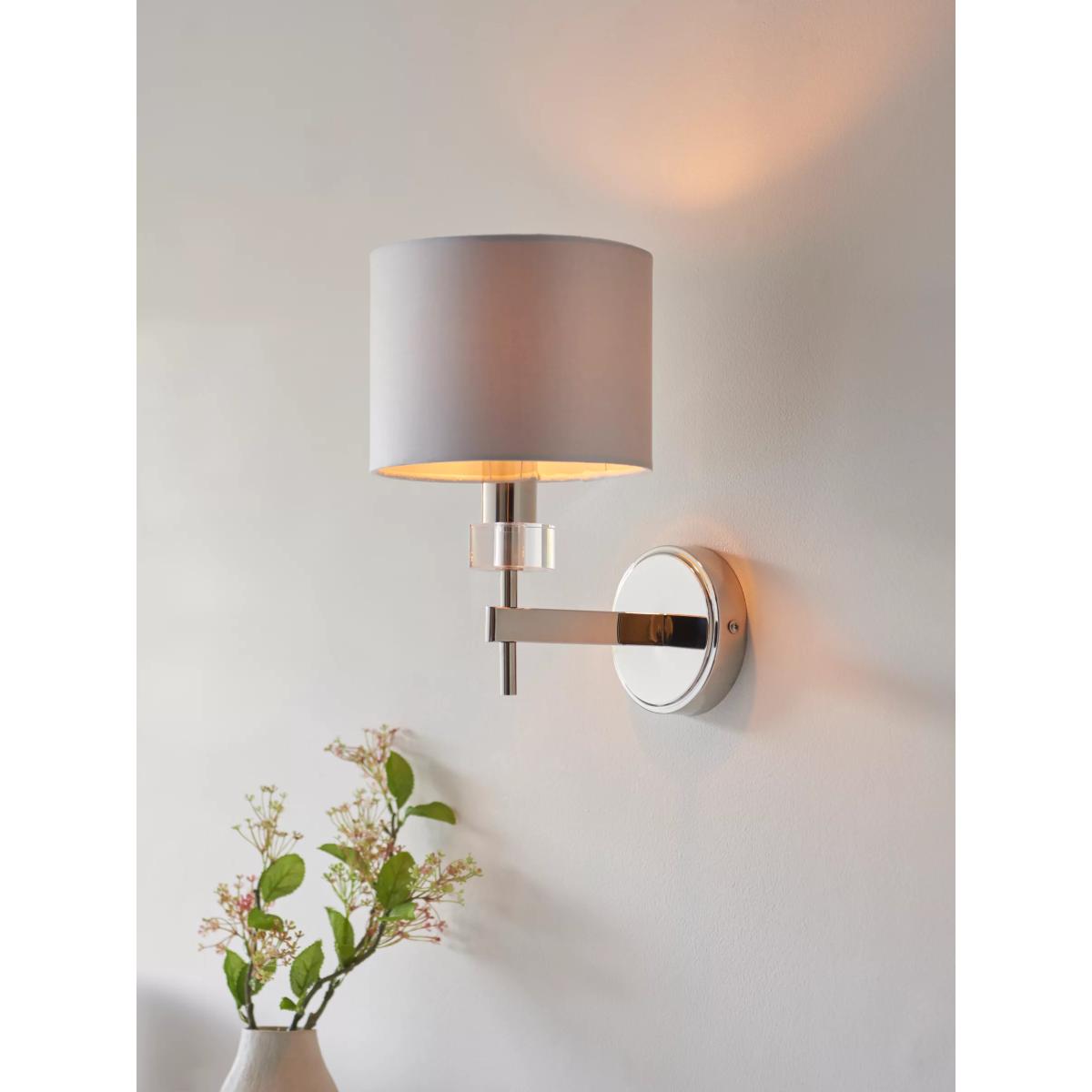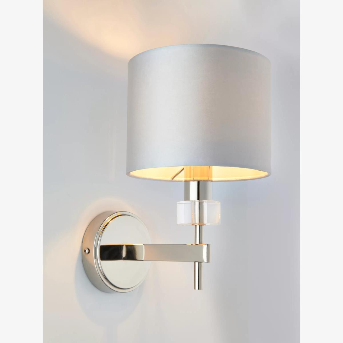 Crisp modern luxury. Our Greta range of lighting features bespoke cut-glass cylinders. Polished nickel metalwork surfaces complement the glasswork. This statement Greta wall light has a single faux-silk drum shade with a soft sheen on the outside and on the lining. A dimmable light for a modern bedroom or living room.