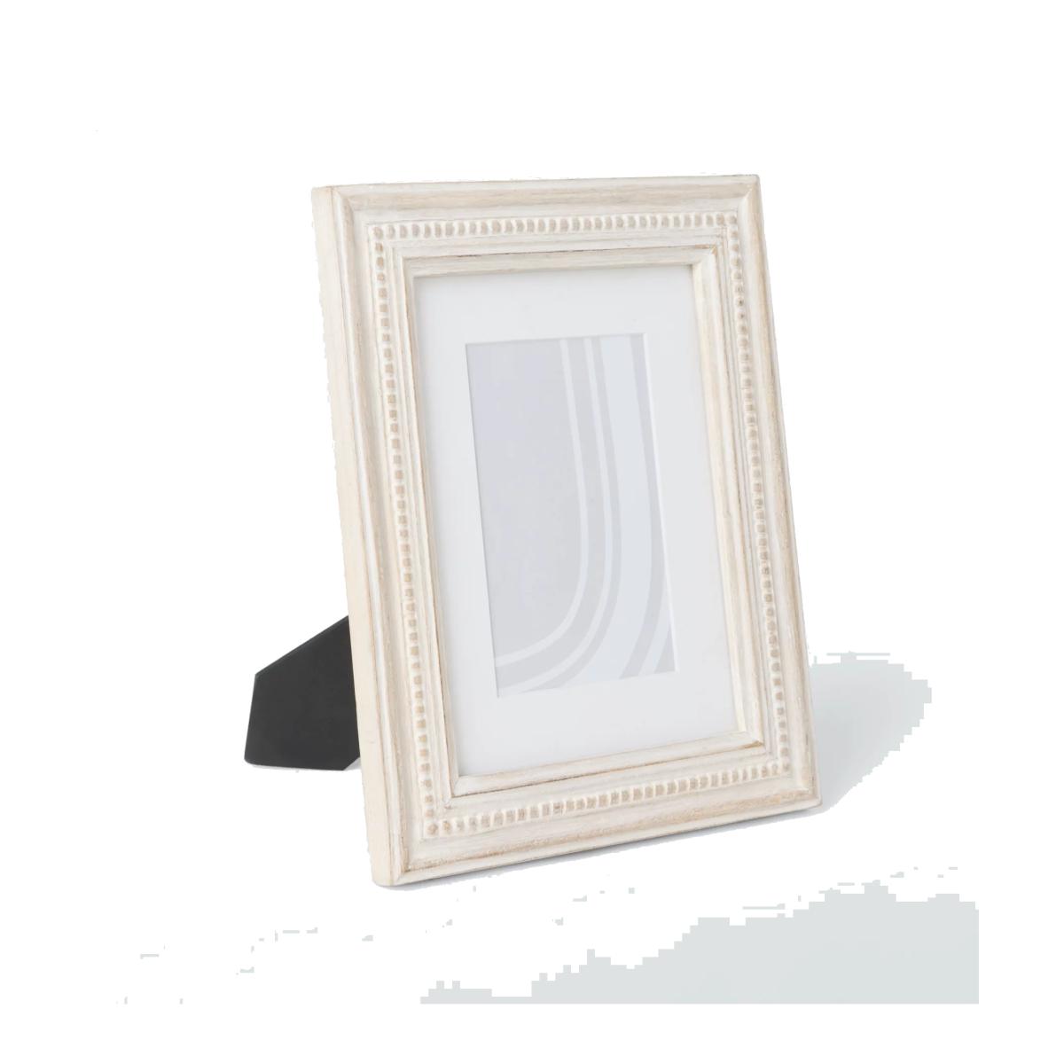 Hand-carved wood photo frame with decorative beading. The whitewash finish creates a coastal-inspired look. Display freestanding, vertically or horizontally, or wall-mount vertically using the fitting on the back. The aperture measurements in inches are rounded measurements worked back from standard centimetre sizes.