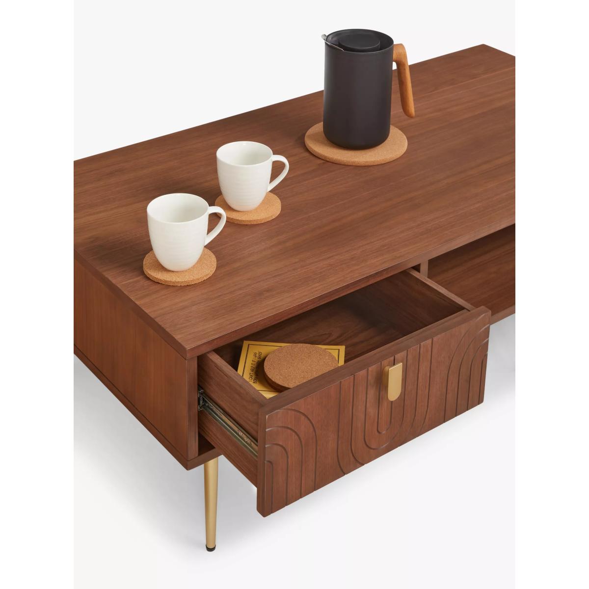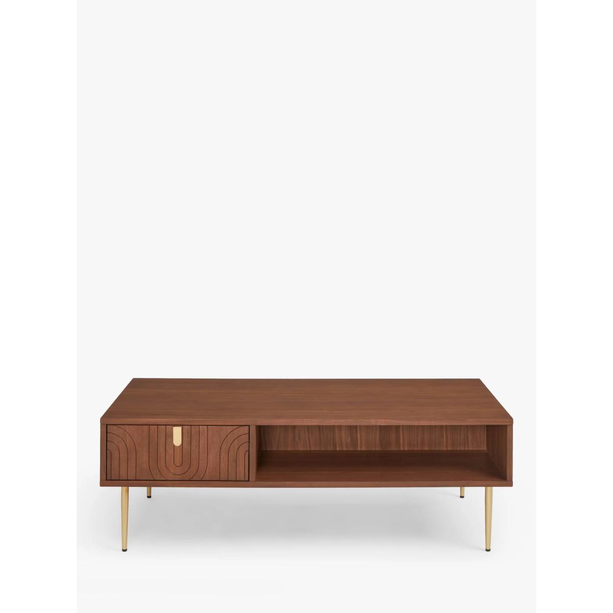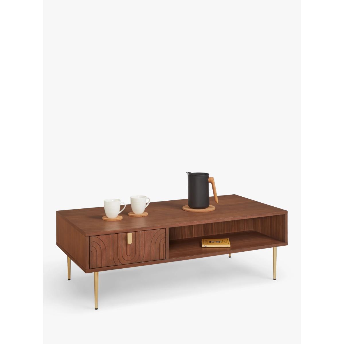 Our Harvard range of furniture combines Art-Deco style with modern shapes to inject character into your space. This coffee table is made from MDF and walnut veneers and features a shelf and drawer to keep the table top clutter-free. We love the fluid pattern inset on the drawer front, as well as the gold finish handle and tapered legs, all of which add to its sleek look. Want to see it first? You may want to see and get a feel for the furniture in one of our shops before ordering. We'll be able to tell you where the range you'd like to view is on display. Want to see it first? You may want to see and get a feel for the furniture in one of our shops before ordering. We'll be able to tell you where the range you'd like to view is on display.