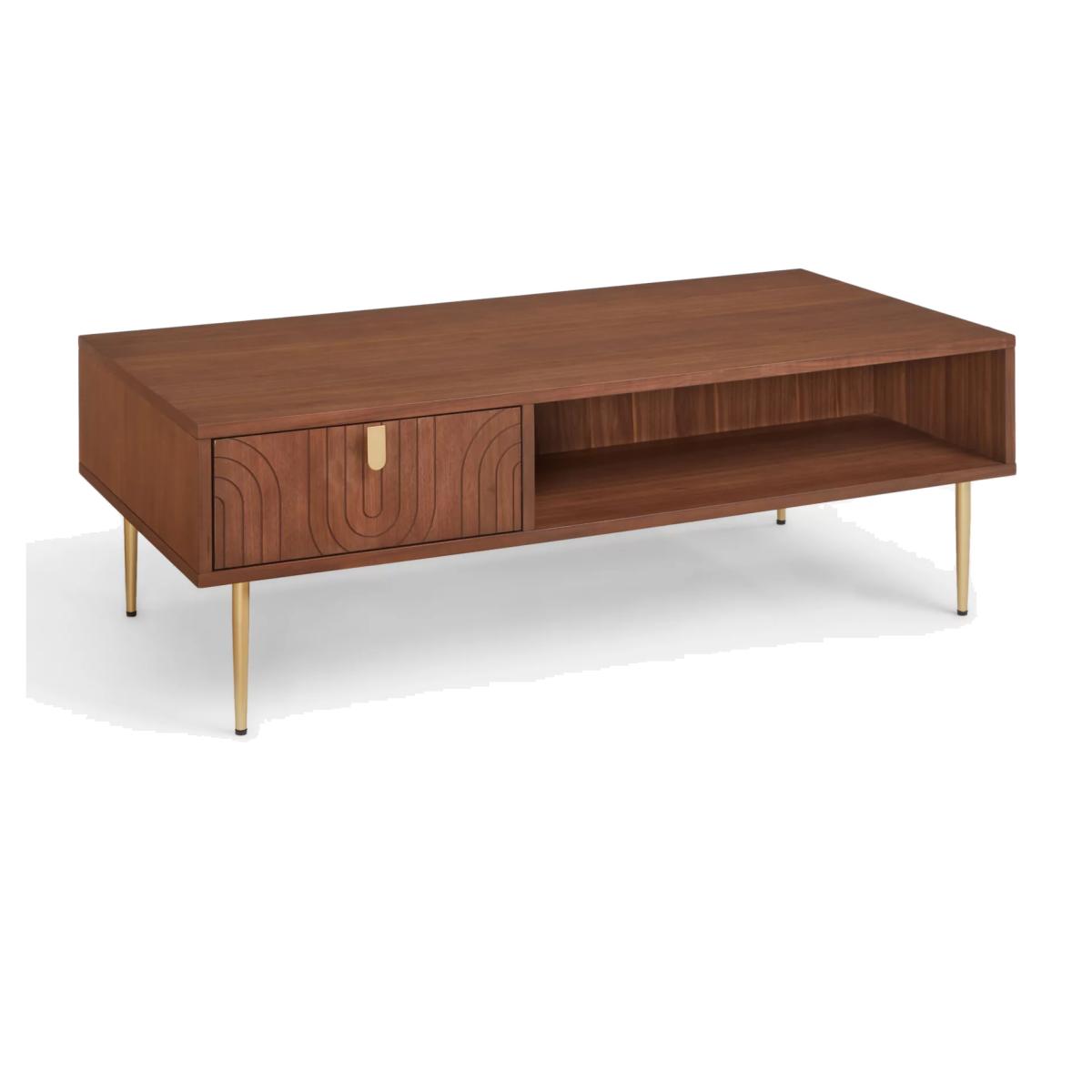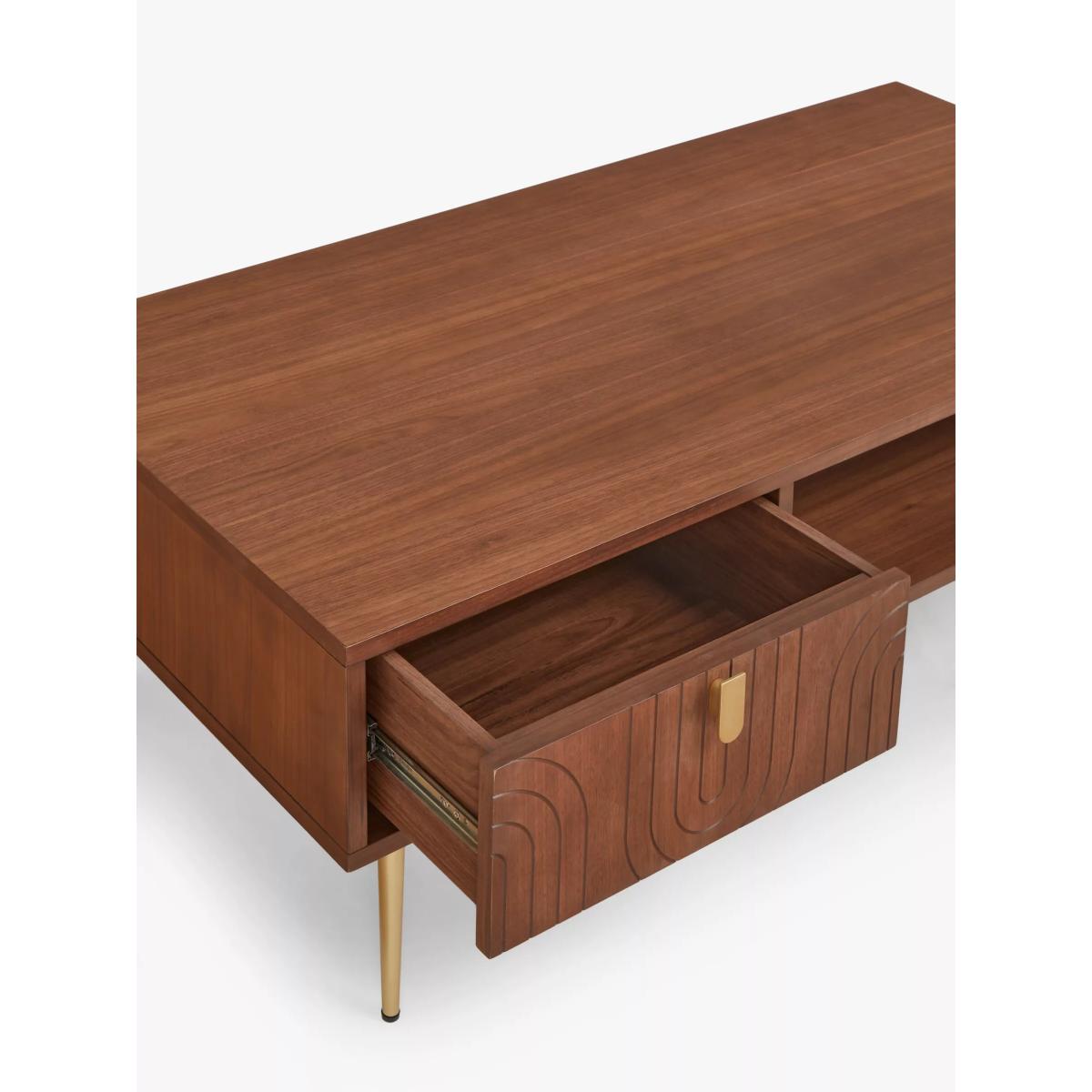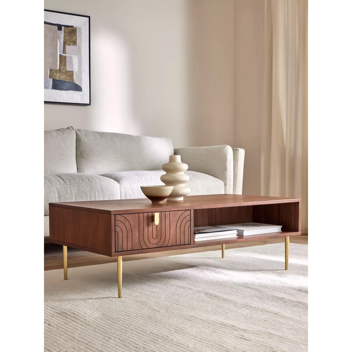 Our Harvard range of furniture combines Art-Deco style with modern shapes to inject character into your space. This coffee table is made from MDF and walnut veneers and features a shelf and drawer to keep the table top clutter-free. We love the fluid pattern inset on the drawer front, as well as the gold finish handle and tapered legs, all of which add to its sleek look. Want to see it first? You may want to see and get a feel for the furniture in one of our shops before ordering. We'll be able to tell you where the range you'd like to view is on display. Want to see it first? You may want to see and get a feel for the furniture in one of our shops before ordering. We'll be able to tell you where the range you'd like to view is on display.