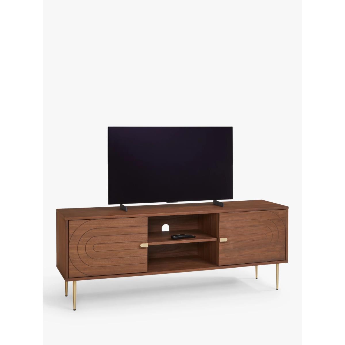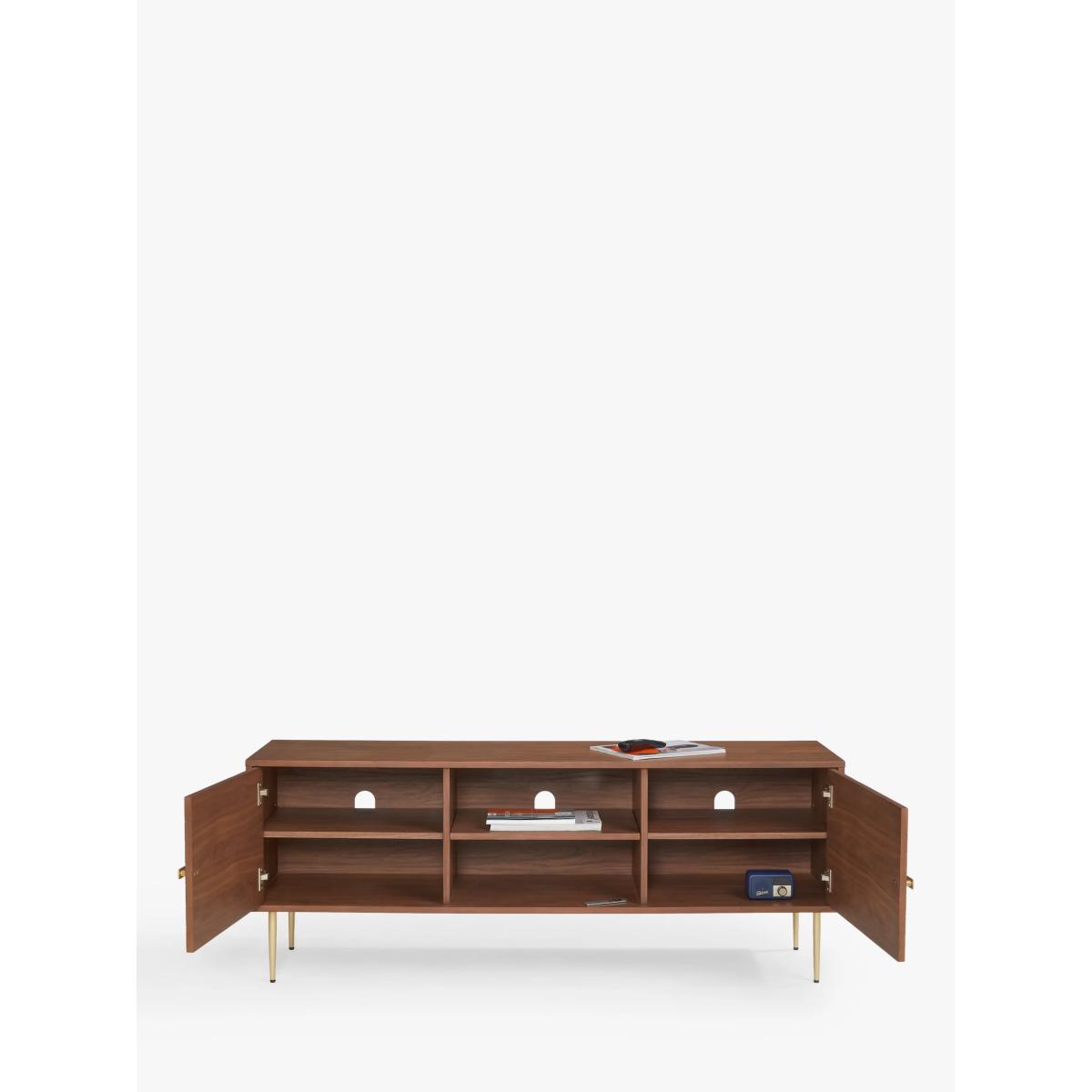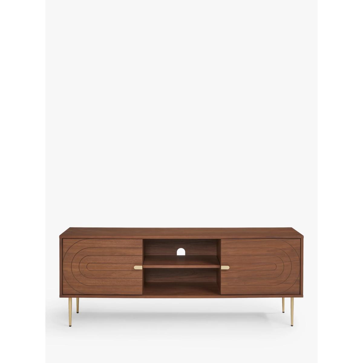 Our Harvard range of furniture combines Art-Deco style with modern shapes to inject character into your space. This TV stand is made from sturdy MDF and walnut veneers in a painted finish and features a central shelf section and two cupboard sections, each designed with an adjustable shelf inside. We love the fluid pattern inset on the door fronts, as well as the brass finish handles and tapered legs, all of which add to its sleek look. Plus, cable management holes at the back help to keep long cables tidy and organised. Want to see it first? You may want to see and get a feel for the furniture in one of our shops before ordering. We'll be able to tell you where the range you'd like to view is on display.
