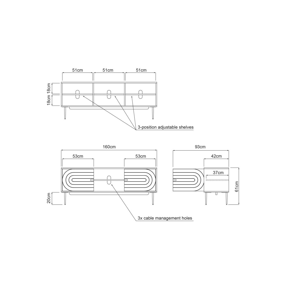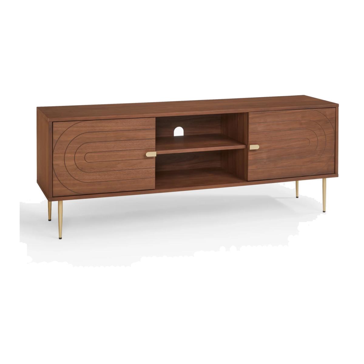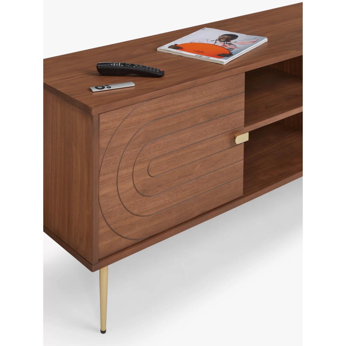 Our Harvard range of furniture combines Art-Deco style with modern shapes to inject character into your space. This TV stand is made from sturdy MDF and walnut veneers in a painted finish and features a central shelf section and two cupboard sections, each designed with an adjustable shelf inside. We love the fluid pattern inset on the door fronts, as well as the brass finish handles and tapered legs, all of which add to its sleek look. Plus, cable management holes at the back help to keep long cables tidy and organised. Want to see it first? You may want to see and get a feel for the furniture in one of our shops before ordering. We'll be able to tell you where the range you'd like to view is on display.