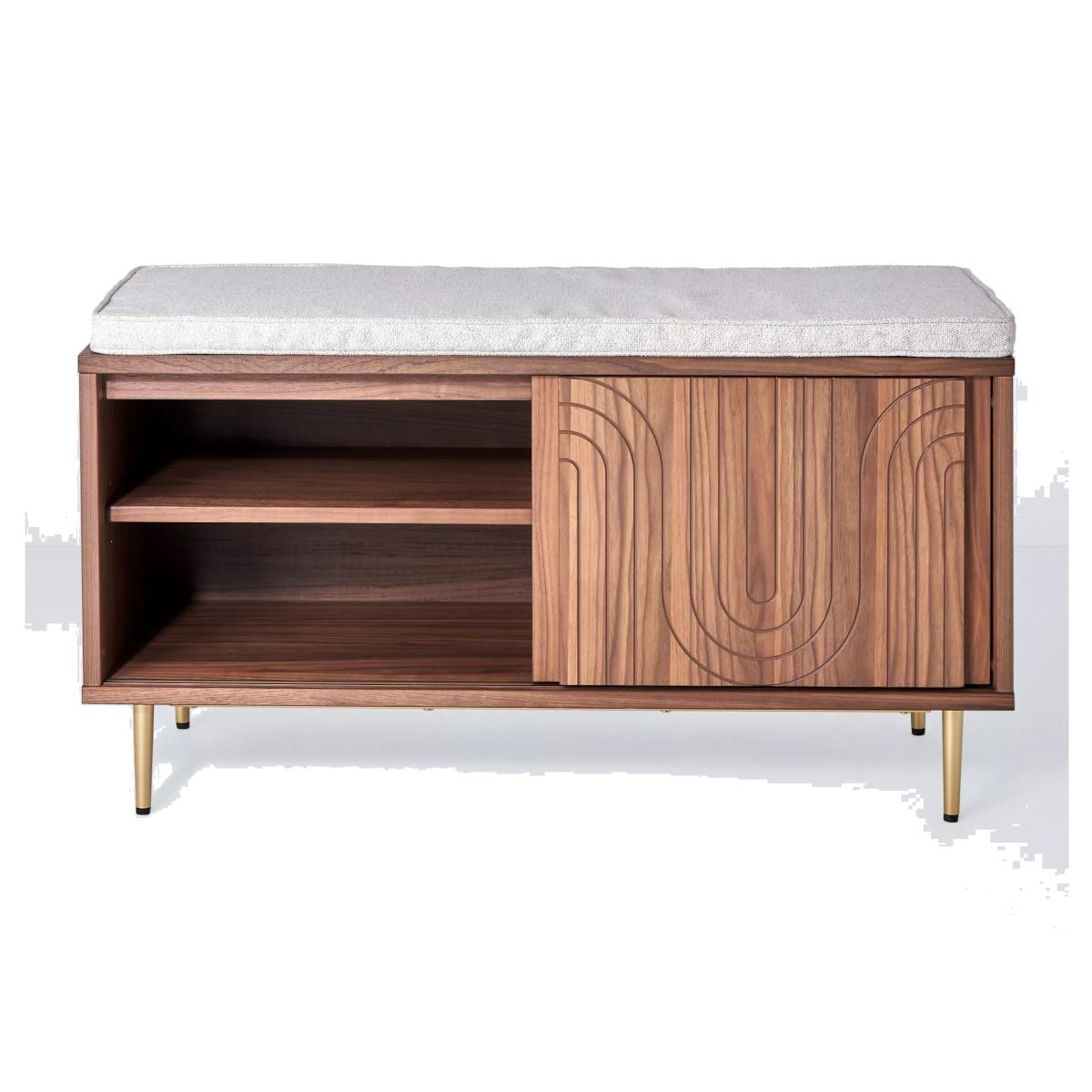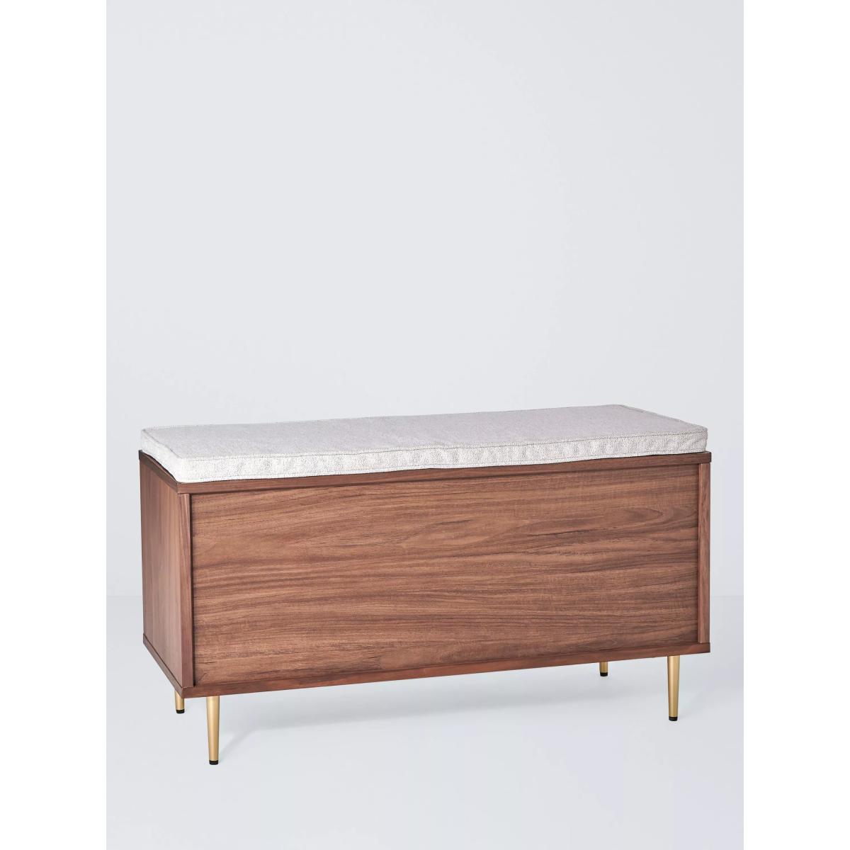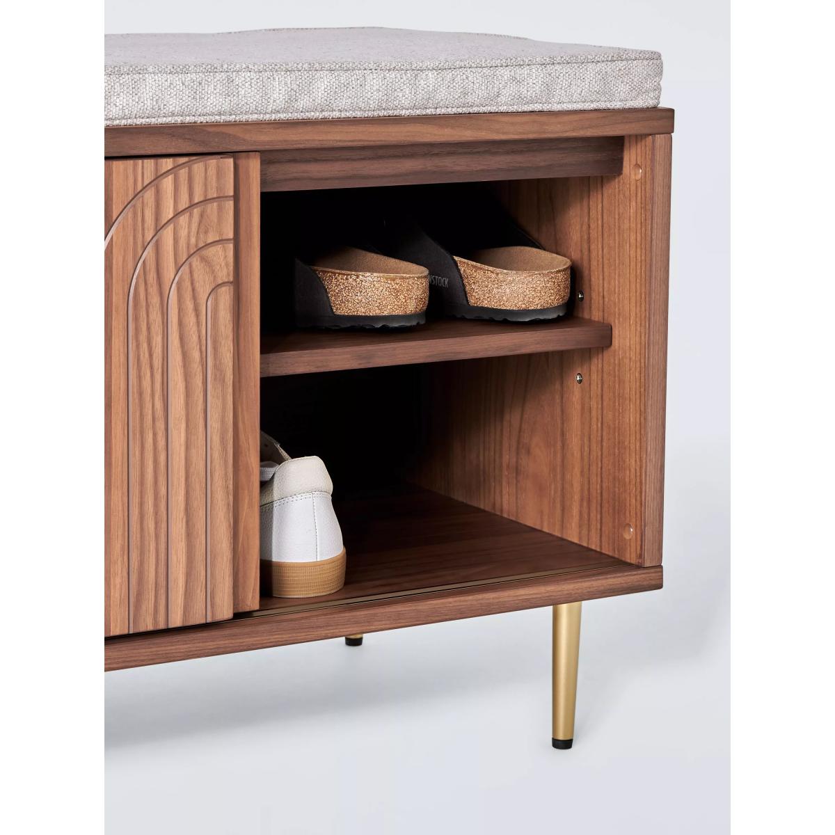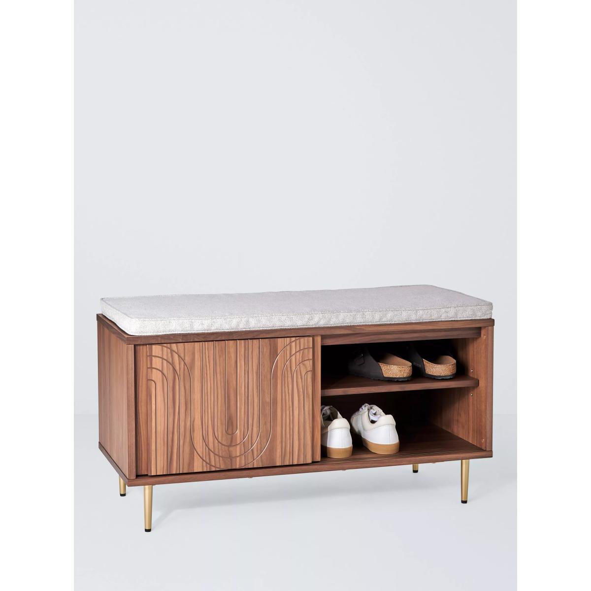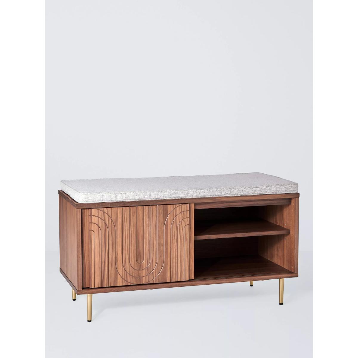 Our Harvard range of furniture combines Art-Deco style with modern shapes to inject character into your space. This storage bench is made from MDF and walnut veneers and features a central shelf with a sliding door. We love the fluid pattern inset on the door front, as well as the tapered legs, both of which add to its sleek look. Its elegant practicality will make a great addition to your hallway. Want to see it first? You may want to see and get a feel for the furniture in one of our shops before ordering. We'll be able to tell you where the range you'd like to view is on display.