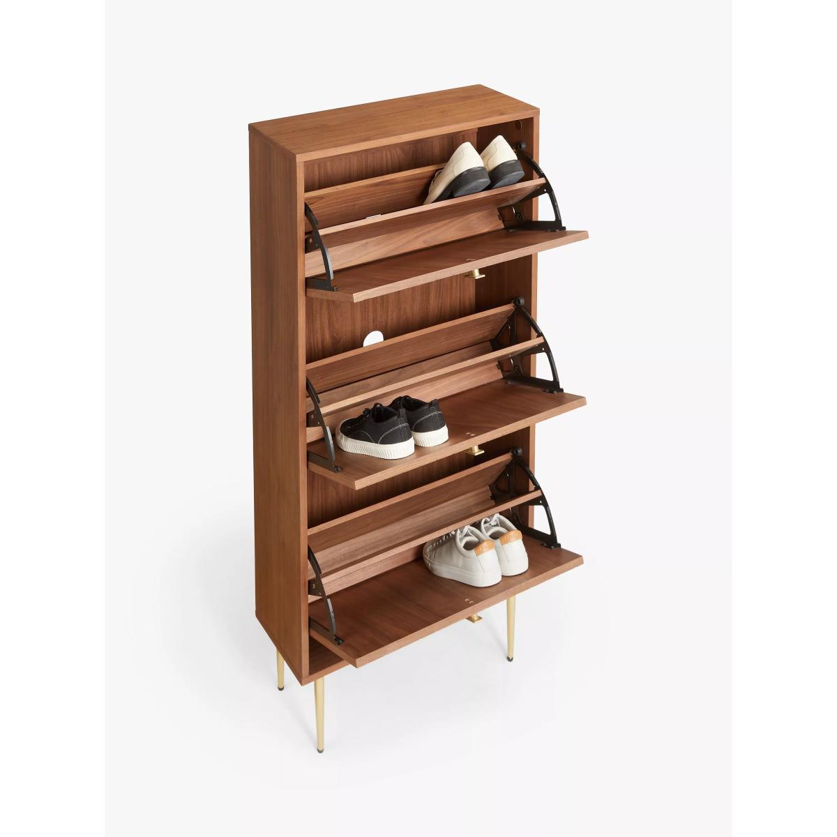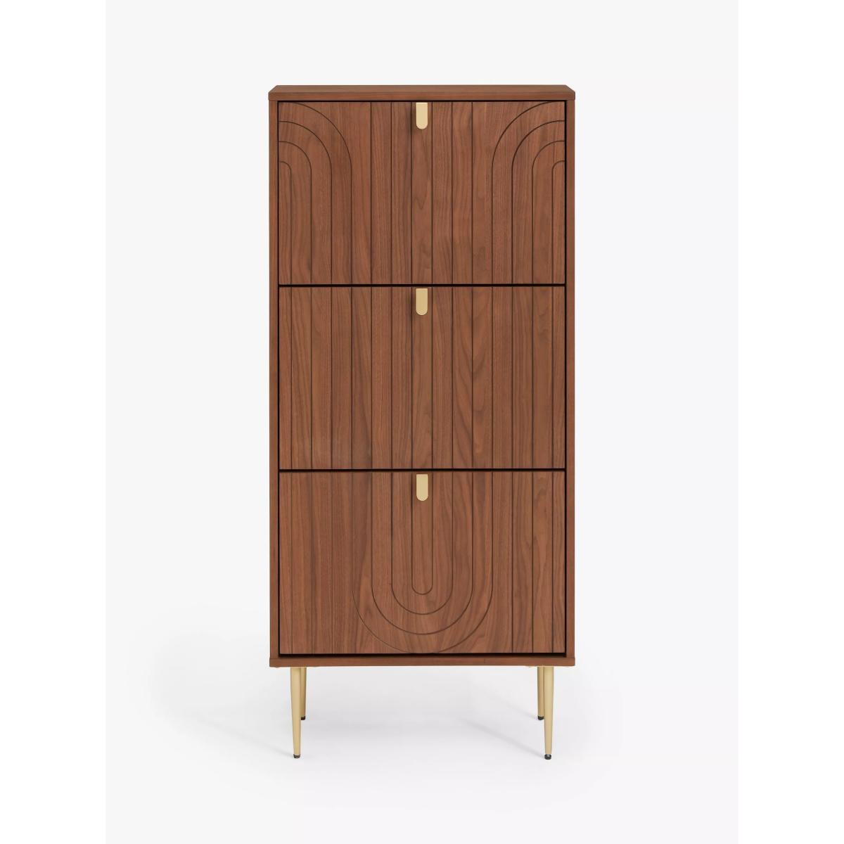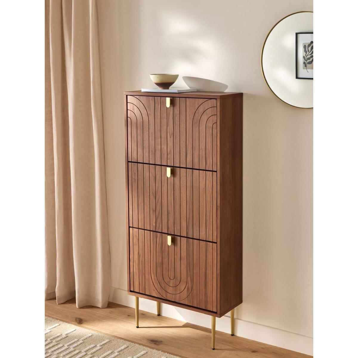 Our Harvard range of furniture combines Art-Deco style with modern shapes to inject character into your space. This tall shoe storage unit is made from MDF and walnut veneers and features three pull-out compartments. We love the fluid pattern inset on the door fronts, as well as the gold finish handles and tapered legs, all of which add to its sleek look. Want to see it first? You may want to see and get a feel for the furniture in one of our shops before ordering. We'll be able to tell you where the range you'd like to view is on display.