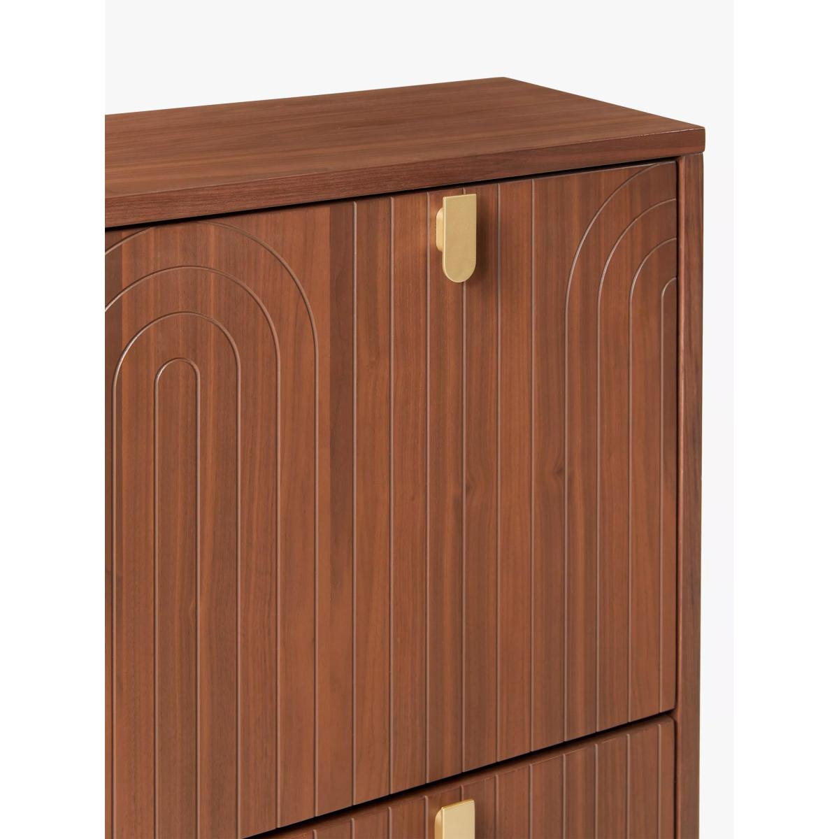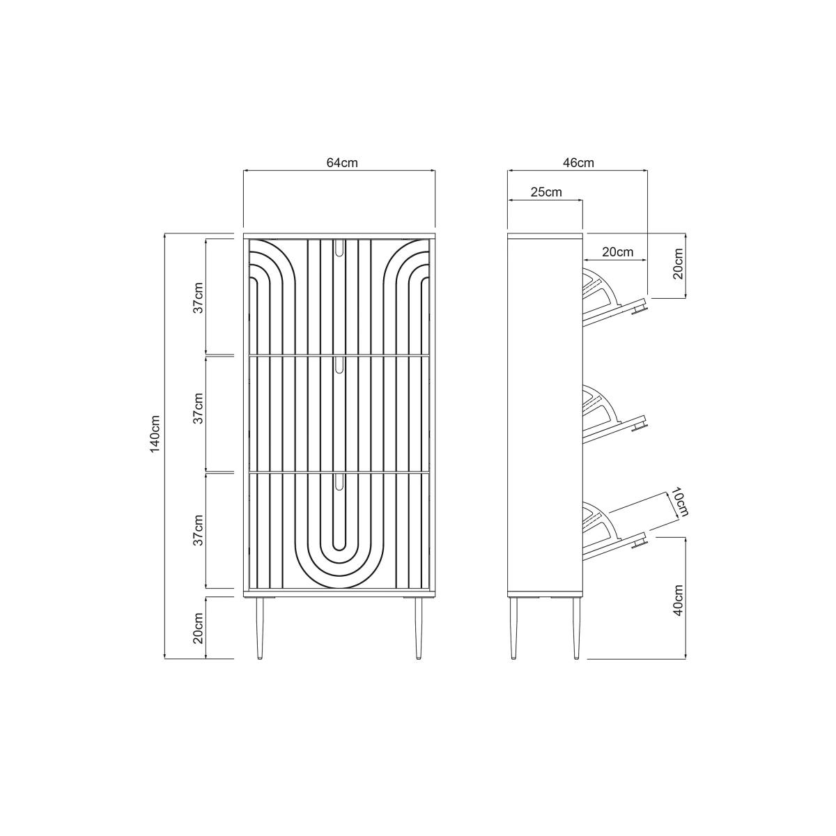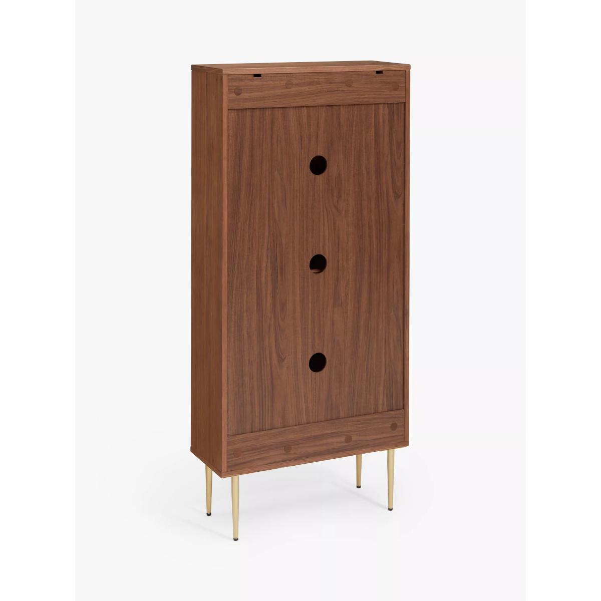 Our Harvard range of furniture combines Art-Deco style with modern shapes to inject character into your space. This tall shoe storage unit is made from MDF and walnut veneers and features three pull-out compartments. We love the fluid pattern inset on the door fronts, as well as the gold finish handles and tapered legs, all of which add to its sleek look. Want to see it first? You may want to see and get a feel for the furniture in one of our shops before ordering. We'll be able to tell you where the range you'd like to view is on display.